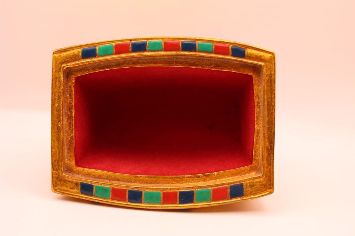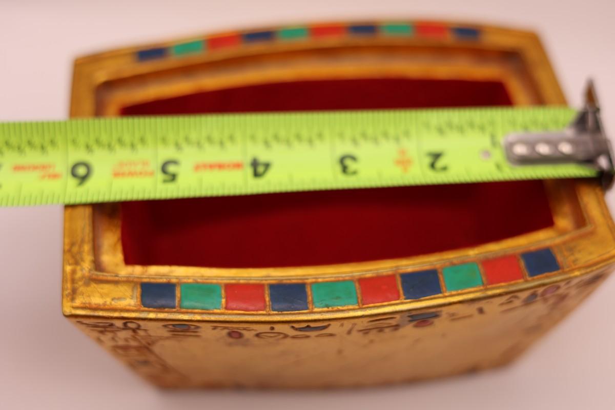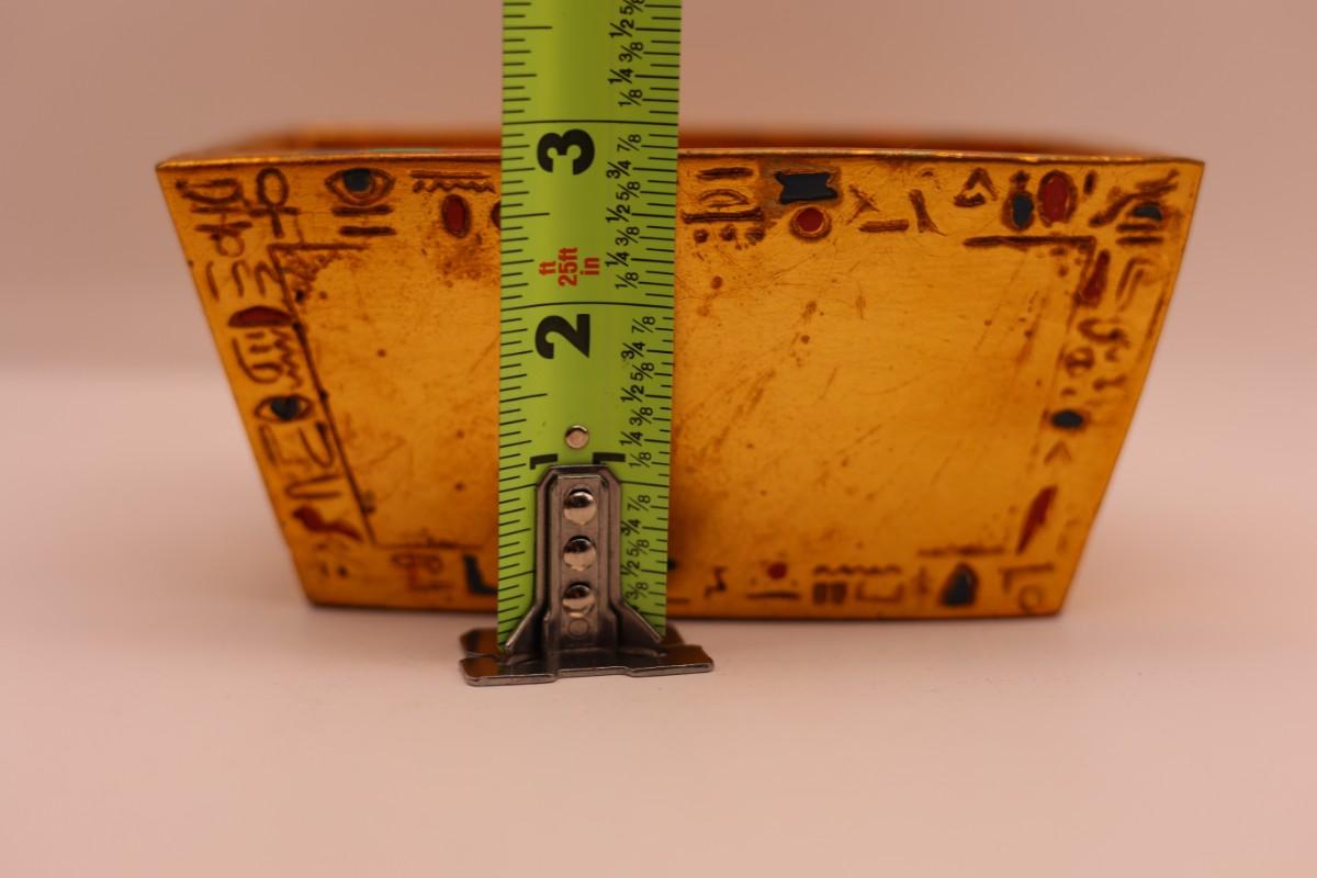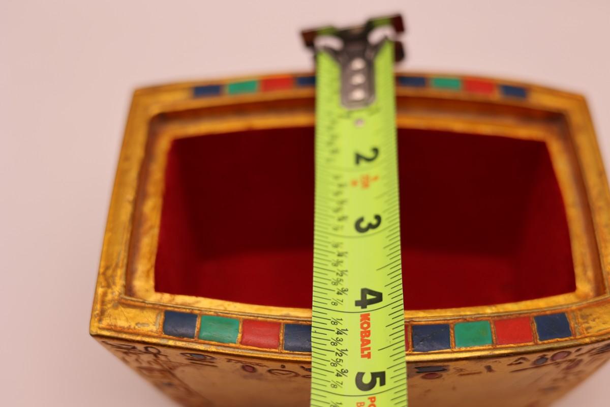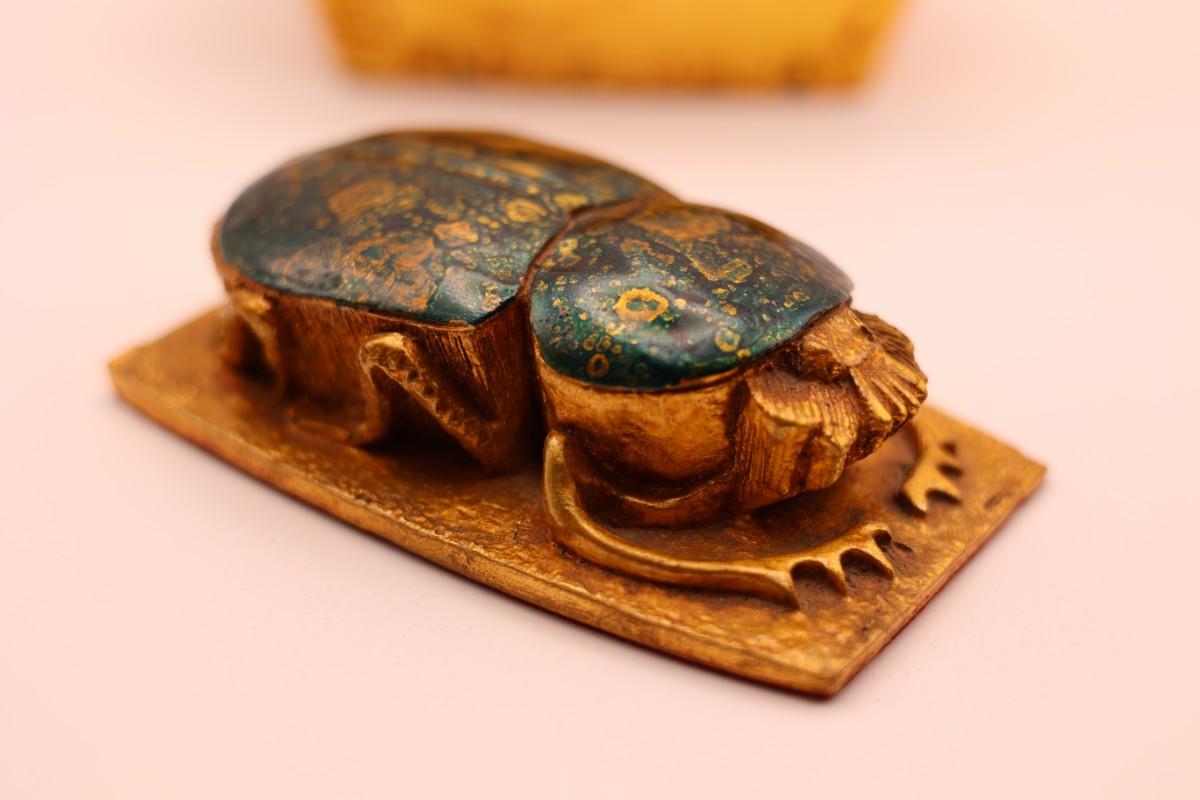 Decorative box with removable scarab lid, Egyptian-style motifs and gold-tone finish. Marked Artisan Guild International (ACI), Huntington Park, CA on base. Felted bottom. Light surface wear consistent with normal use.