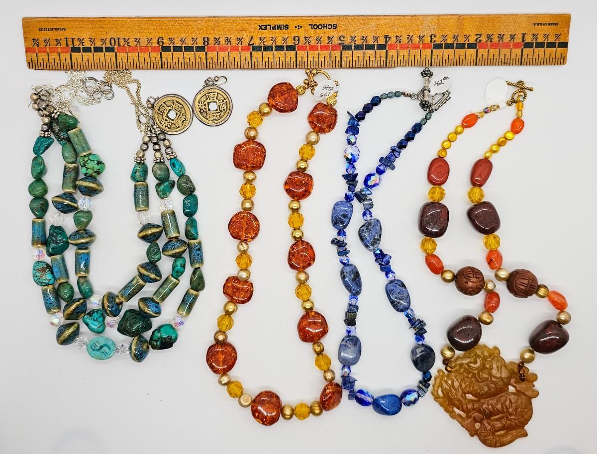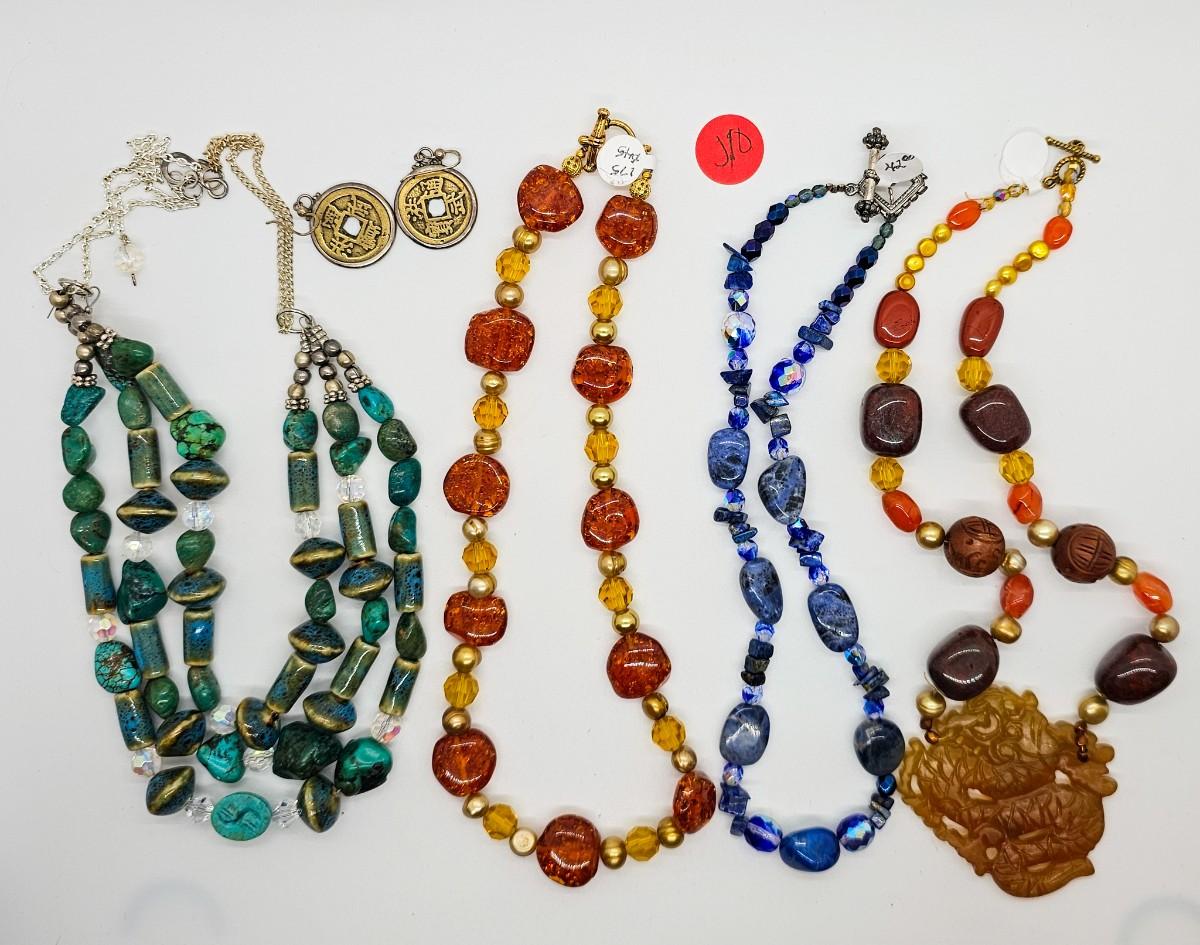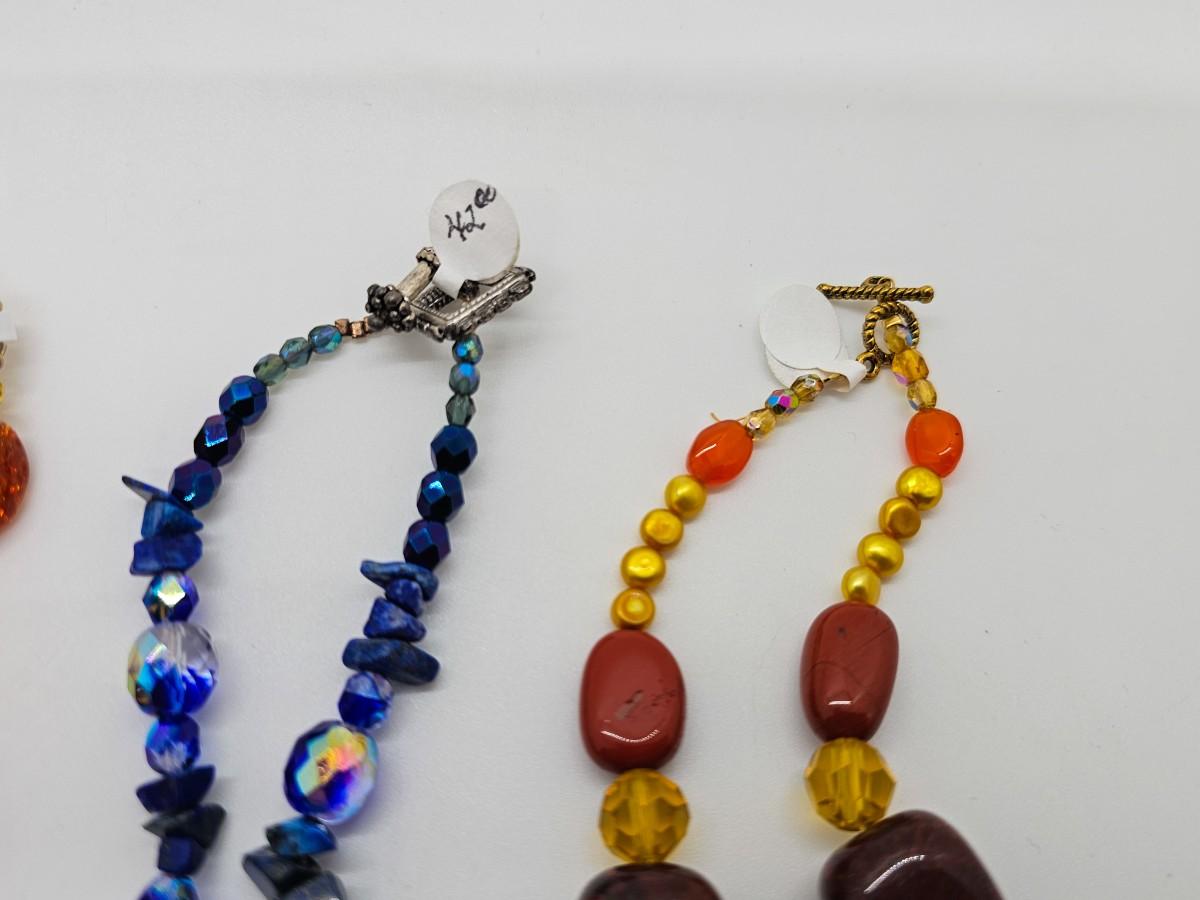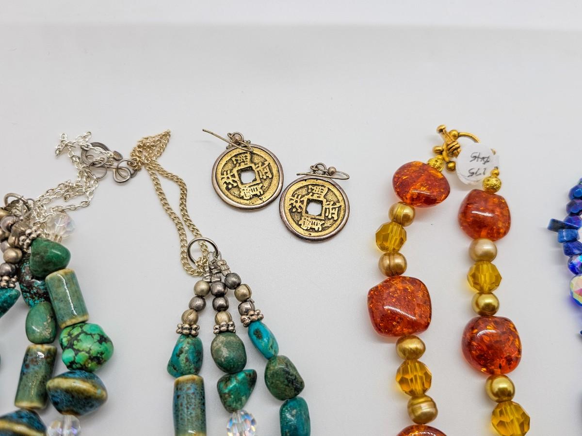 Artisan jewelry, made using various semi-precious stones and synthetic materials. Jewelry lots are stored in plastic bags and may be tangled.