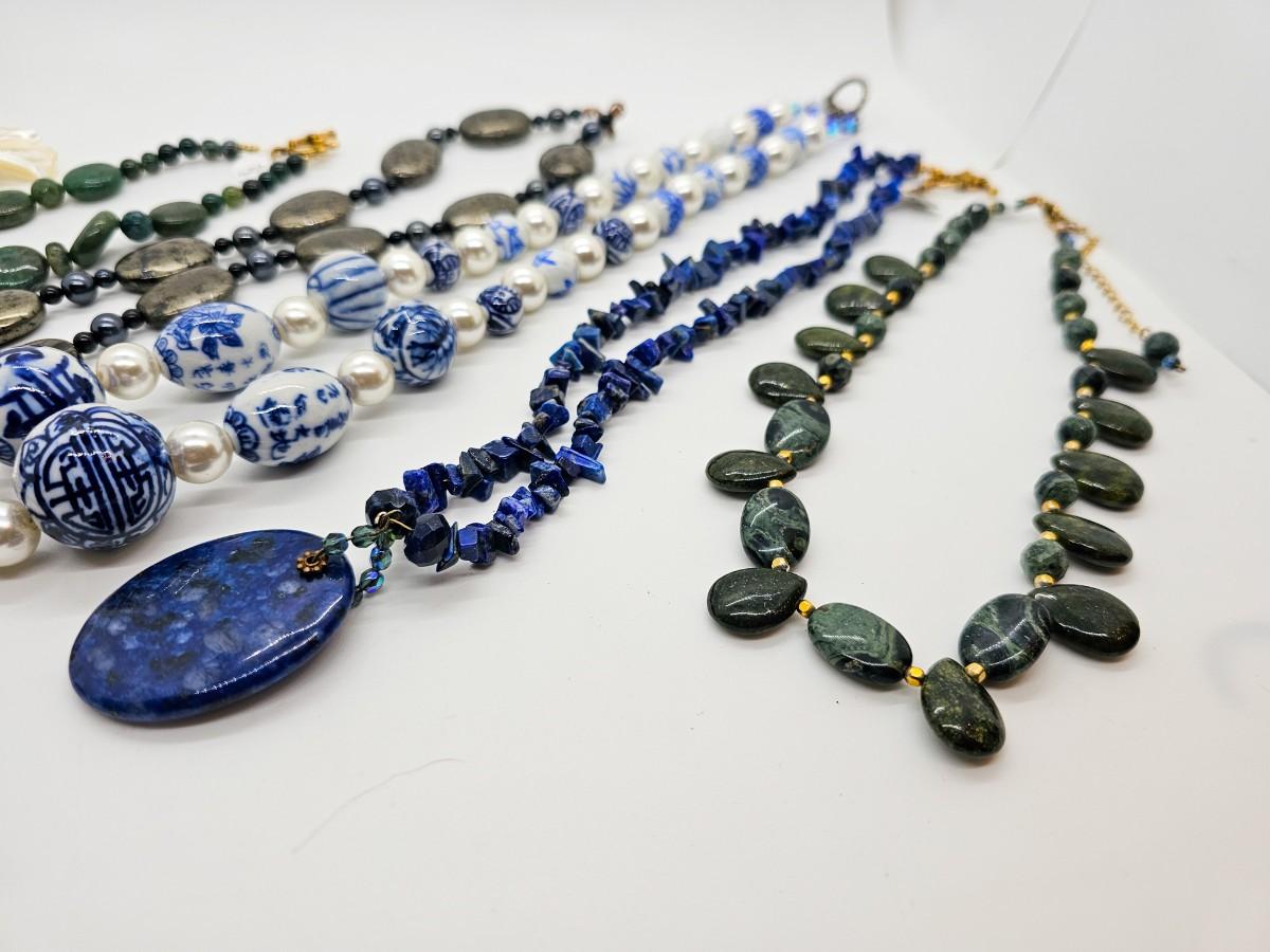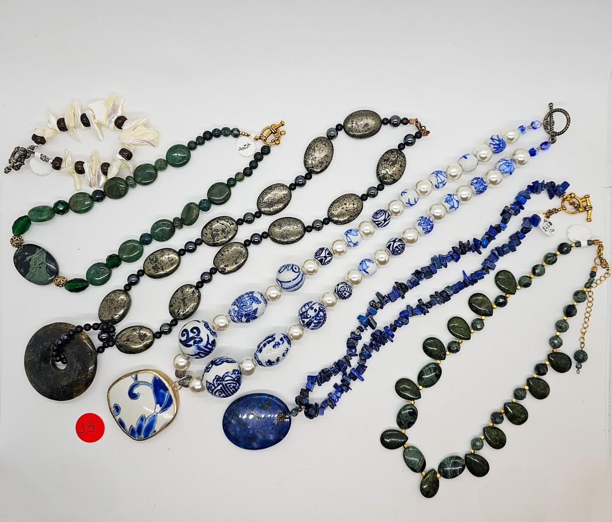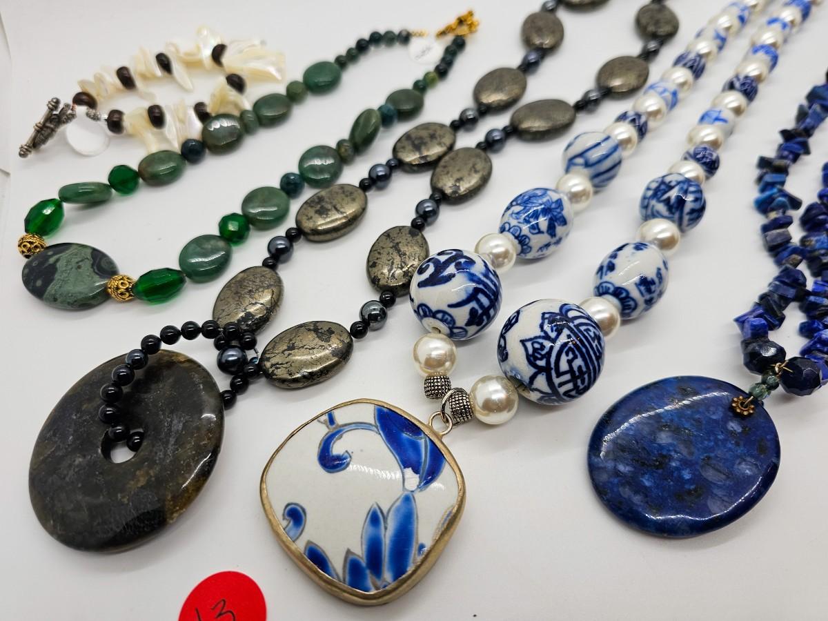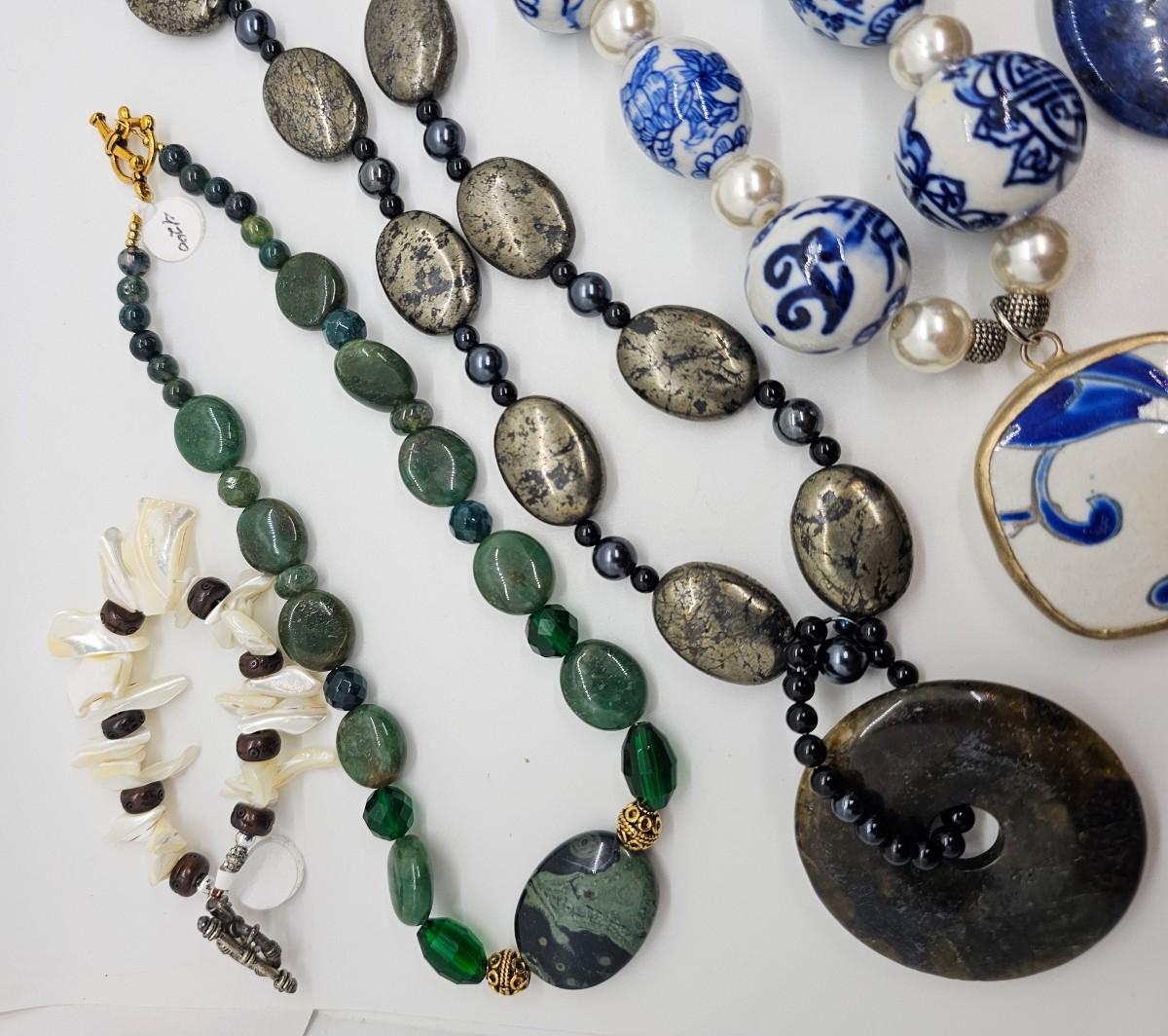 Artisan jewelry, made using various semi-precious stones and synthetic materials. Jewelry lots are stored in plastic bags and may be tangled.
