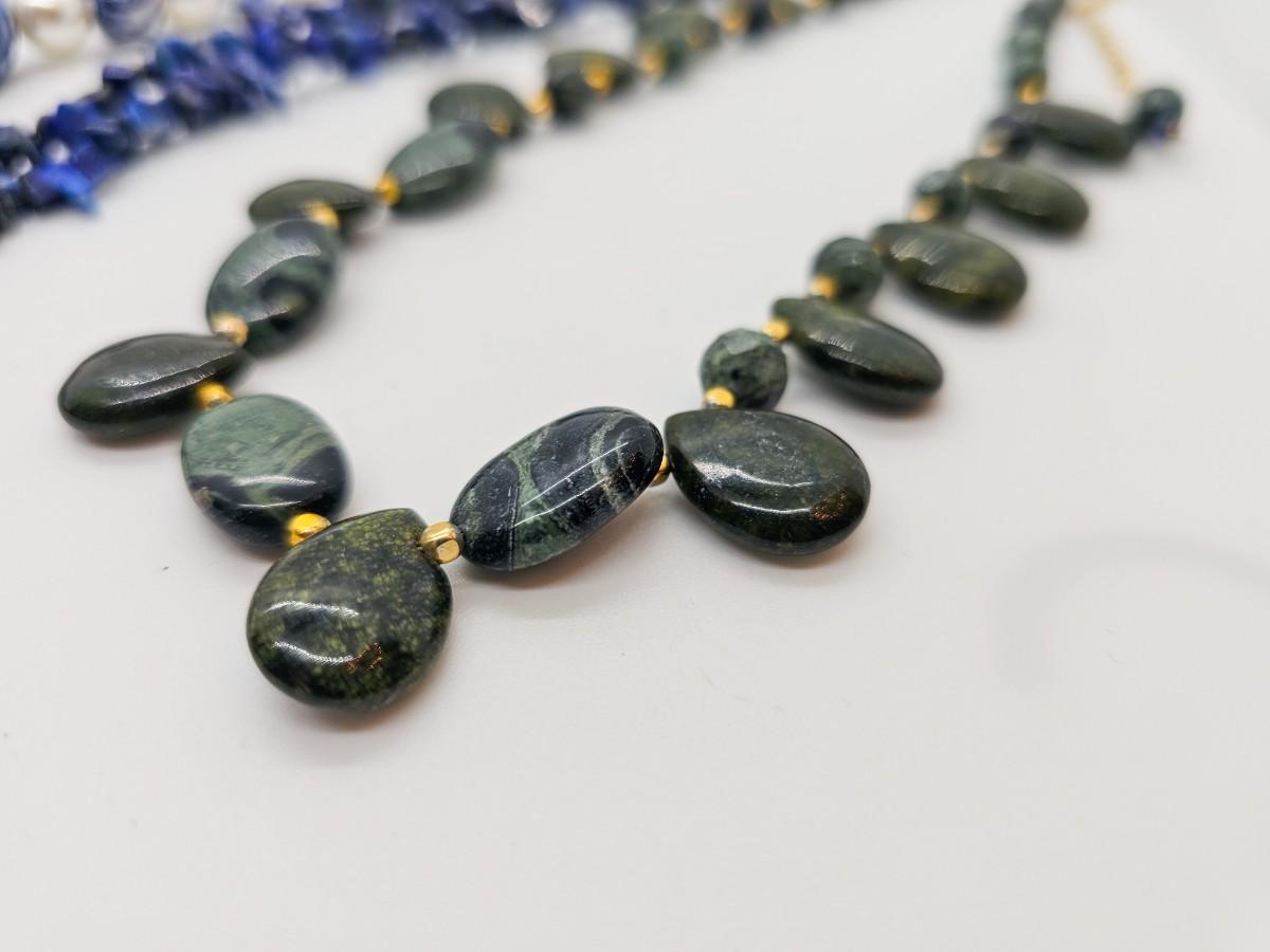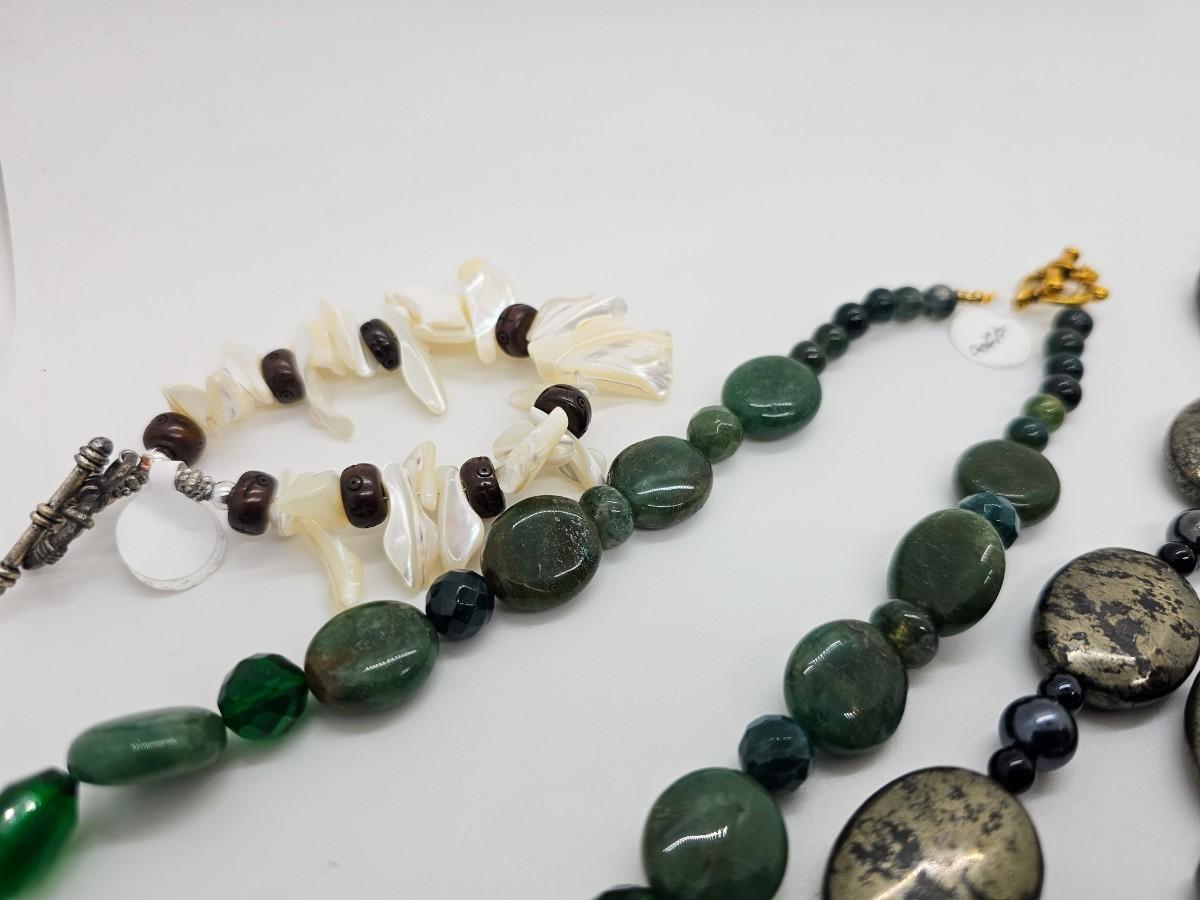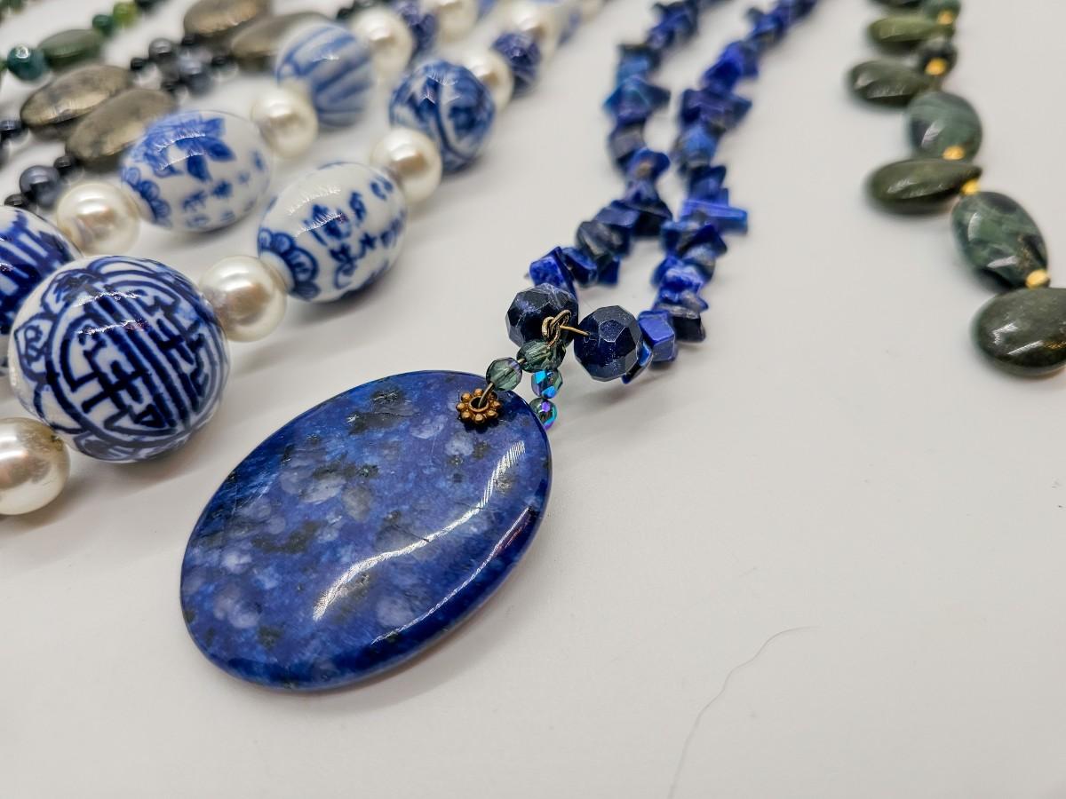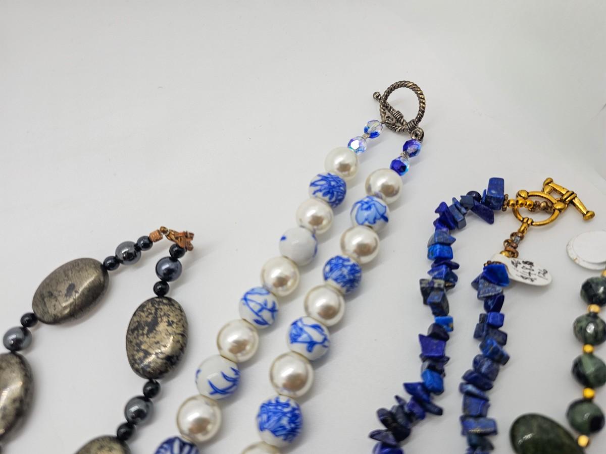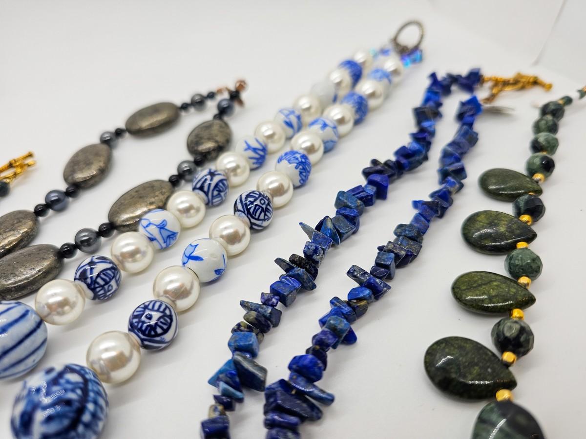 Artisan jewelry, made using various semi-precious stones and synthetic materials. Jewelry lots are stored in plastic bags and may be tangled.