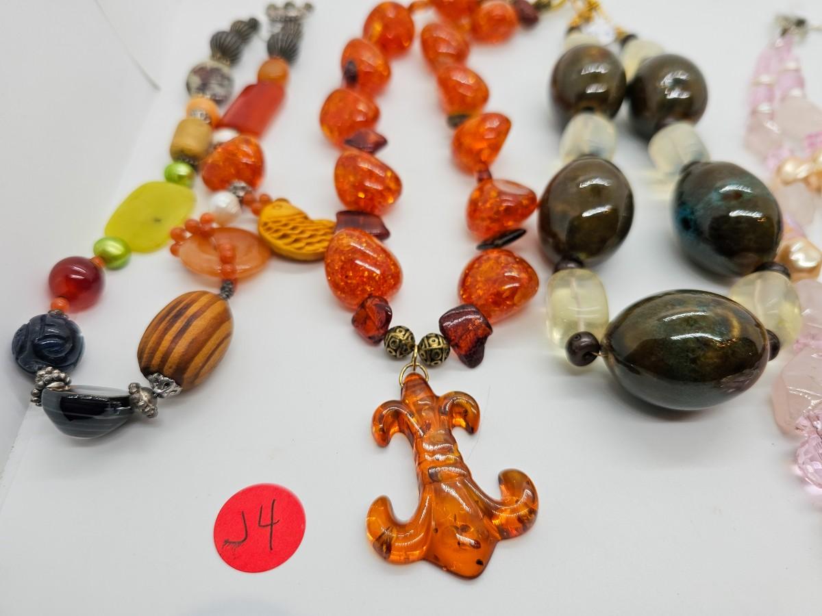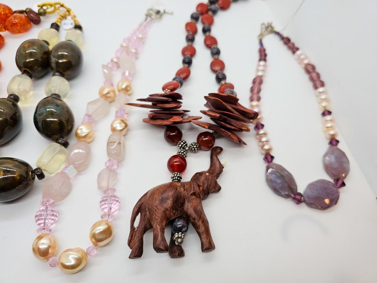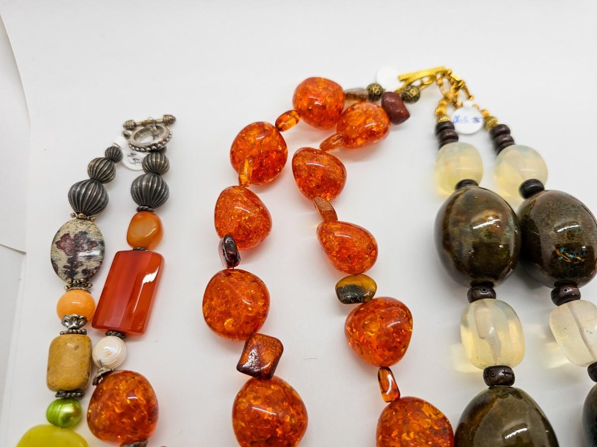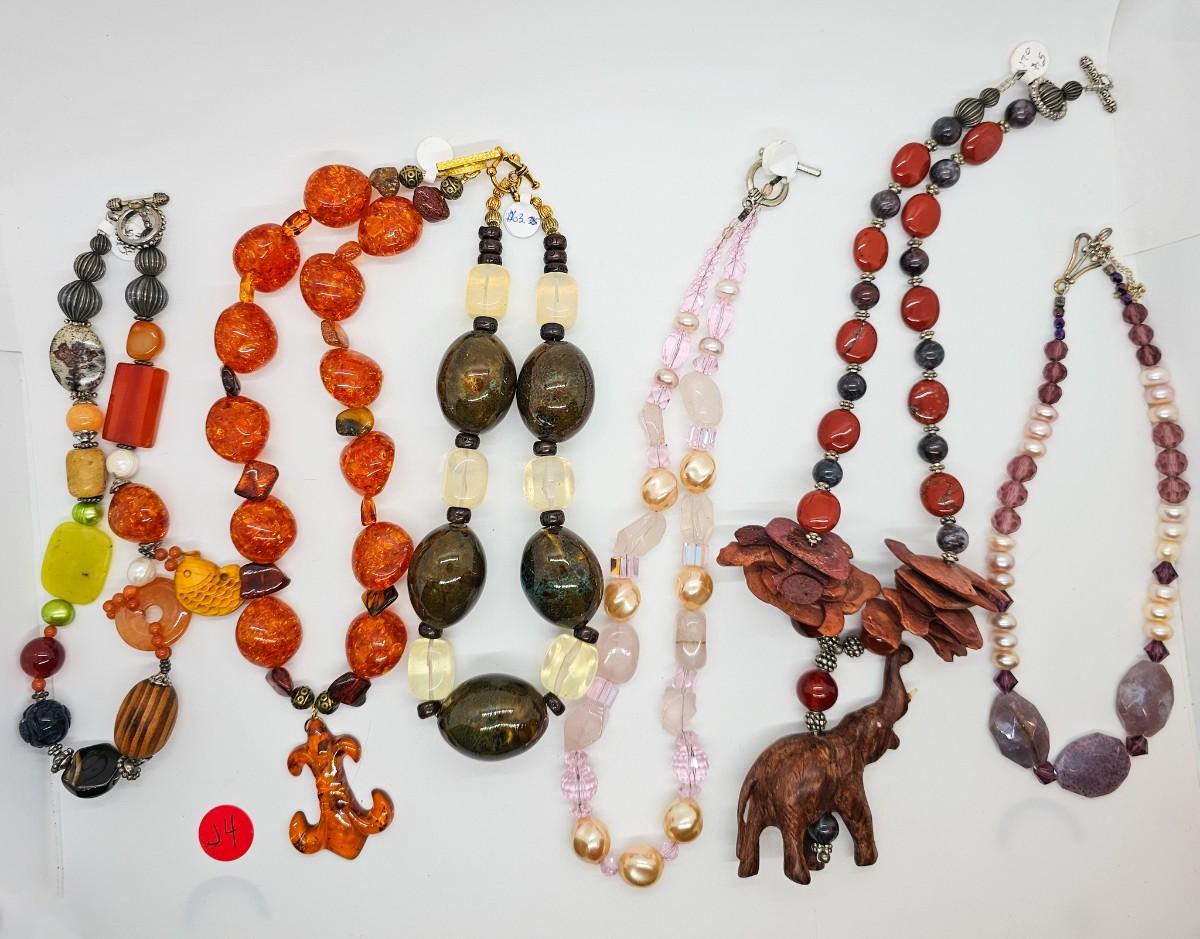 Artisan jewelry, made using various semi-precious stones and synthetic materials. Jewelry lots are stored in plastic bags and may be tangled.