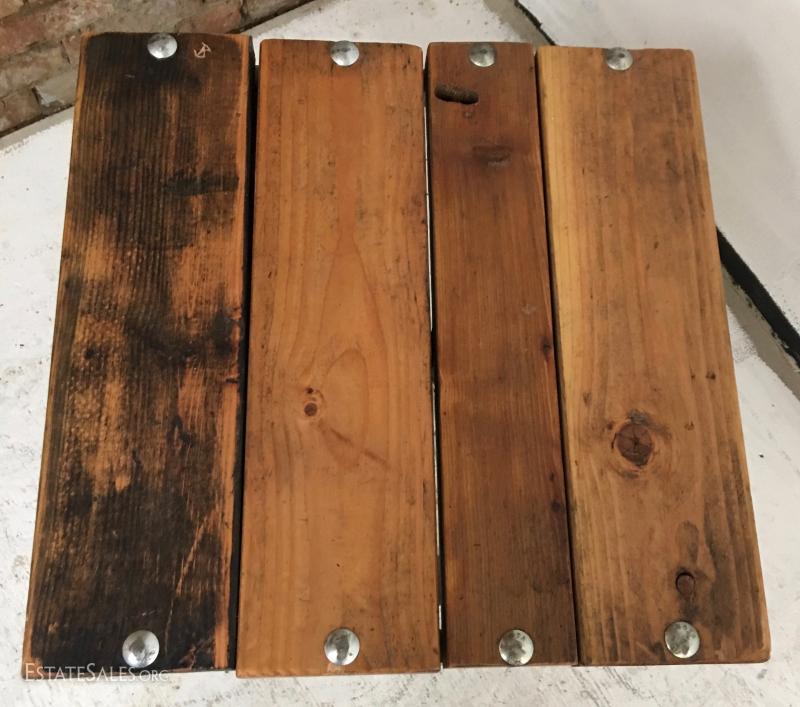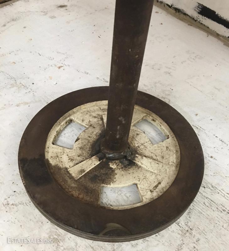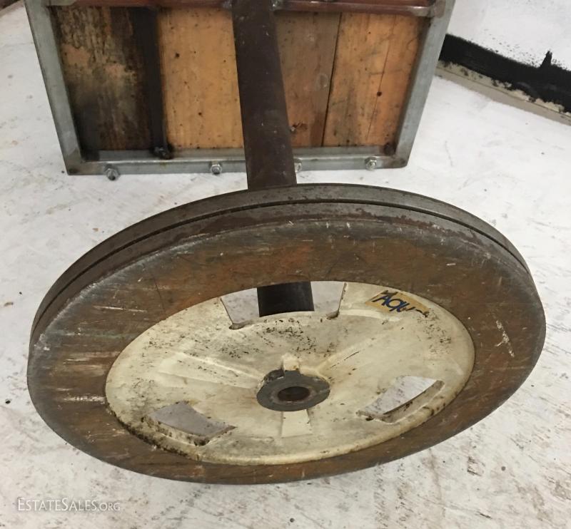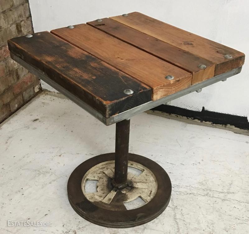 Table has an old machine flywheel as a base, redwood top bolted on a steel frame. 20" square and 23" tall. Sold as -is, Please do not hit the buy button unless you intend to pay for the item. Please look at the pictures associated with an item before bidding; the pictures are part of the description. I am willing to negotiate price on this item contact me with an offer. Shipping available in the US.