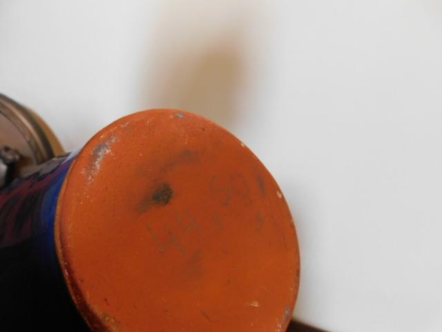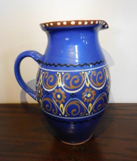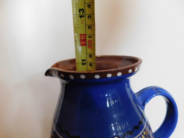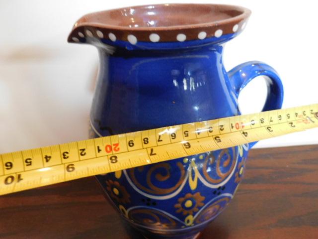 Artisan Red Clay High Glaze Blue Finish Hand Painted Water Pitcher 11"x8" great condition nice finish with primitive hand painted floral design.