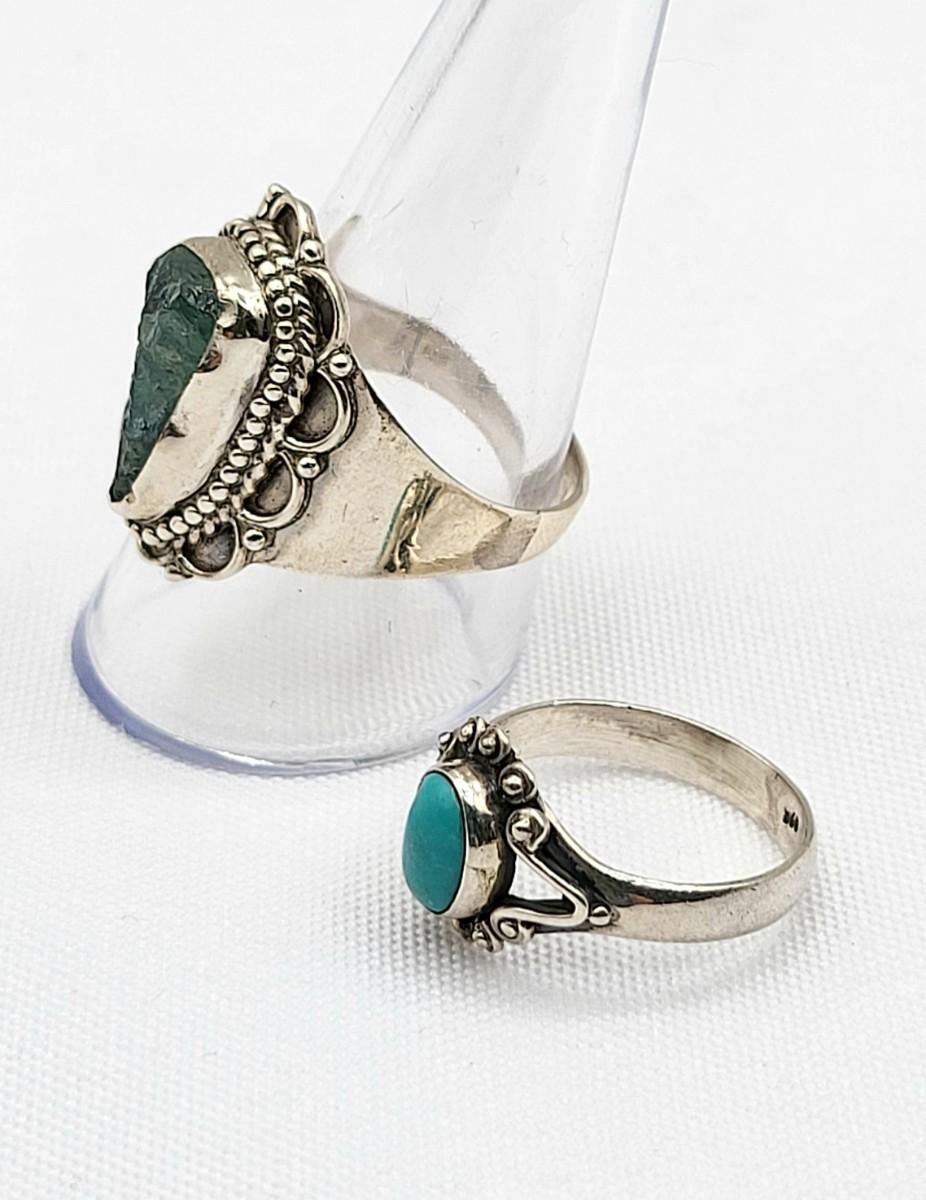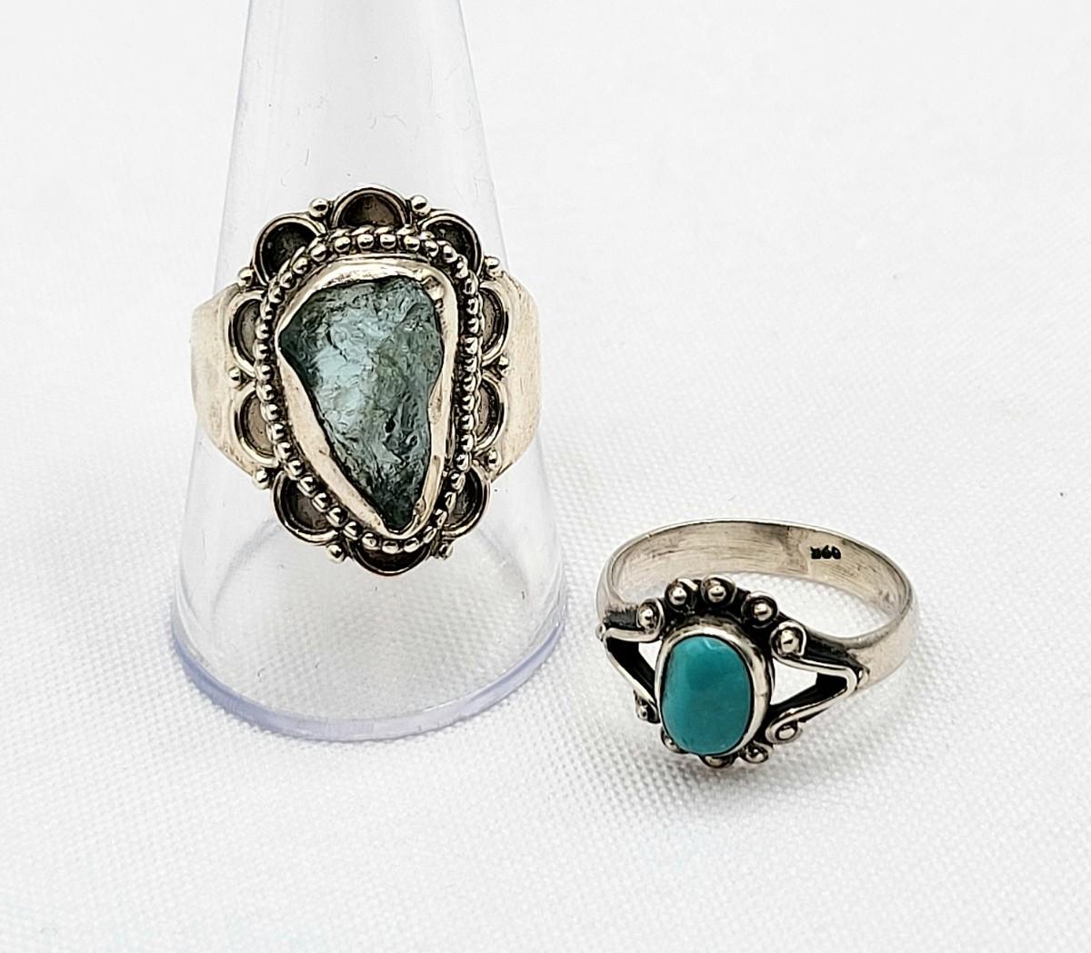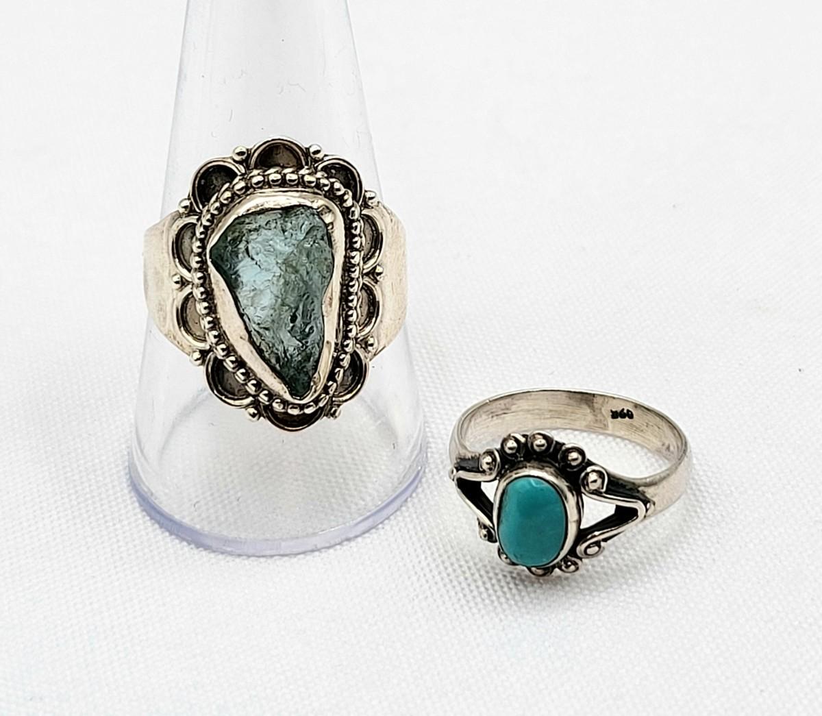 Hand made light blue Tourmaline 'inthe rough' ring, stamped 925 and is a size 10. Very comfortable on finger. OOAK artisan forged ring. Petite, oval cabochon Turquoise ring, size 5, 925 stamped. Total weight is 8.05 grams.