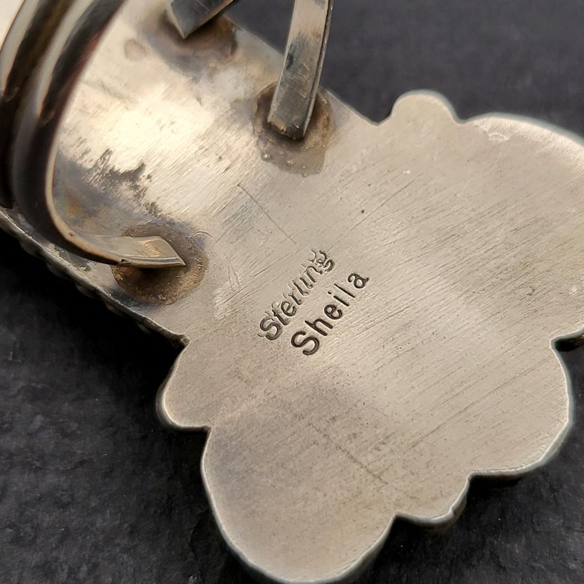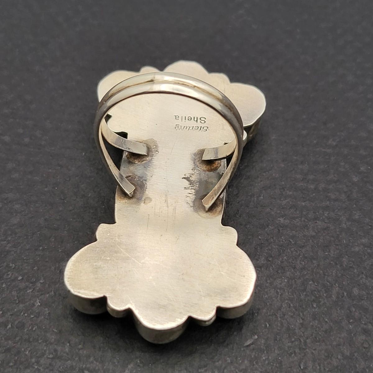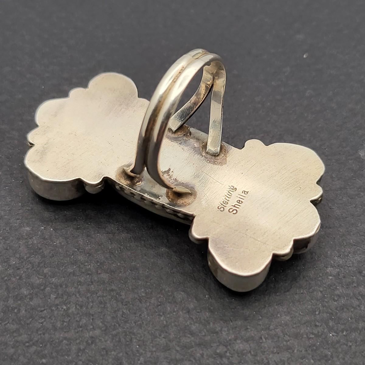Signed Sheila, Sterling. Center buffalo stone with three oval stones es on top and on bottom, crafting a unique design. 2" long x 1" wide, size 9.5.