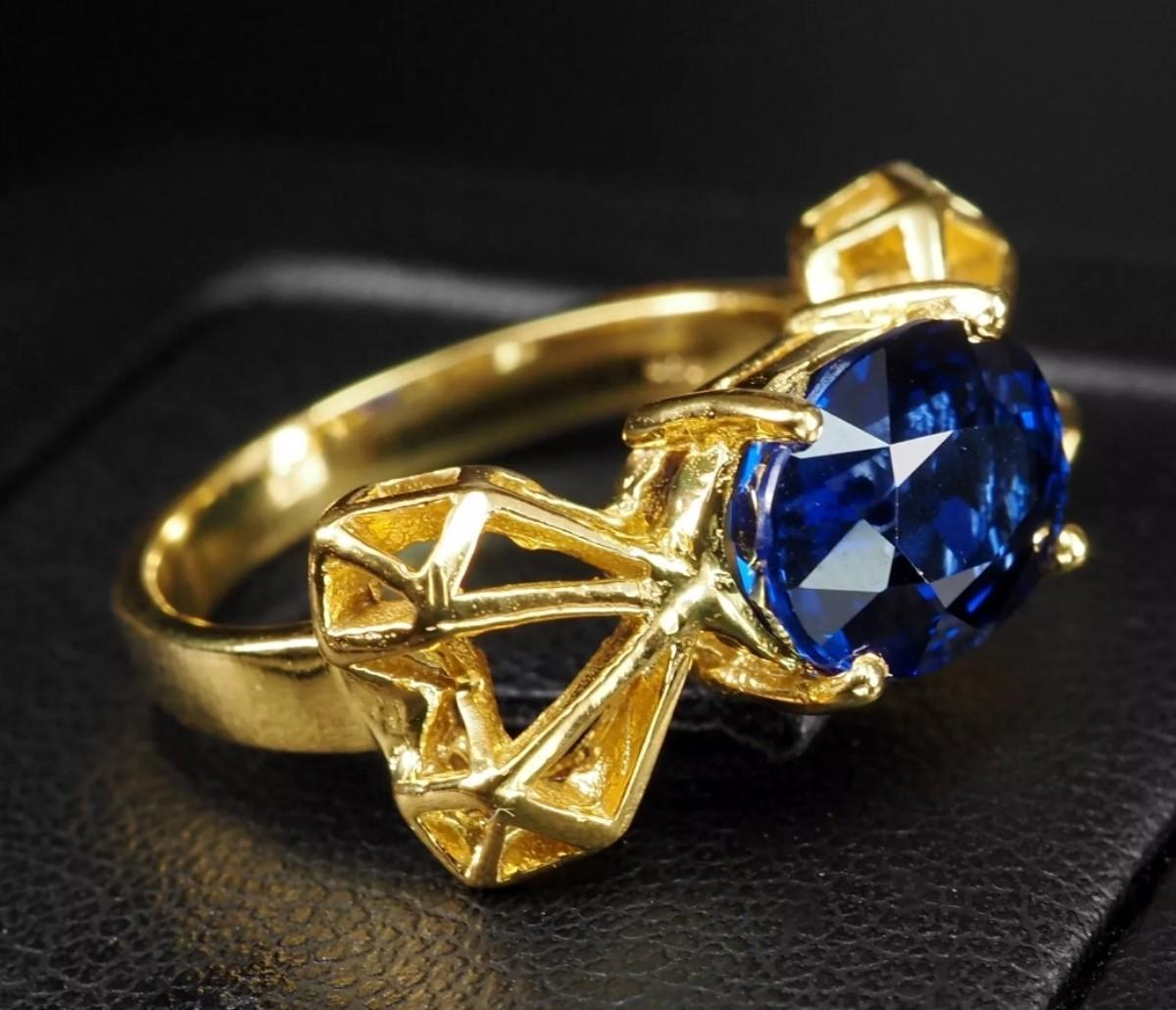 Artisanal Navy Sri Lanka Blue Sapphire 2.56Ct 925 Sterling Silver Gold Vermeil Handcrafted Ring