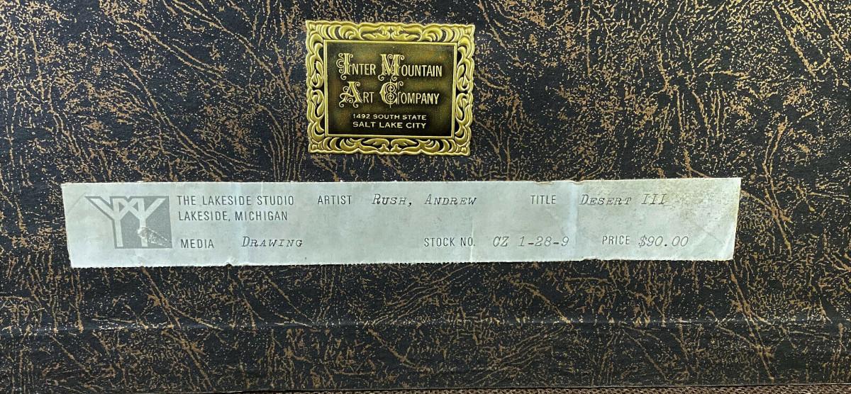 Andrew Rush, printmaker, painter, sculptor, and teacher, was born in 1931...Rush completed his undergraduate studies with printmaker Lee Chesney at the University of Illinois and received his Bachelor of Fine Arts degree with honors in 1953...studied printmaking with Mauricio Lasansky in the graduate program at the University of Iowa, earning his Master of Fine Arts degree in 1958. That same year he received a Fulbright Grant to study printmaking in Florence, Italy...Rush was also an Associate Professor of Art at the University of Arizona between 1959 and 1969, where he founded the printmaking program; and he was co-director of the Rockefeller Foundation7u8ndian Arts Project between 1960 and 1964. He has been a visiting artist or an artist-in-residence at Ohio State University, the University of Arkansas, and Colorado College...Contemporary artist Andrew Rush is the founder of The Drawing Studio. He's been an active member of the Rancho Linda Vista community in Oracle since its inception...Here is "DESERT III"...Unknown date? Perhaps while he was in Arizona?...Excellent condition...Frame size 27 x 22"...Image 19 x 13.75"...Framed in Utah..Purchased at Lakeside Studio in Michigan..Estate find...Offered with no reserve...