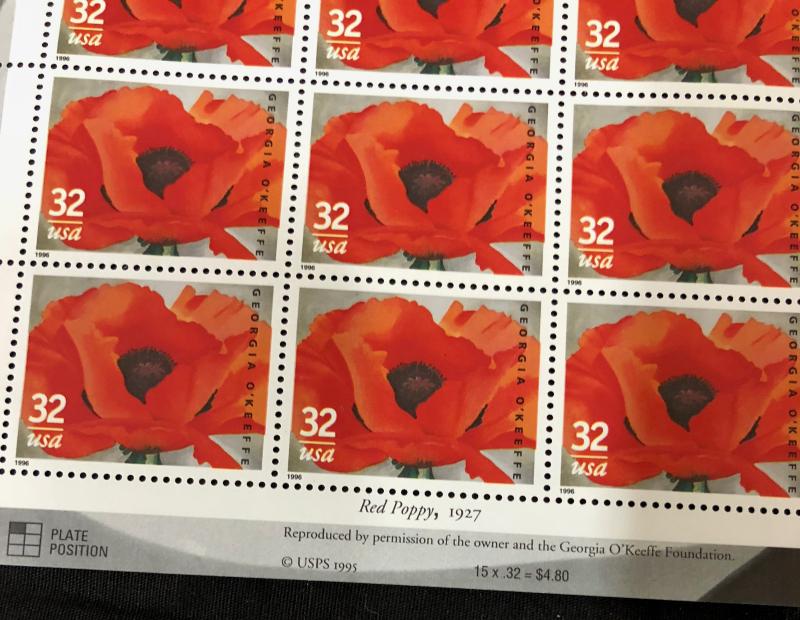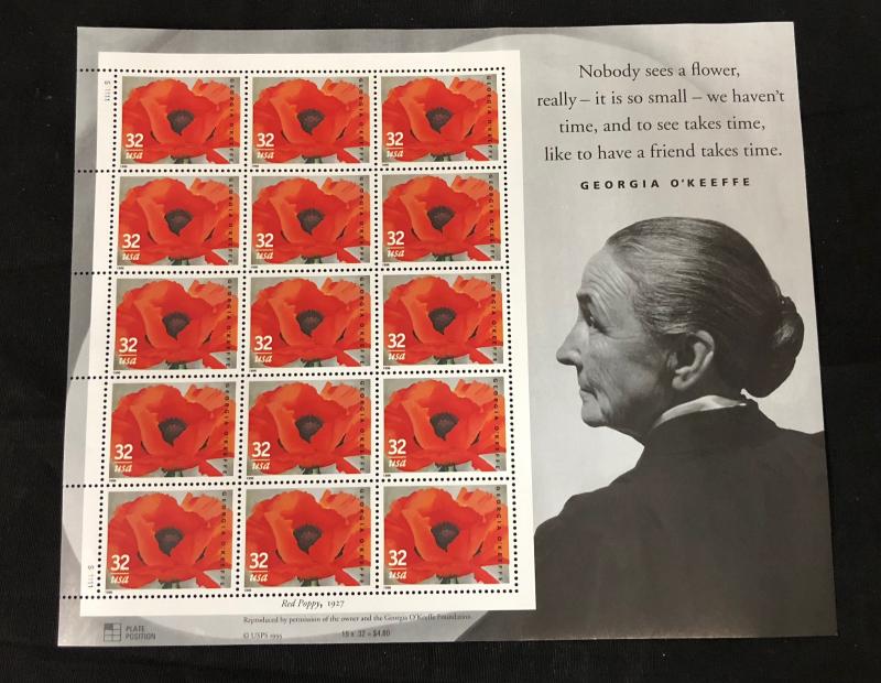 From 1995 here is a commemorative U.S. Stamp sheet for artist Georgia O'Keefe(1887-1986)...The painting is her "Red Poppy" from 1927...She was best known for her paintings of enlarged flowers, New York skyscrapers, and New Mexico landscapes...recognized as the "Mother of American modernism"...