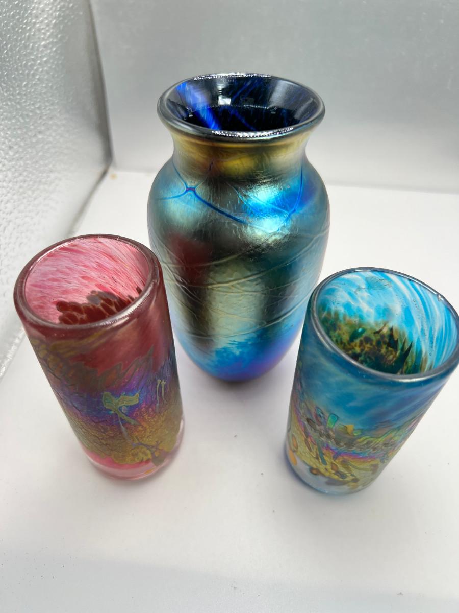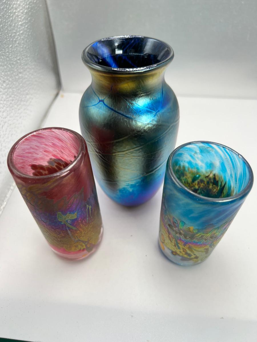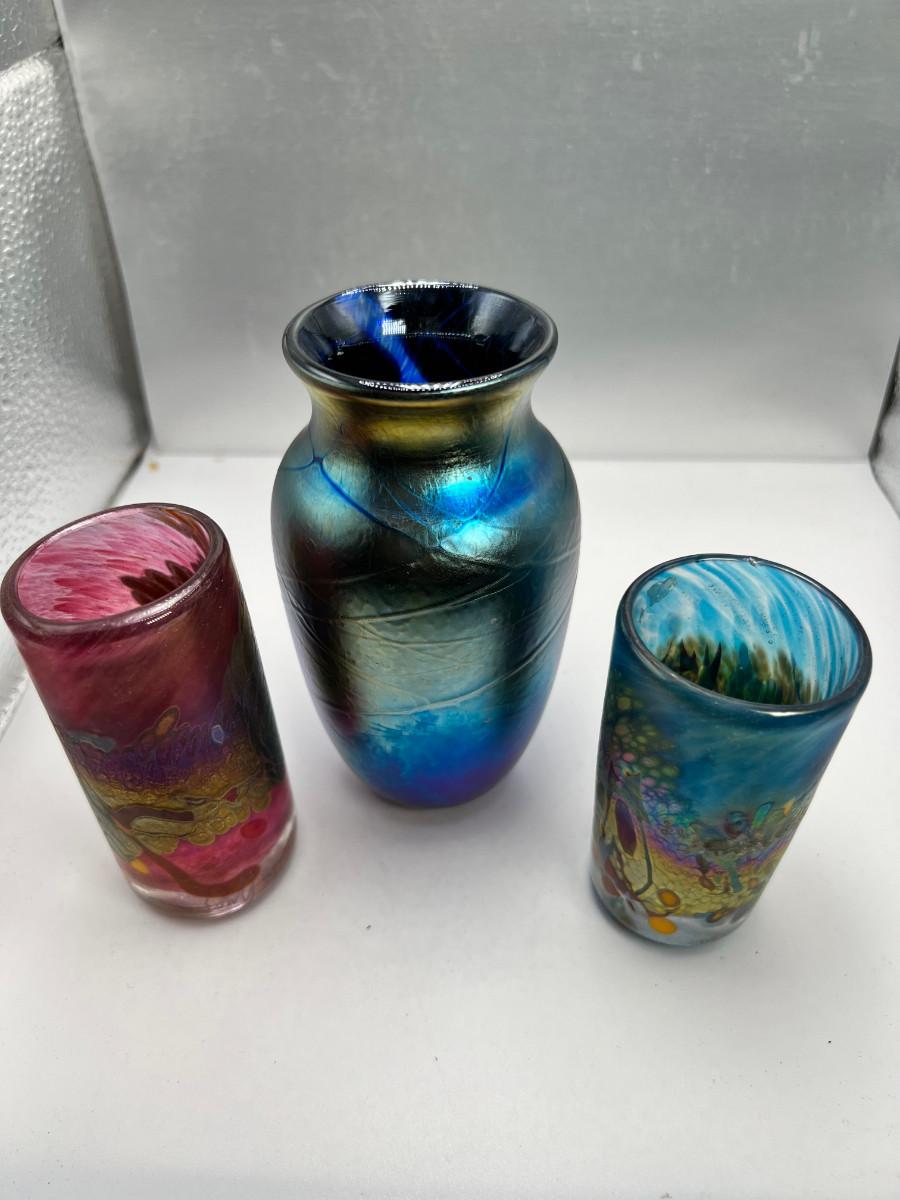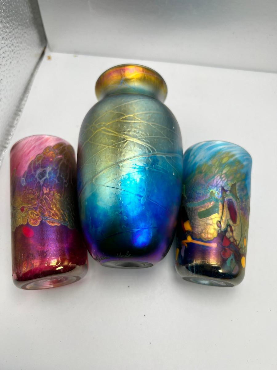 3 Iridescent Artist Hand Blown glass vessels with hallmark signature