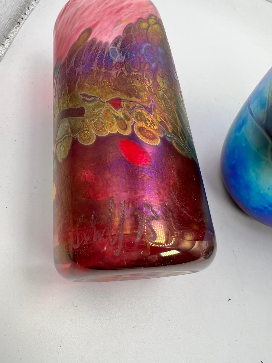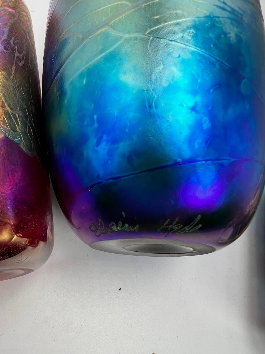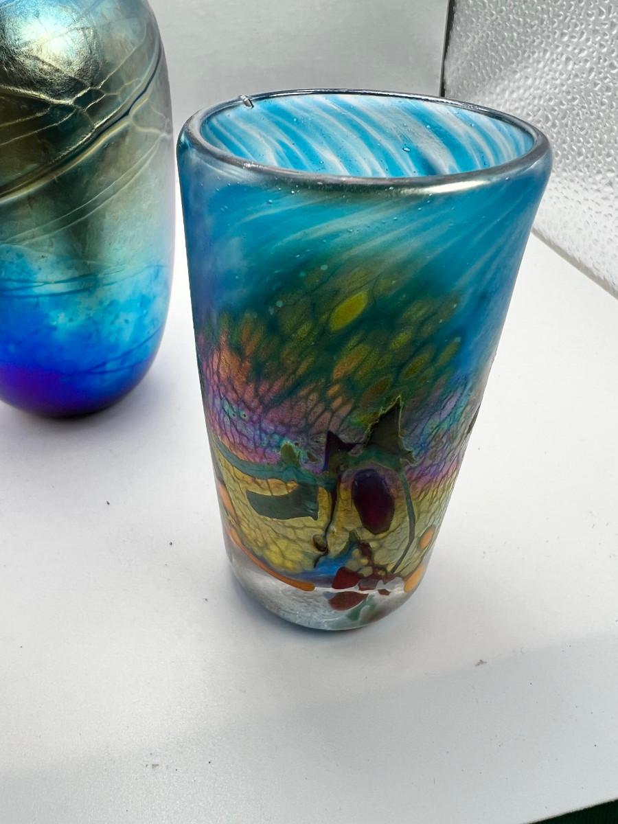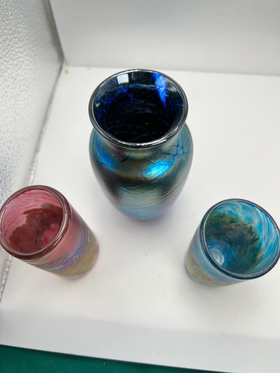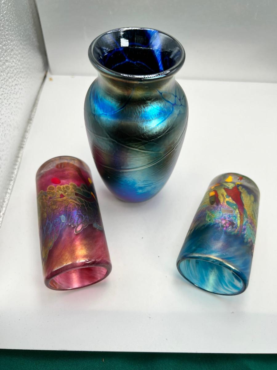 3 Iridescent Artist Hand Blown glass vessels with hallmark signature