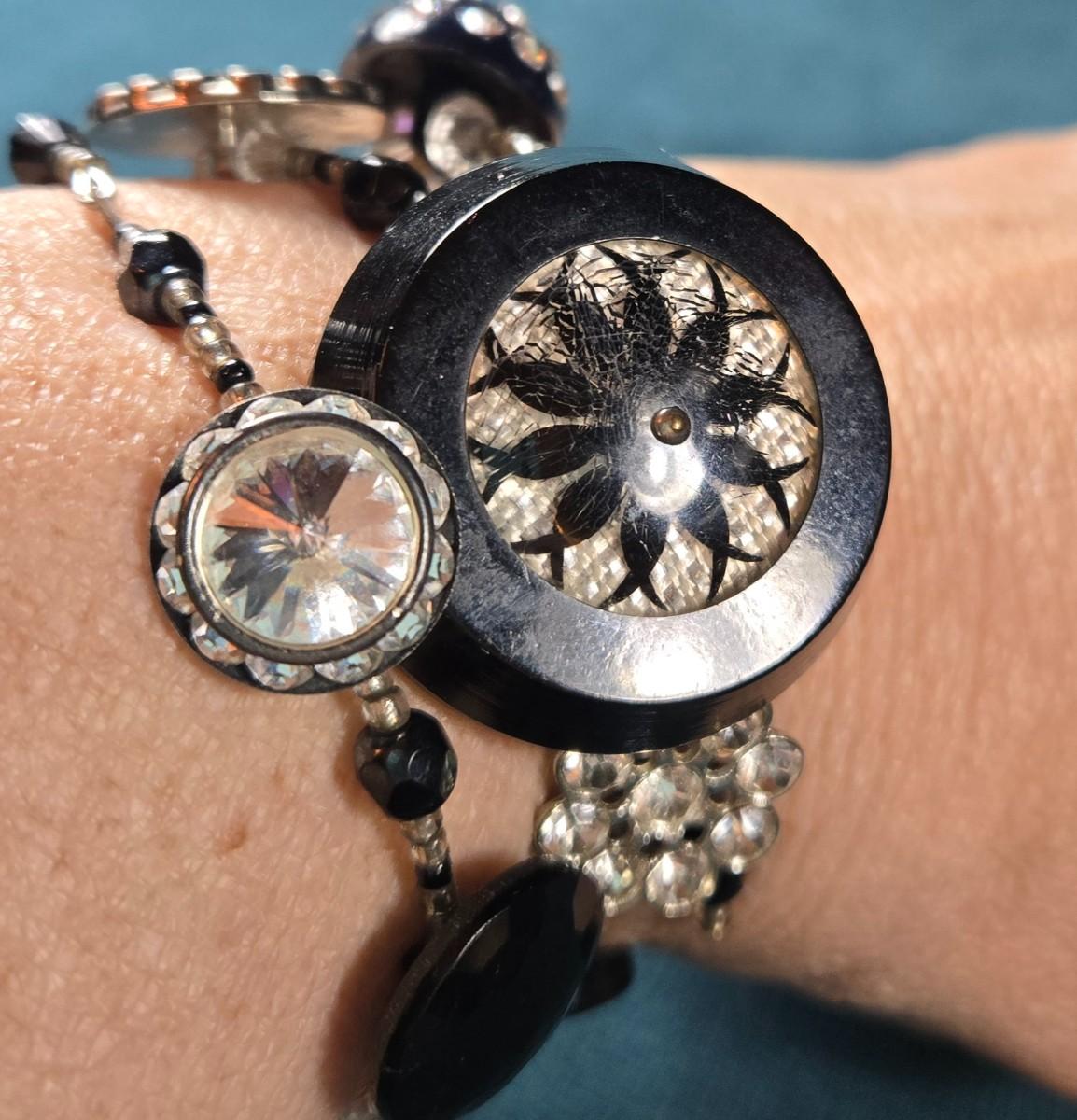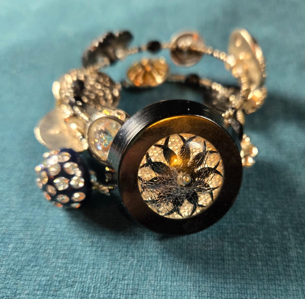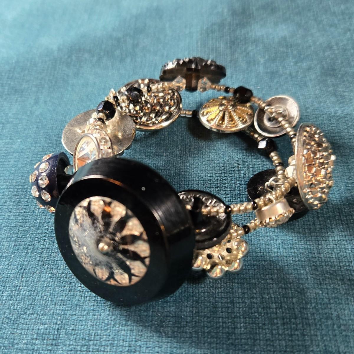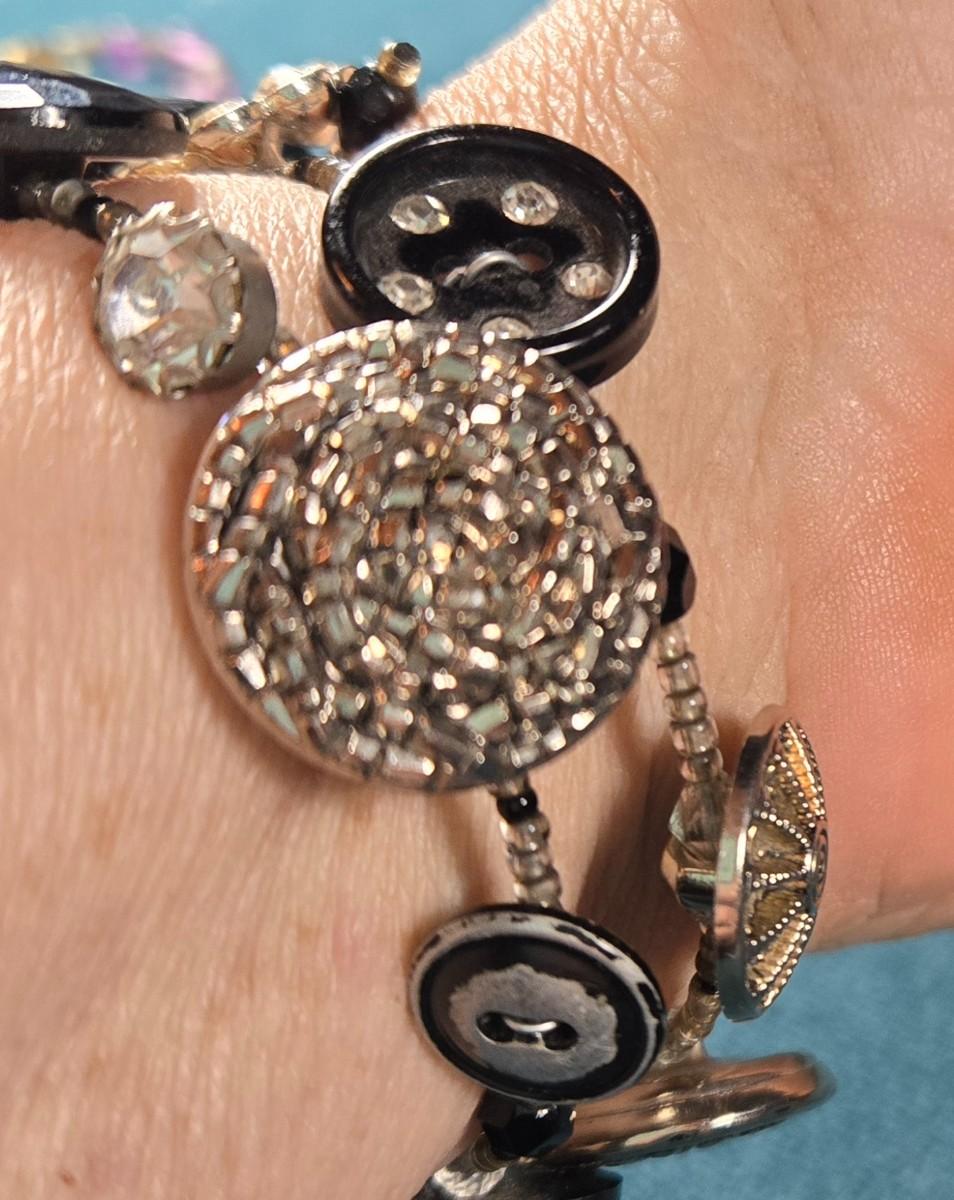 This lot is for an Artist Hand Made Antique Button Bracelet. This is a very unique Hand Made Antique Button Bracelet by a local artist from St. James Art Fair. It is a spiral wire design so it will fit anyone's wrist. The old buttons have a wonderful look. Very fun and showy.
