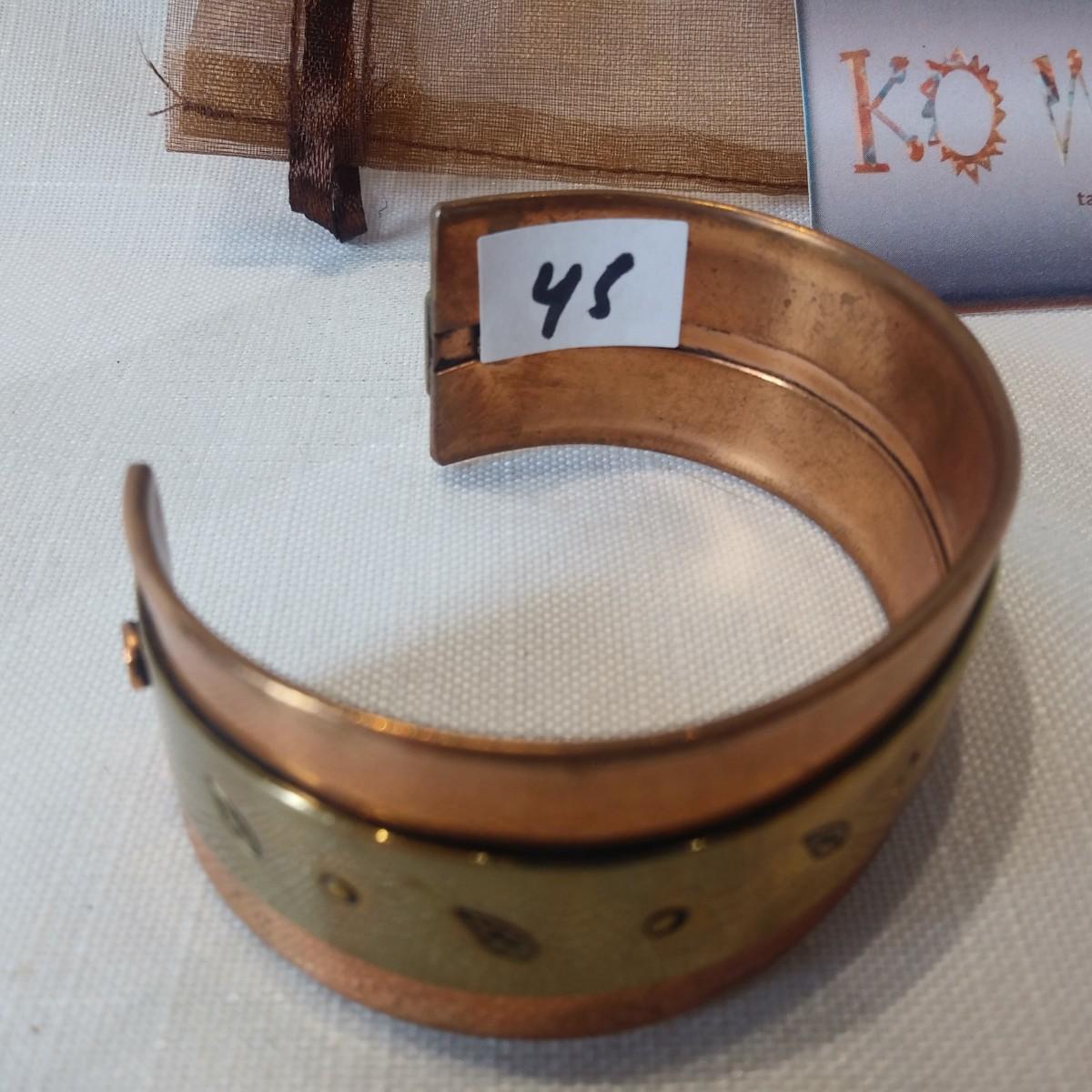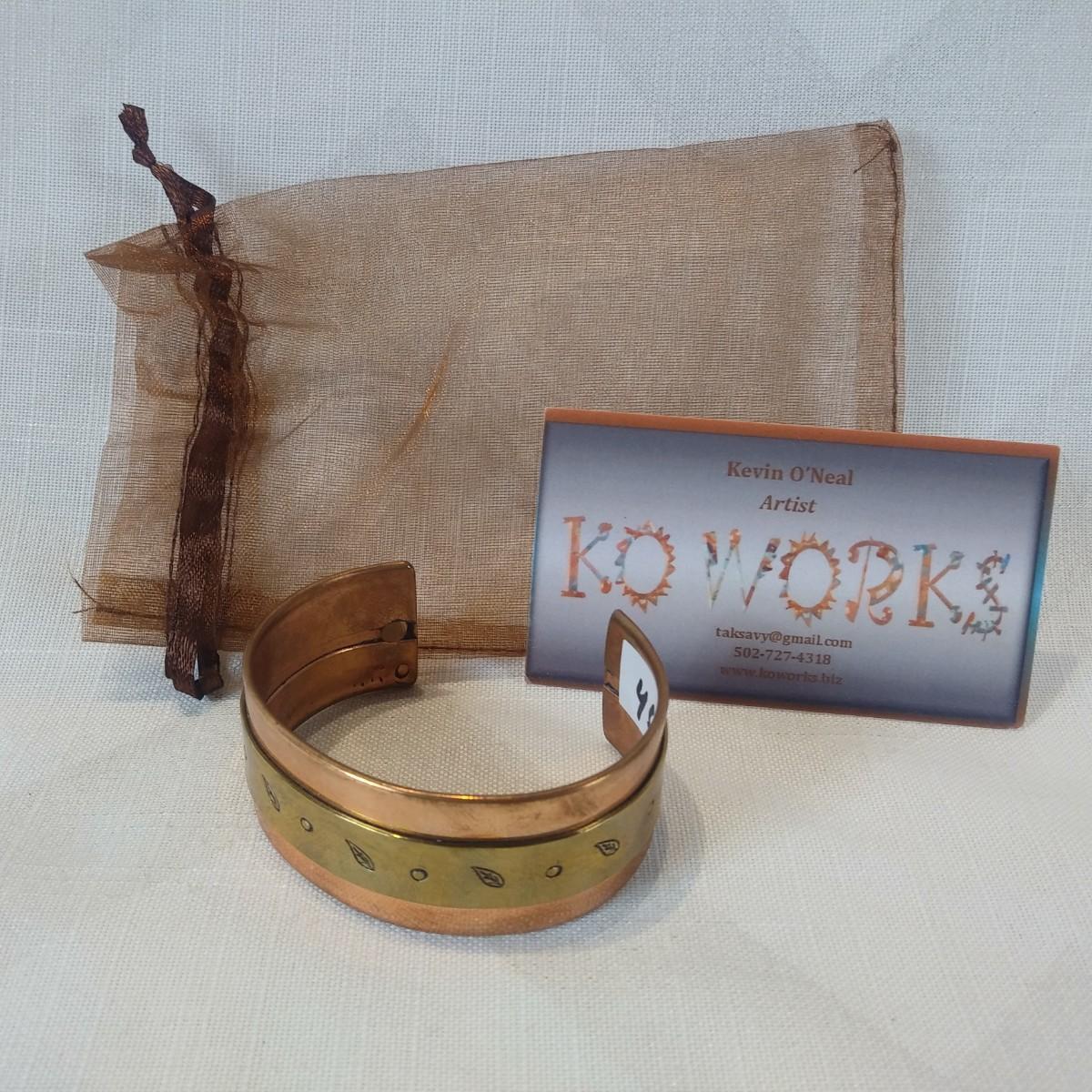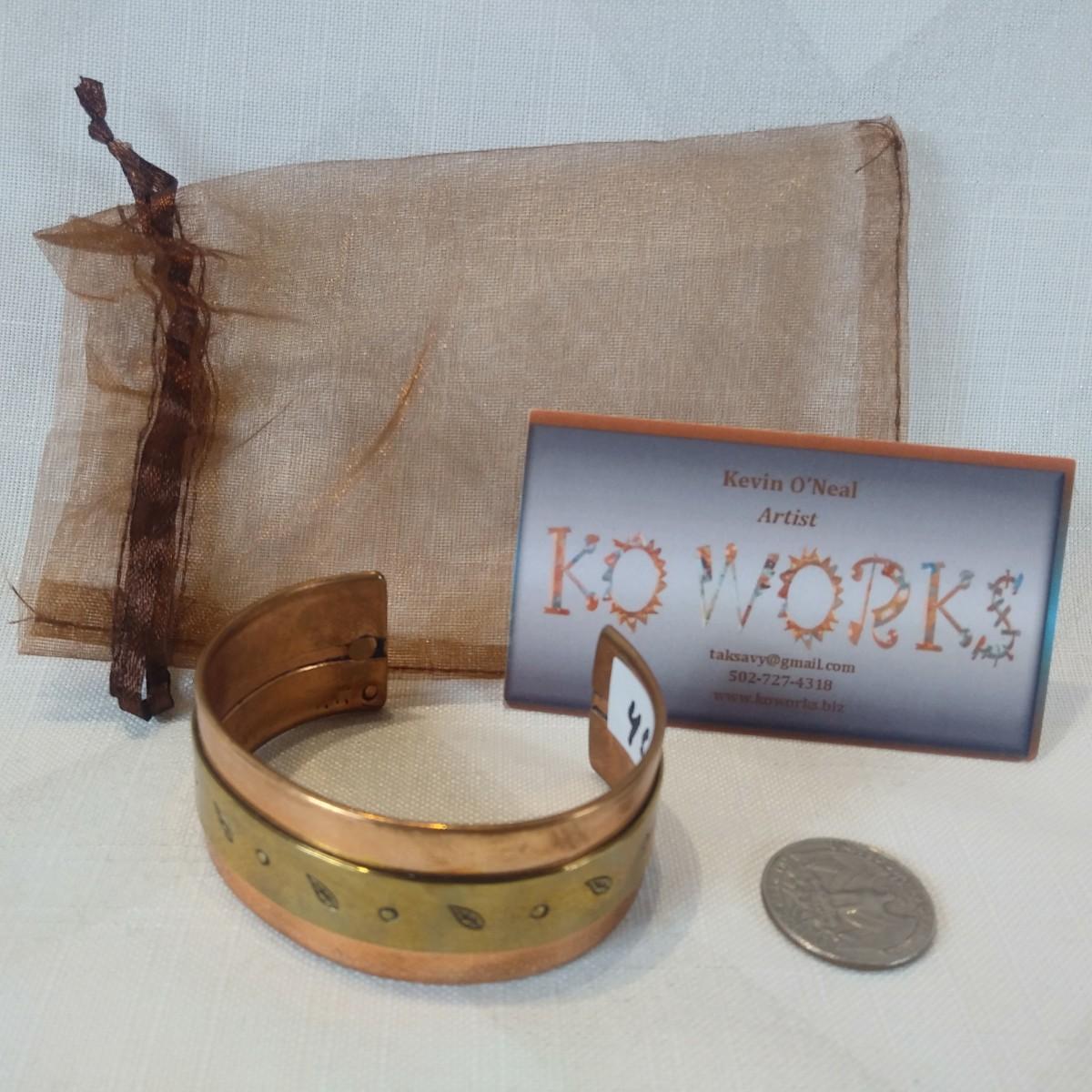 This auction lot is for an Artist Made Copper Cuff Bracelet. This bracelet was designed and made by copper jewelry artist Keven O'Neil from Louisville, KY. This copper cuff bracelet with brass accent makes quite a fashion statement.