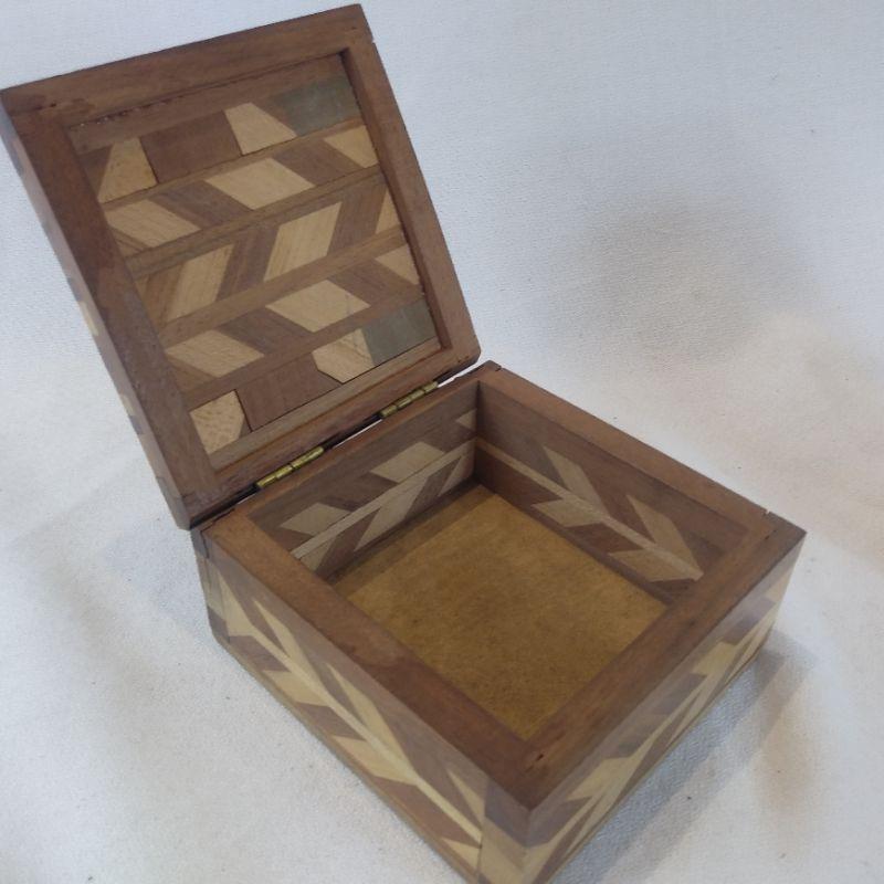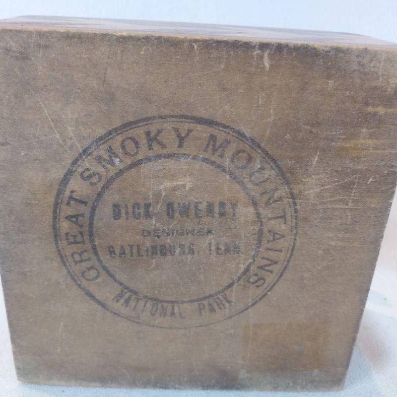 Nicely constructed out of multi-species of wood. Made by Gatlinburg, TN artist - Dick Owenby. It has a wood crack on side consistent and common with solid wood - does not effect the hinges working properly. It measures 4-inches square X 2 1/2-inches tall. Very nice condition.