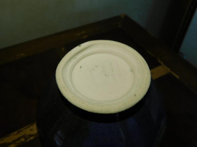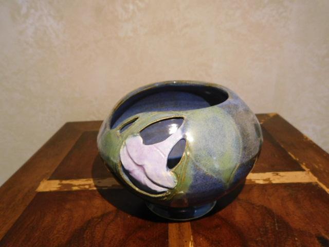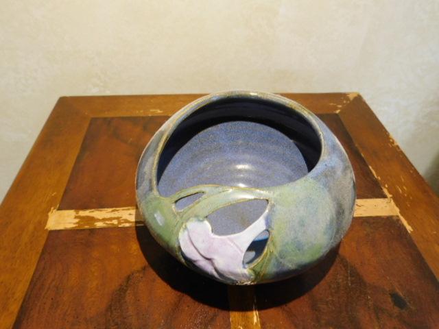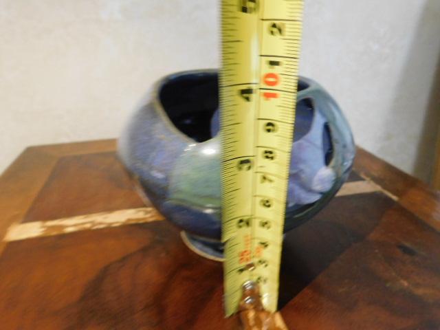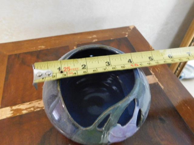 Artist Signed Handcrafted Blue Glazed Pottery Bowl with Floral Edge 3"x4"