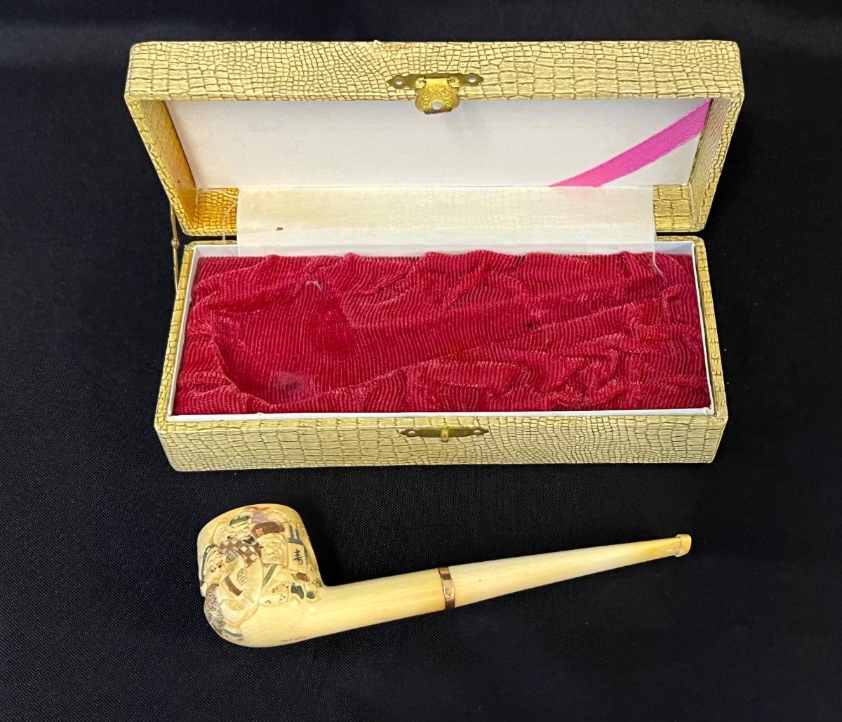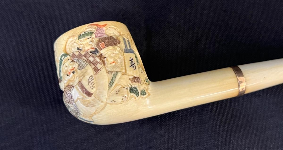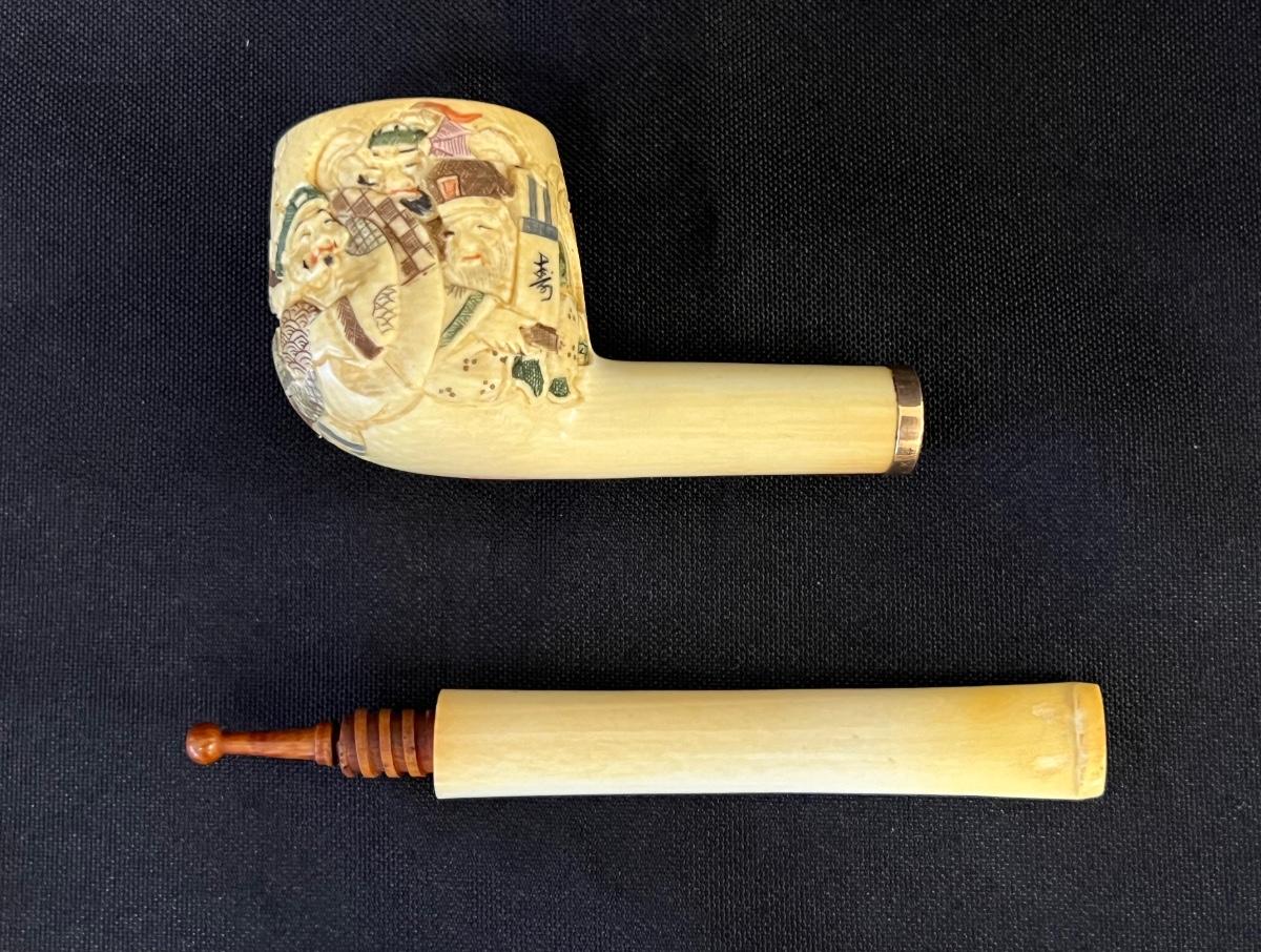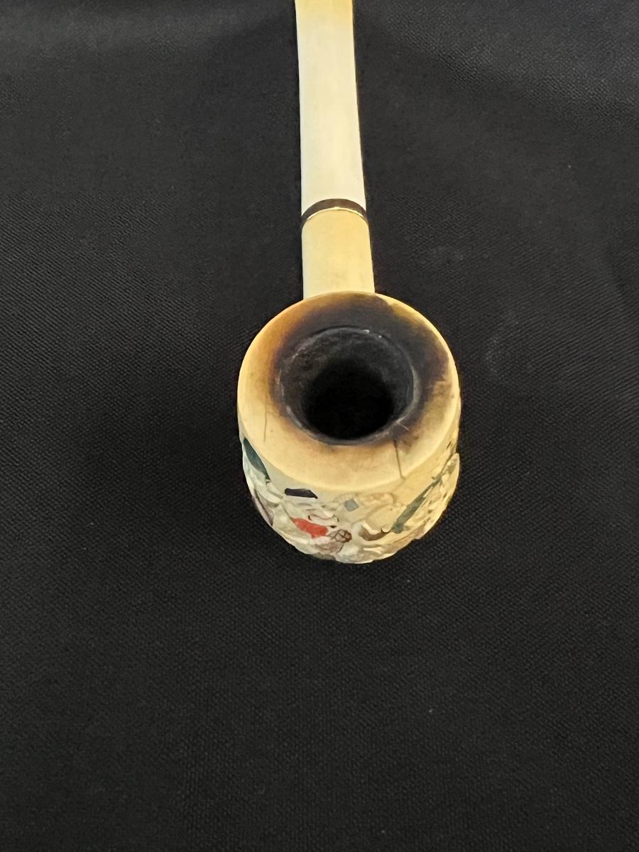 Artist Signed Painted Ivory Pipe with 14K Gold Band