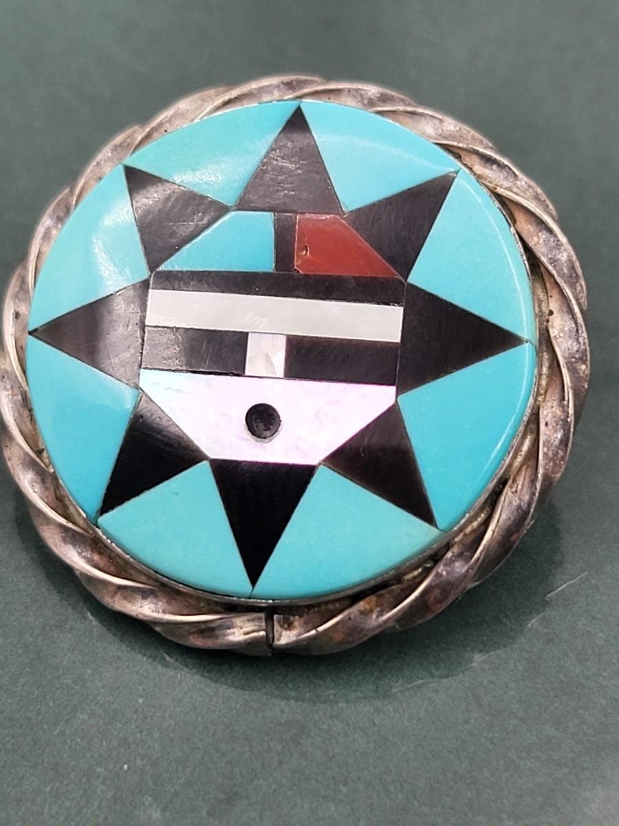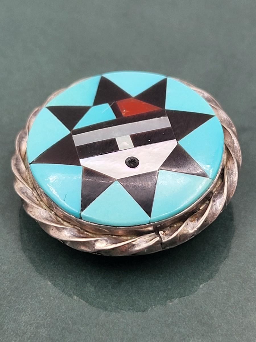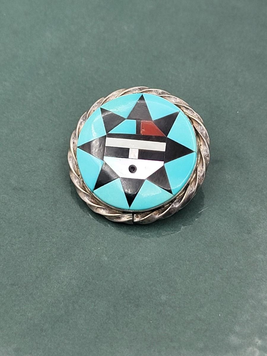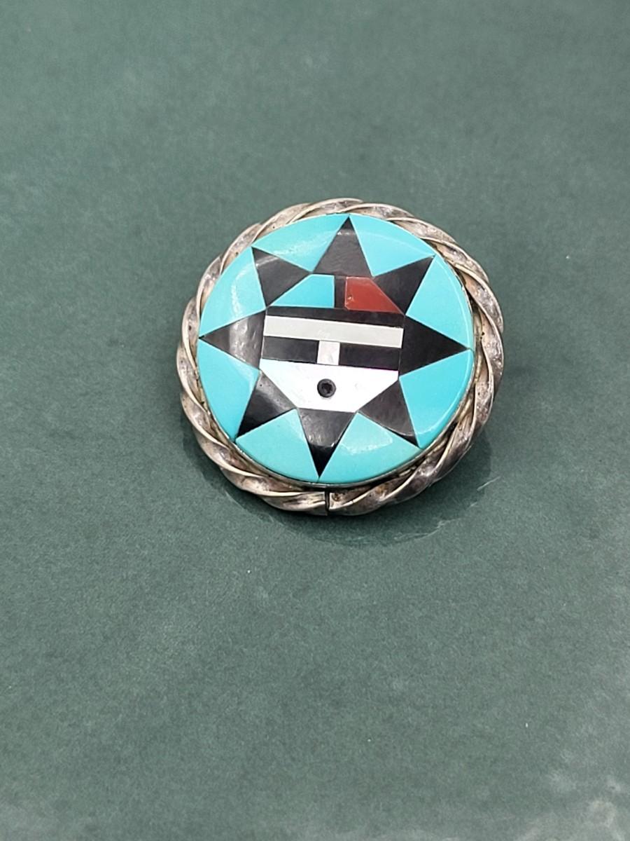 Excellent craftsmanship in this vintage, genuine Zuni, artist signed 1" round, turquoise, onyx, coral and MOP inlay pin or pendant. Star/face motif. Set in sterling silver. Artist M. Shekija? Total weight 6.9 grams.