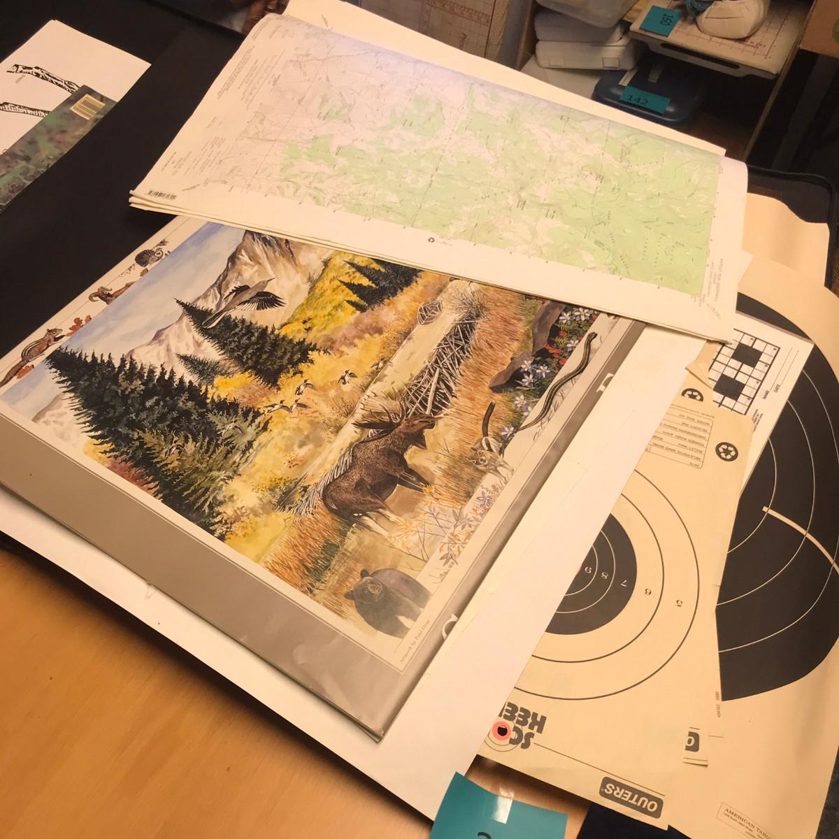 Artist Travel Bag Full of Paper targets, maps, and other wildlife items