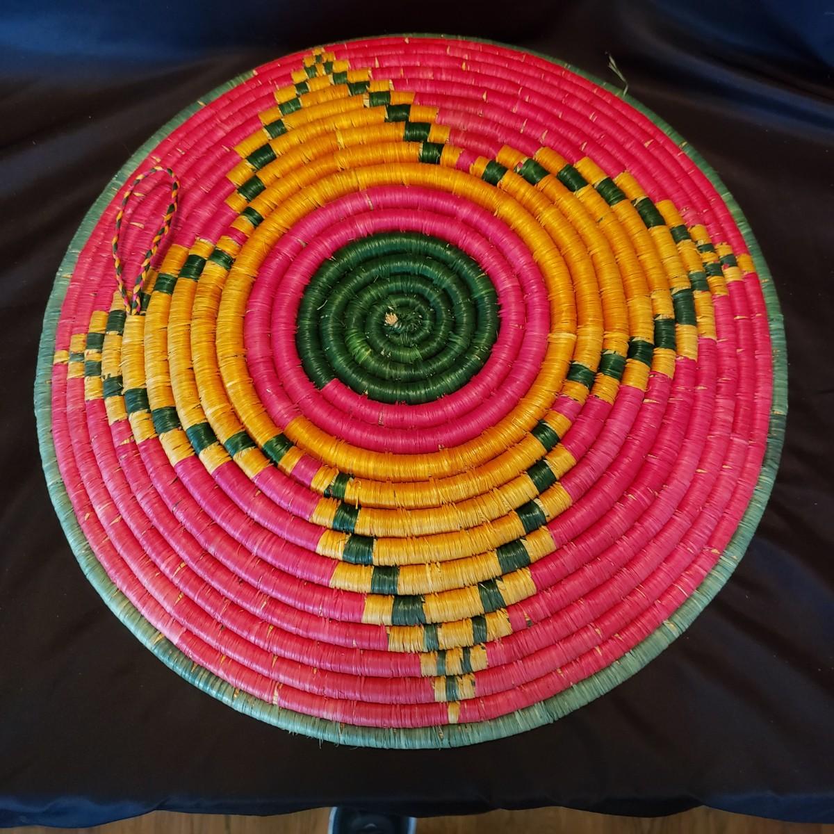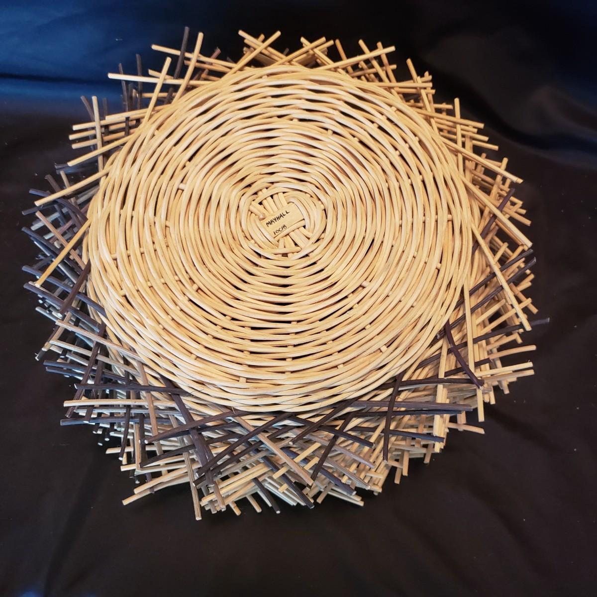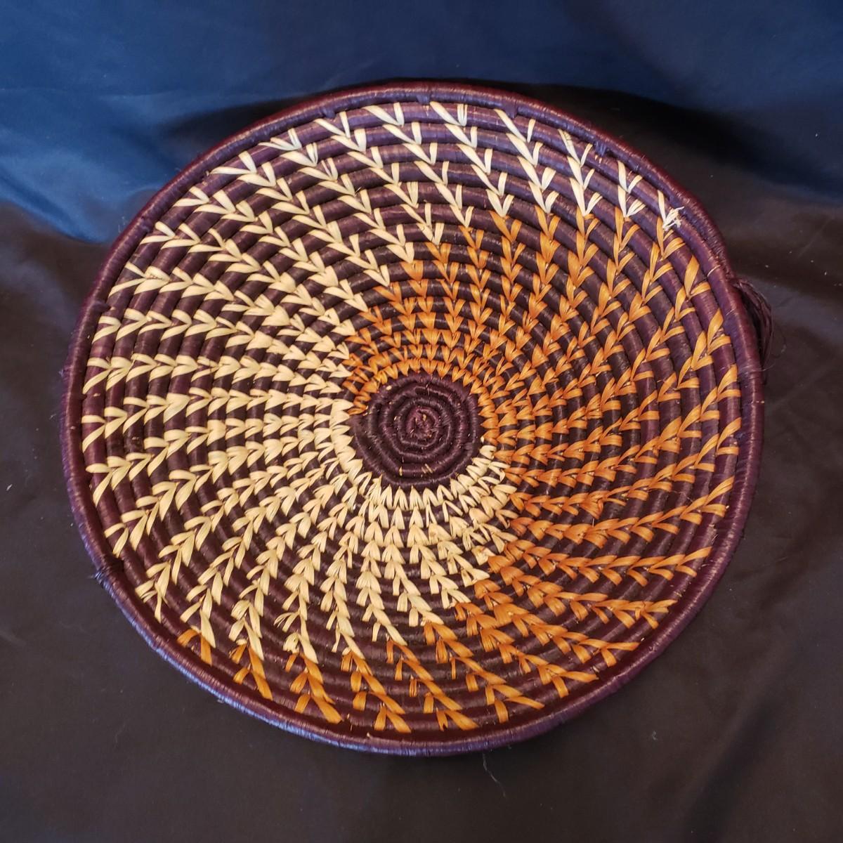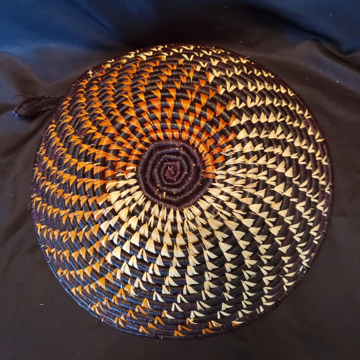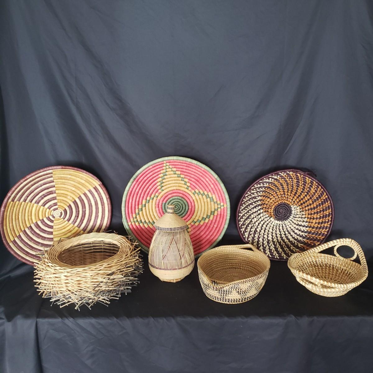 Seven beautifully handcrafted baskets that are usable and artistic. Two baskets are made from sweet grass measuring approximately 13" x 9" x 3" H. The three colorful flatter baskets measure approximately 15" x 3"H. These colorful baskets each have a loop for hanging on the wall. The bird's nest type of basket is stamped Mayhall and measures 13" x 5"H. The basket with a lid measures 6" x 10"H.