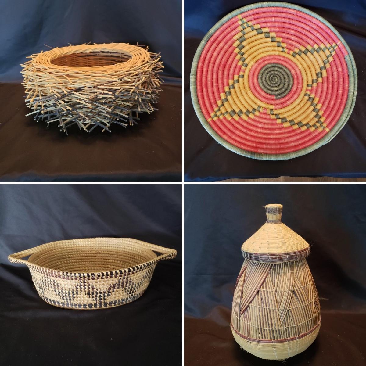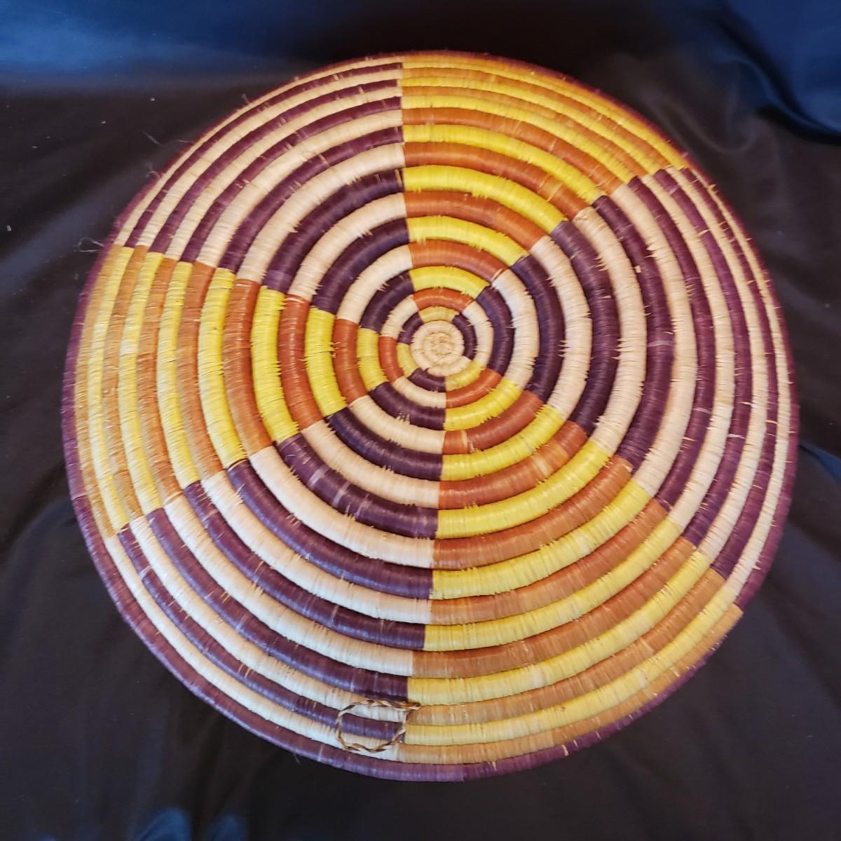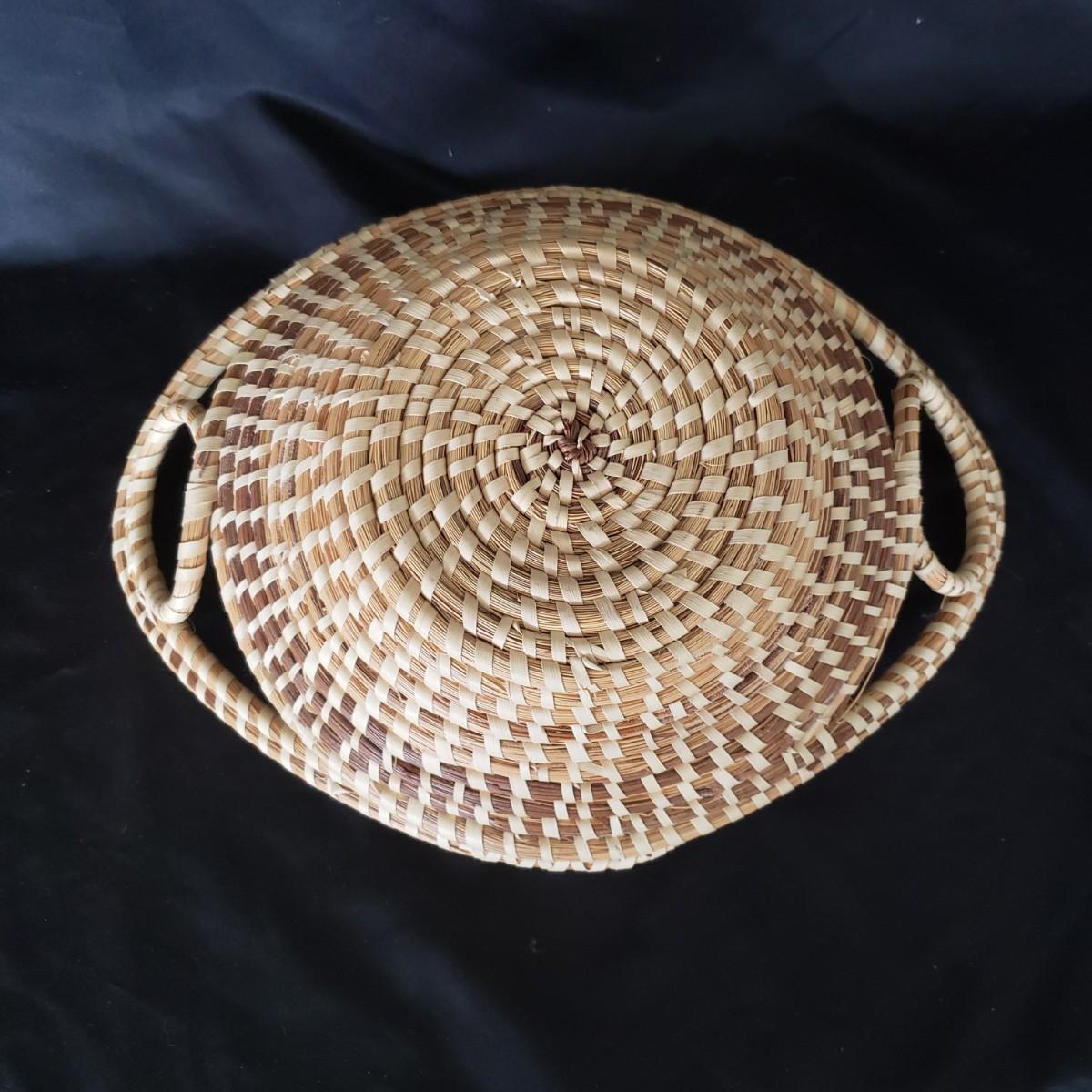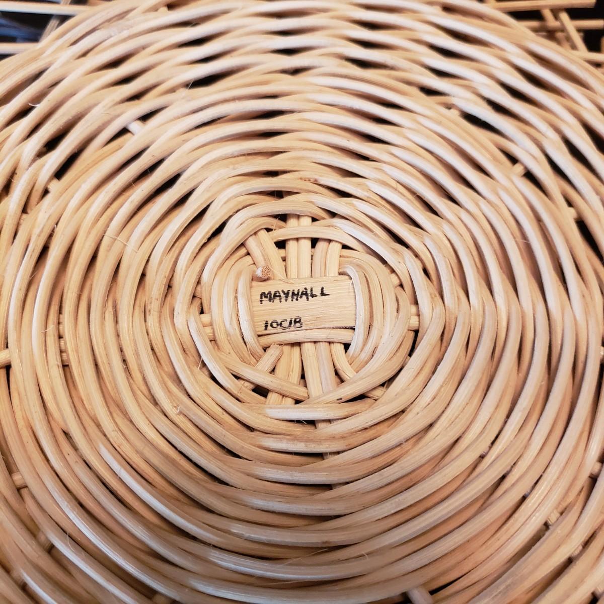 Seven beautifully handcrafted baskets that are usable and artistic. Two baskets are made from sweet grass measuring approximately 13" x 9" x 3" H. The three colorful flatter baskets measure approximately 15" x 3"H. These colorful baskets each have a loop for hanging on the wall. The bird's nest type of basket is stamped Mayhall and measures 13" x 5"H. The basket with a lid measures 6" x 10"H.