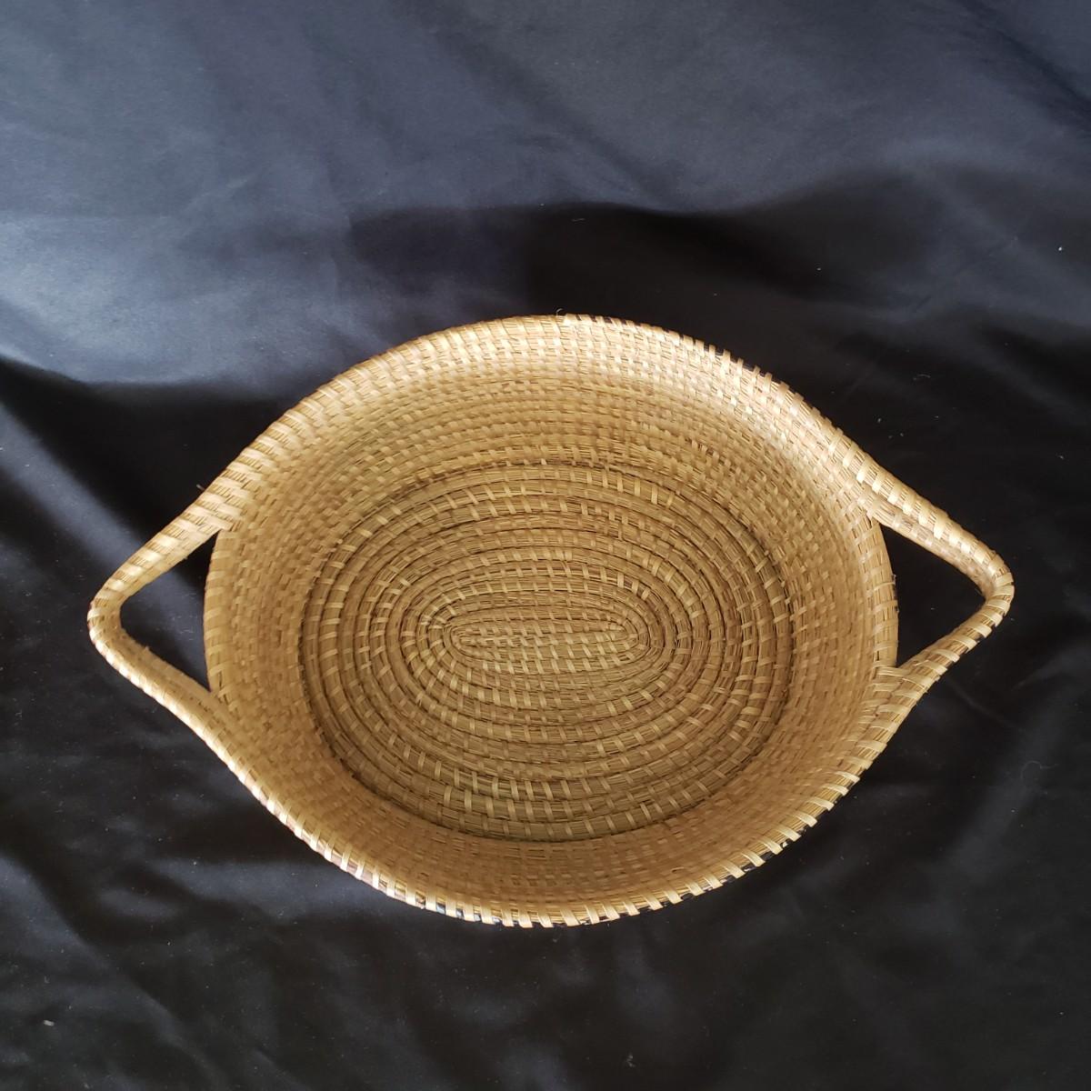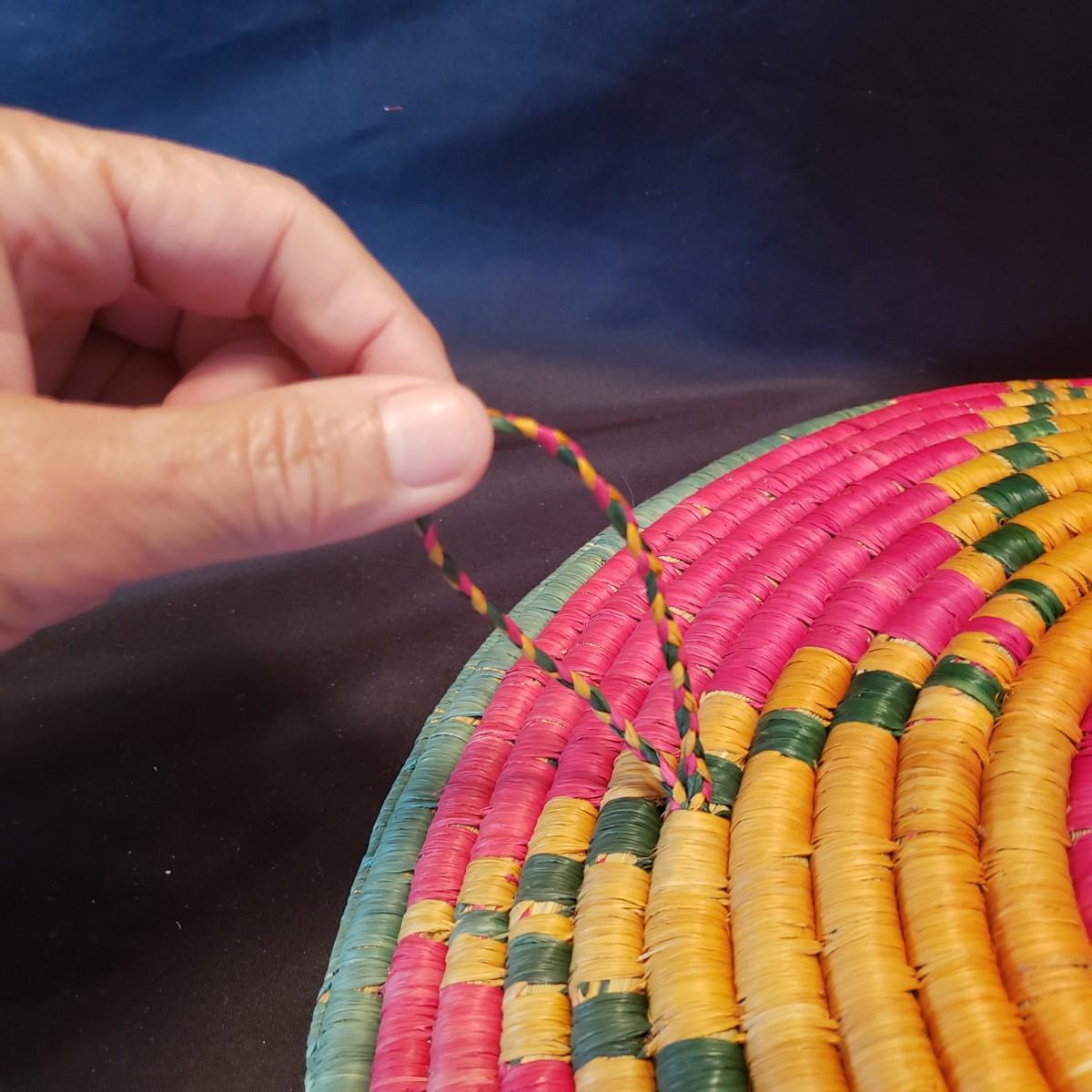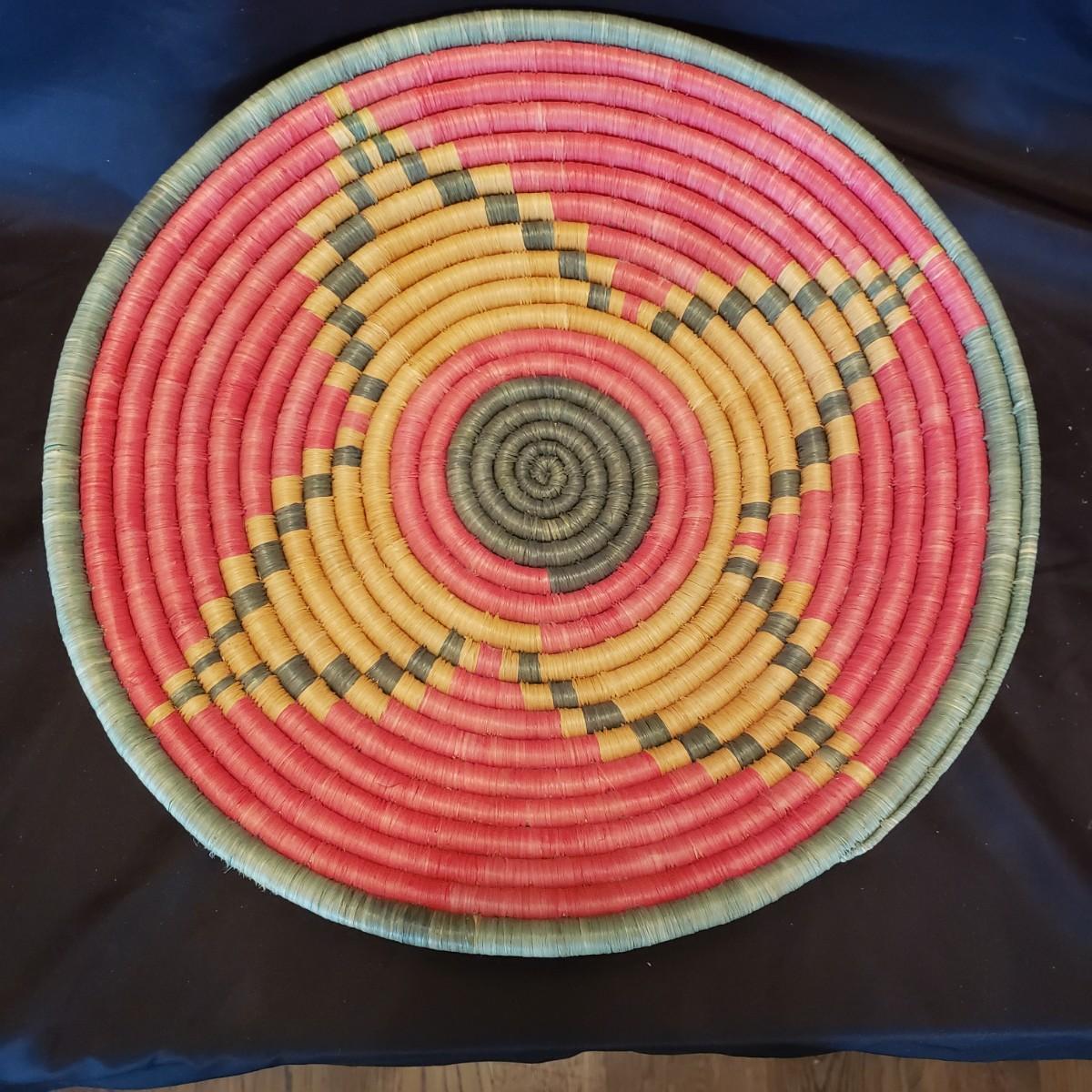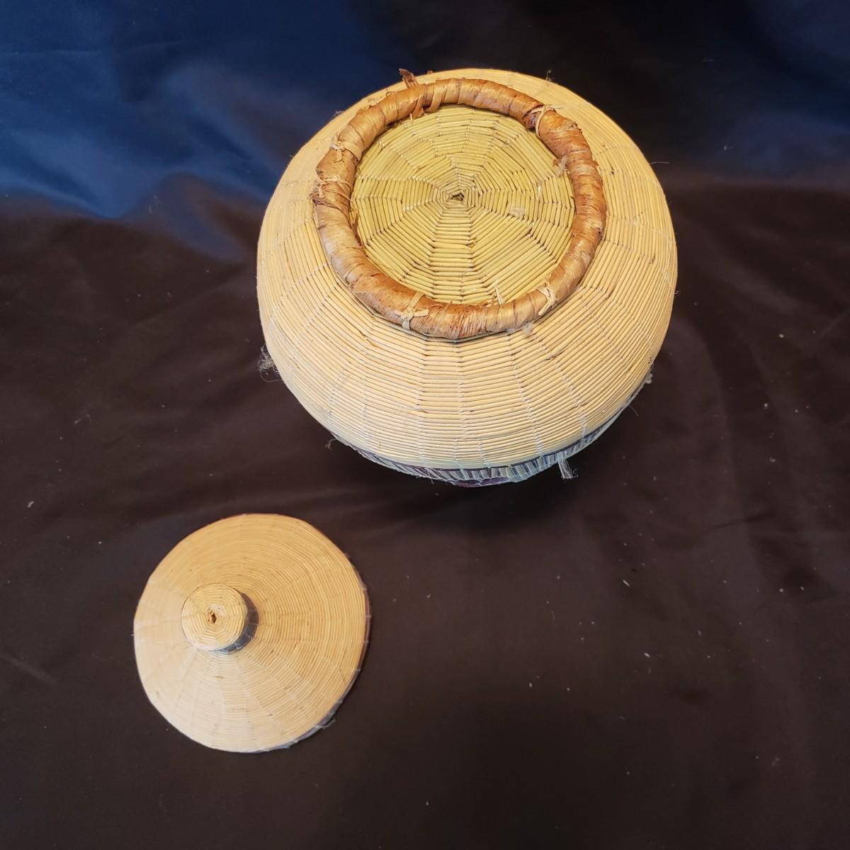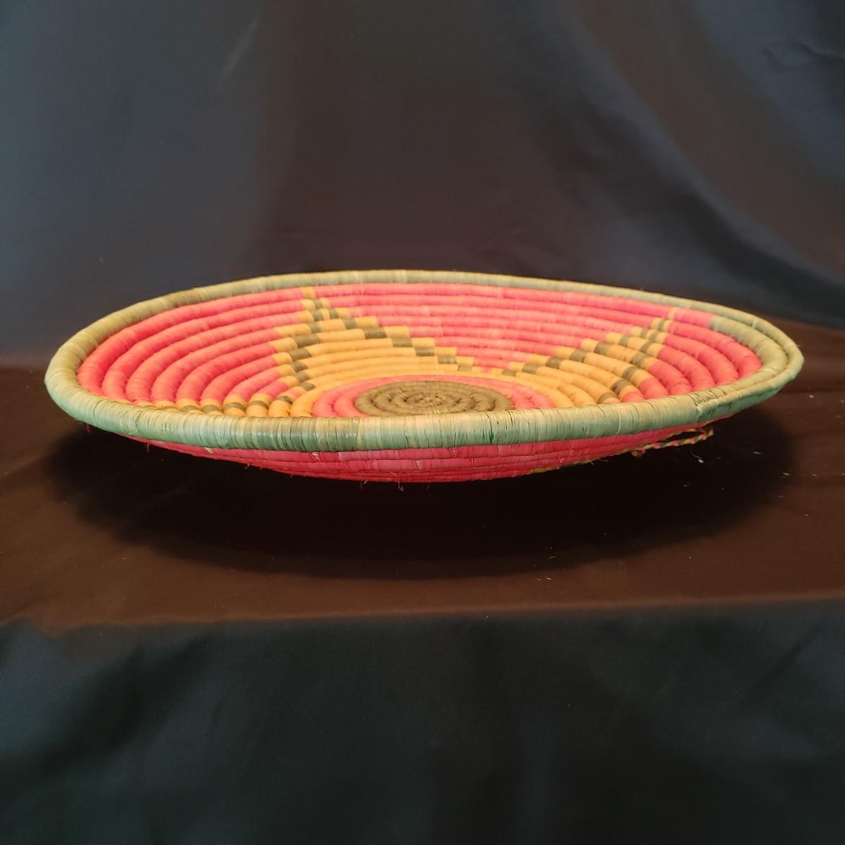 Seven beautifully handcrafted baskets that are usable and artistic. Two baskets are made from sweet grass measuring approximately 13" x 9" x 3" H. The three colorful flatter baskets measure approximately 15" x 3"H. These colorful baskets each have a loop for hanging on the wall. The bird's nest type of basket is stamped Mayhall and measures 13" x 5"H. The basket with a lid measures 6" x 10"H.