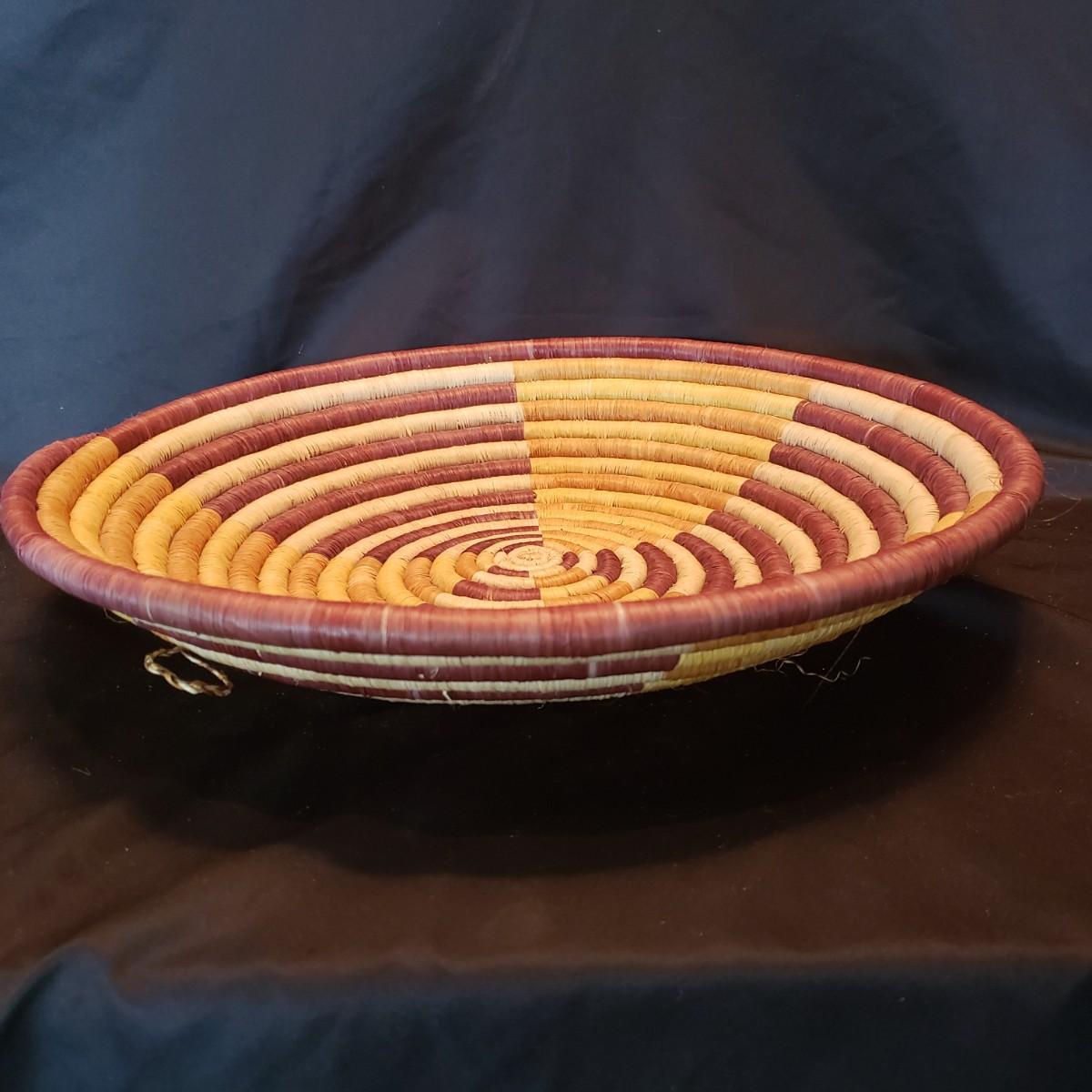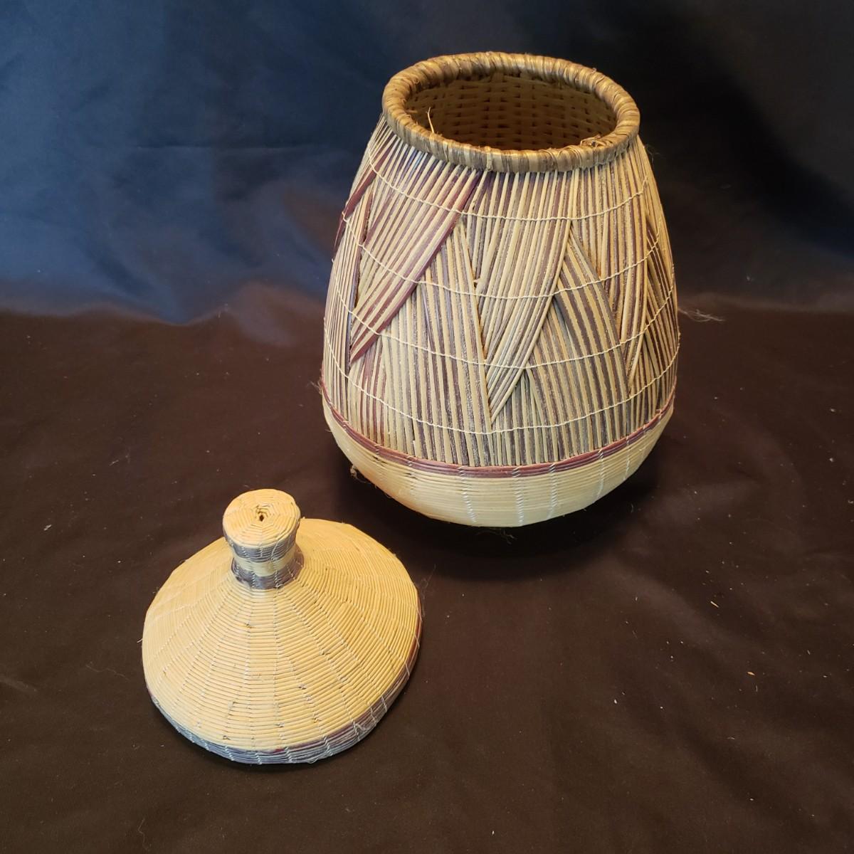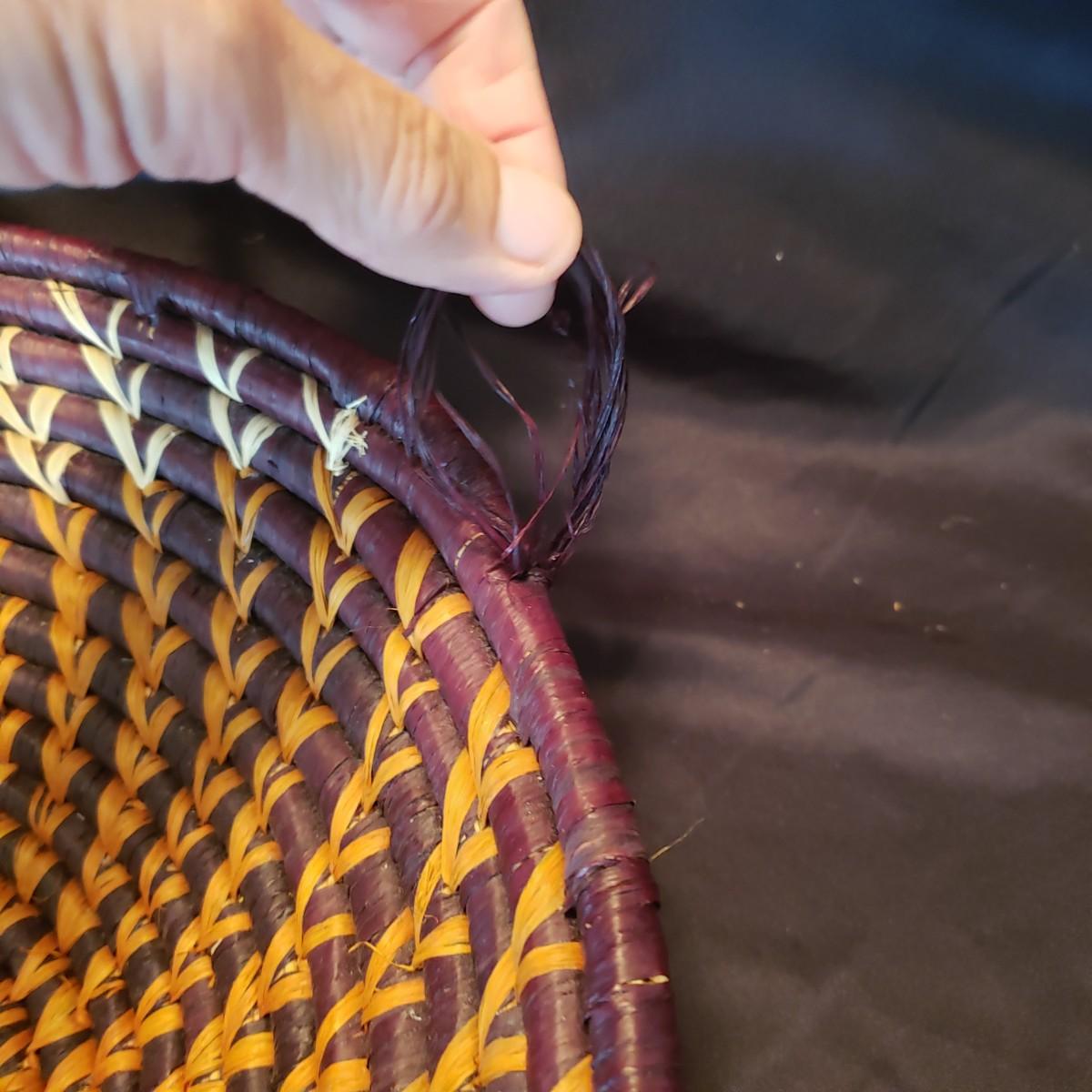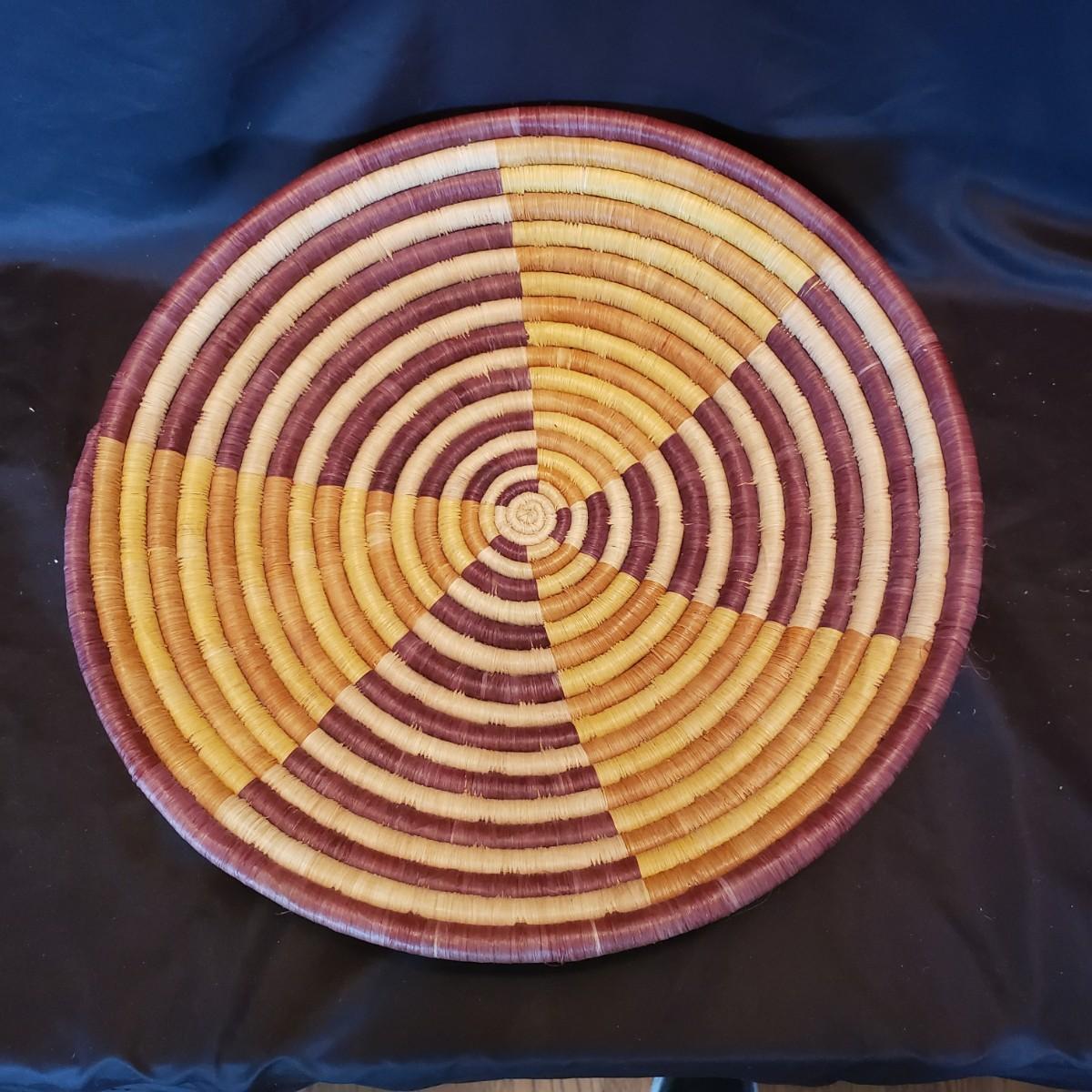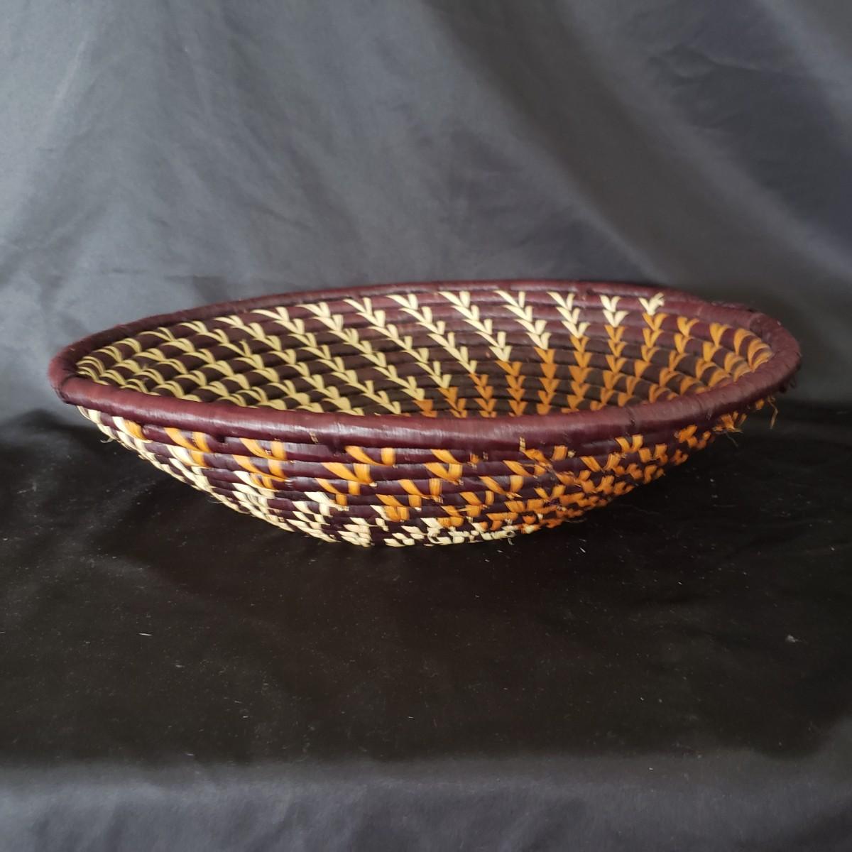 Seven beautifully handcrafted baskets that are usable and artistic. Two baskets are made from sweet grass measuring approximately 13" x 9" x 3" H. The three colorful flatter baskets measure approximately 15" x 3"H. These colorful baskets each have a loop for hanging on the wall. The bird's nest type of basket is stamped Mayhall and measures 13" x 5"H. The basket with a lid measures 6" x 10"H.