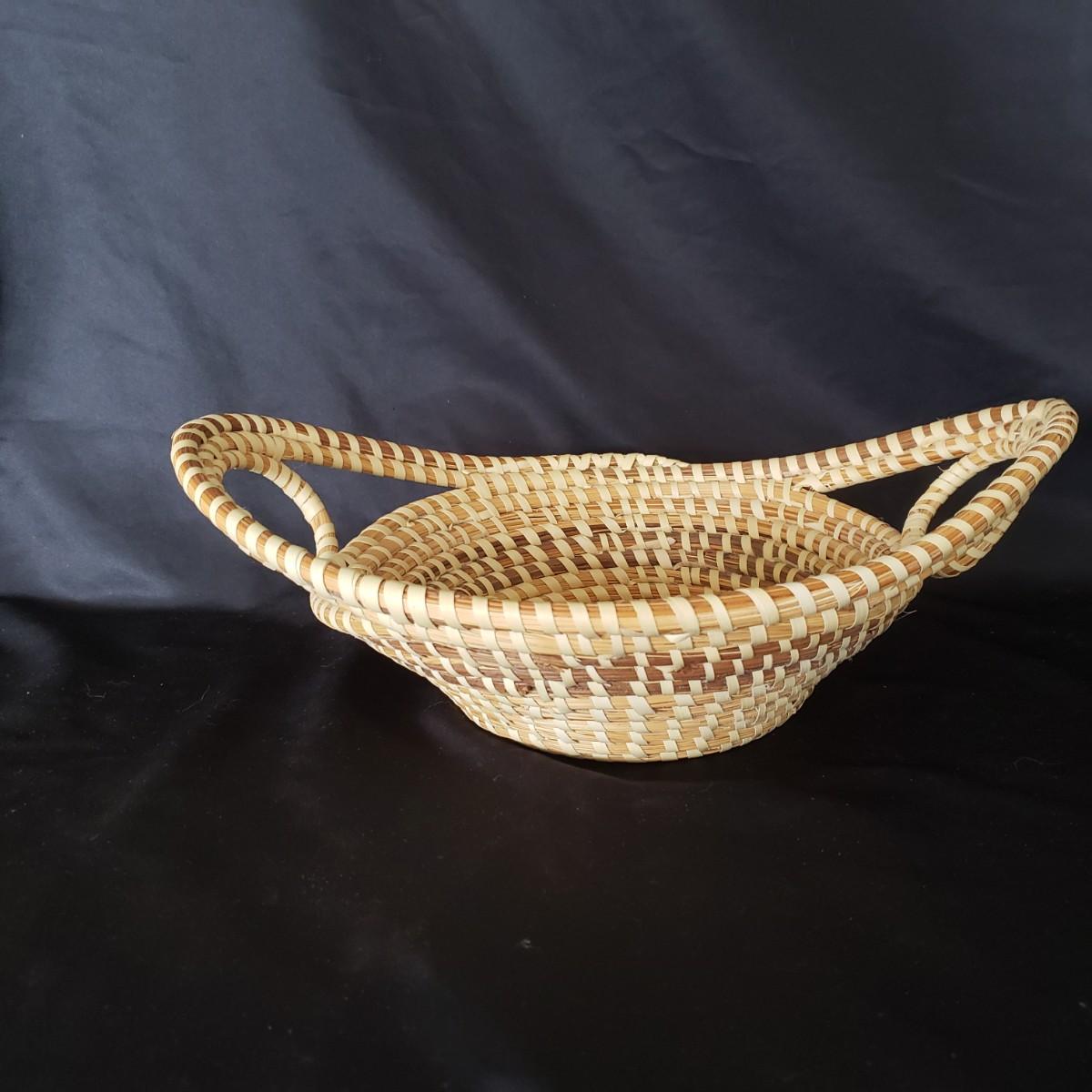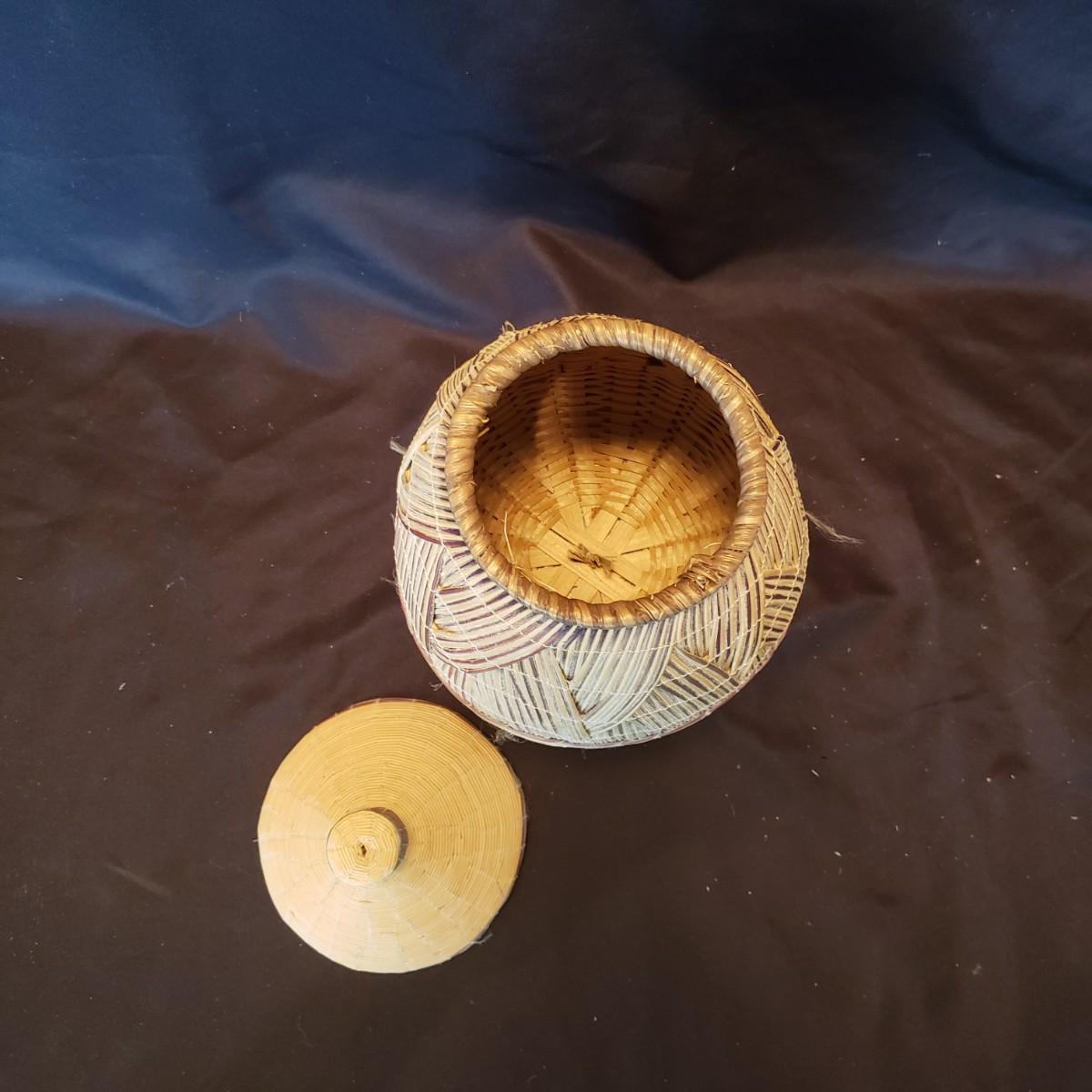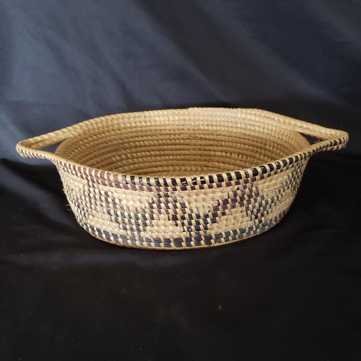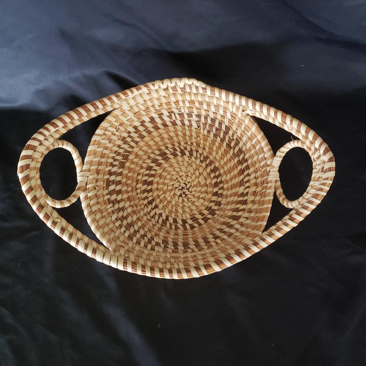 Seven beautifully handcrafted baskets that are usable and artistic. Two baskets are made from sweet grass measuring approximately 13" x 9" x 3" H. The three colorful flatter baskets measure approximately 15" x 3"H. These colorful baskets each have a loop for hanging on the wall. The bird's nest type of basket is stamped Mayhall and measures 13" x 5"H. The basket with a lid measures 6" x 10"H.