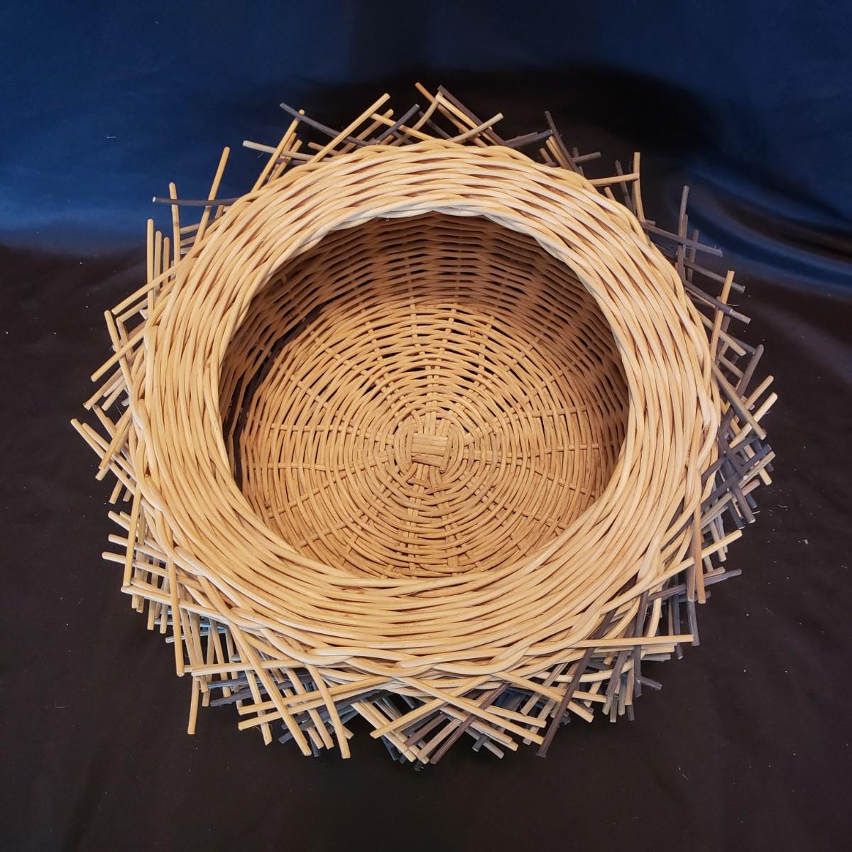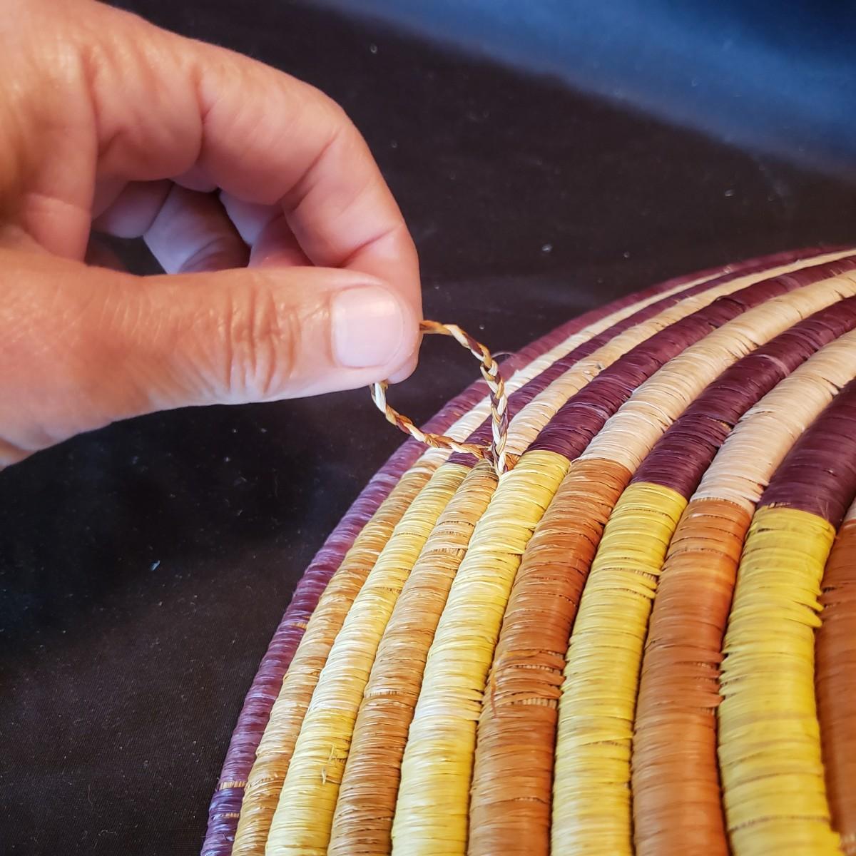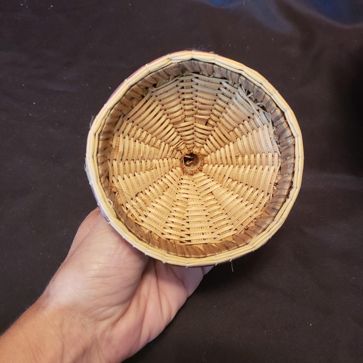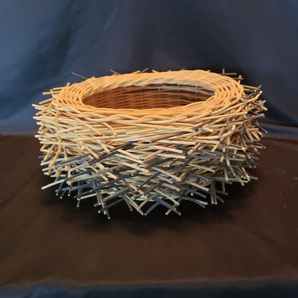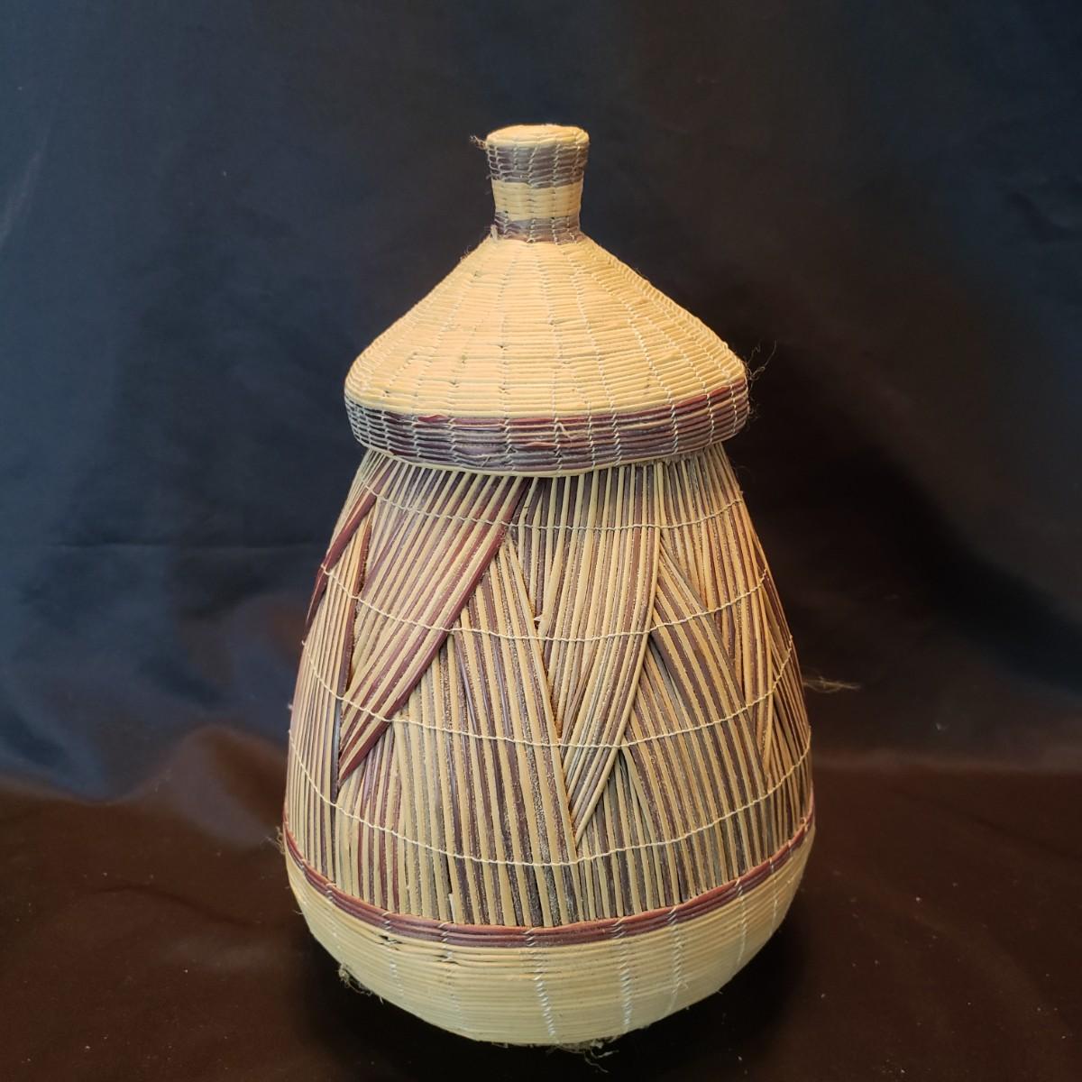 Seven beautifully handcrafted baskets that are usable and artistic. Two baskets are made from sweet grass measuring approximately 13" x 9" x 3" H. The three colorful flatter baskets measure approximately 15" x 3"H. These colorful baskets each have a loop for hanging on the wall. The bird's nest type of basket is stamped Mayhall and measures 13" x 5"H. The basket with a lid measures 6" x 10"H.