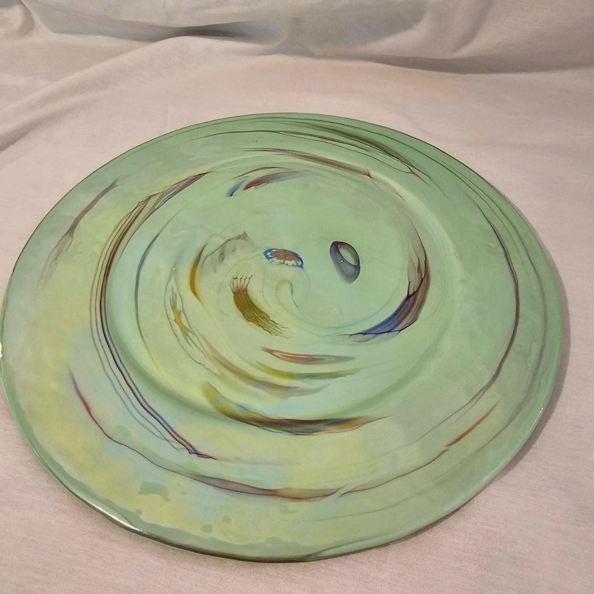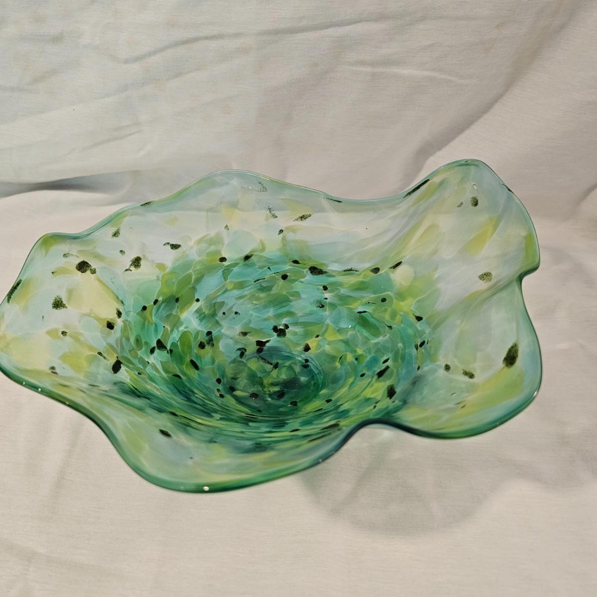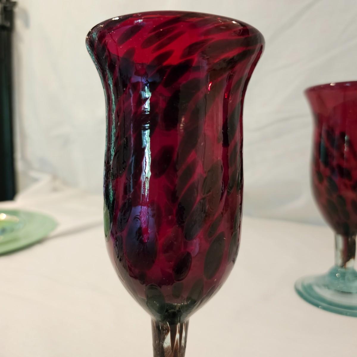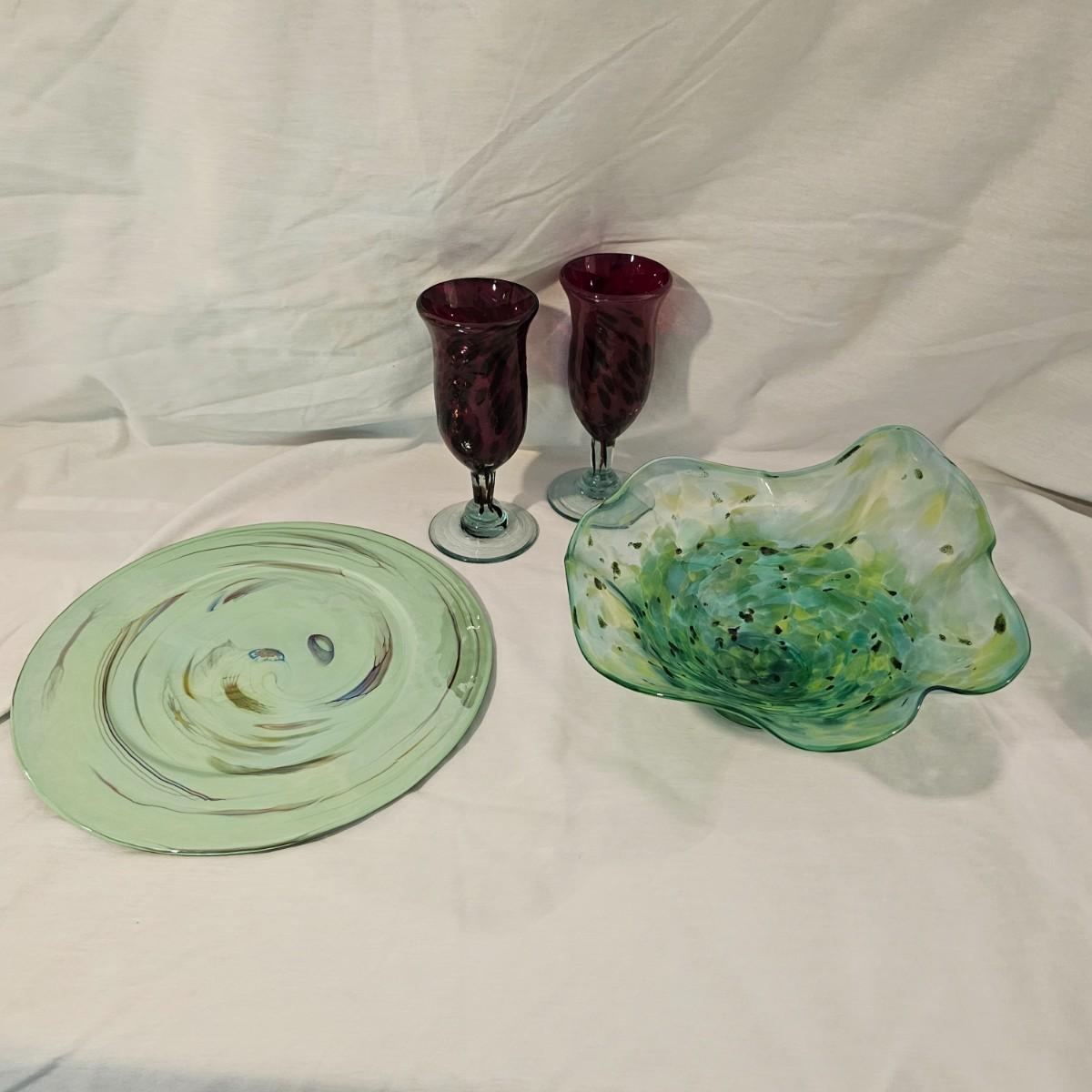A plate, a bowl and two goblets for artistic display. The green swirled plate is 12"D, has iridescent sheen on front and flower swirled motif. The free form bowl is 12.5" x 10" x 5" H, has natural bubble inclusions and is signed. The two red goblets are 3.5"D x 8"H, have swirled color motif on cups and cascading color down the stems. See photos for details. Shipping available.