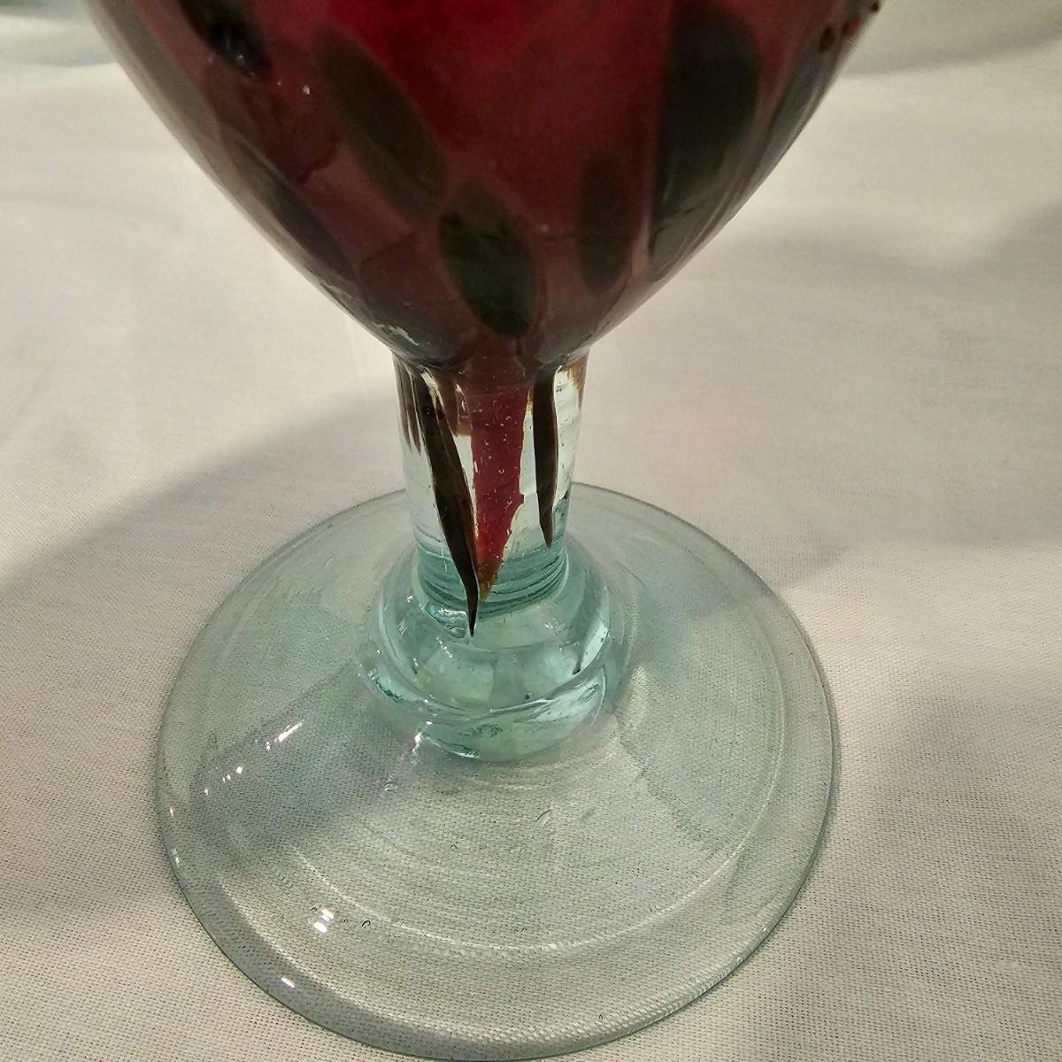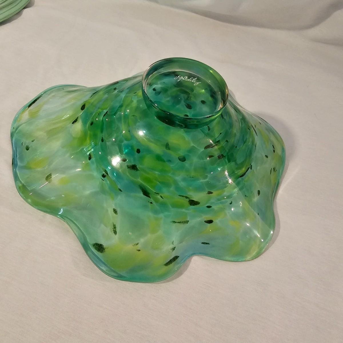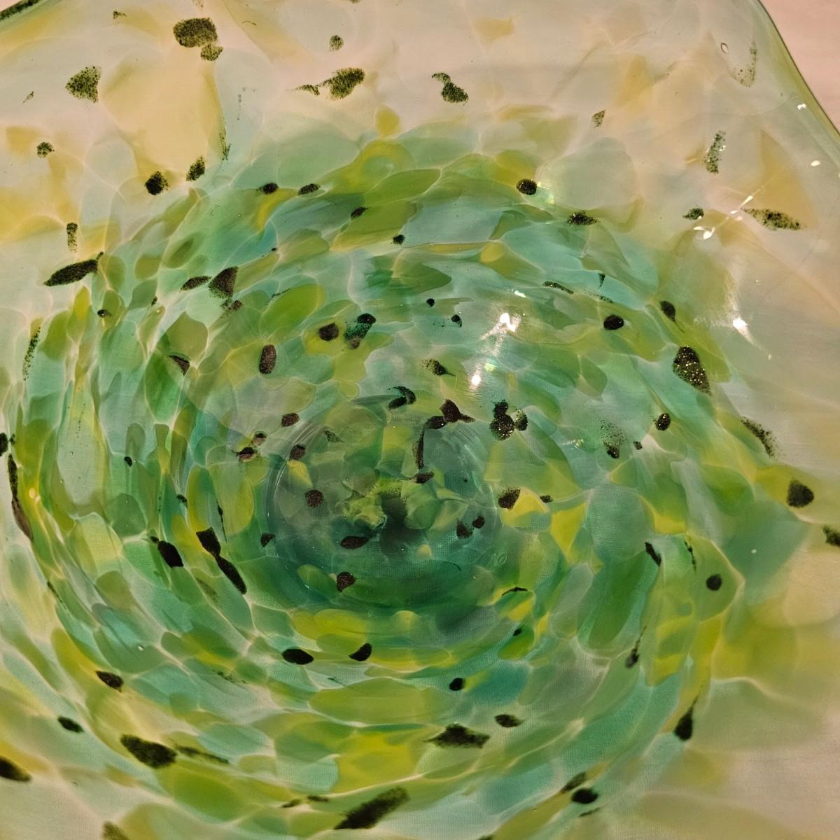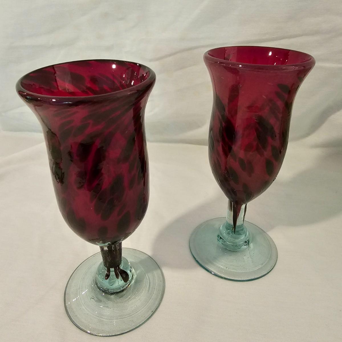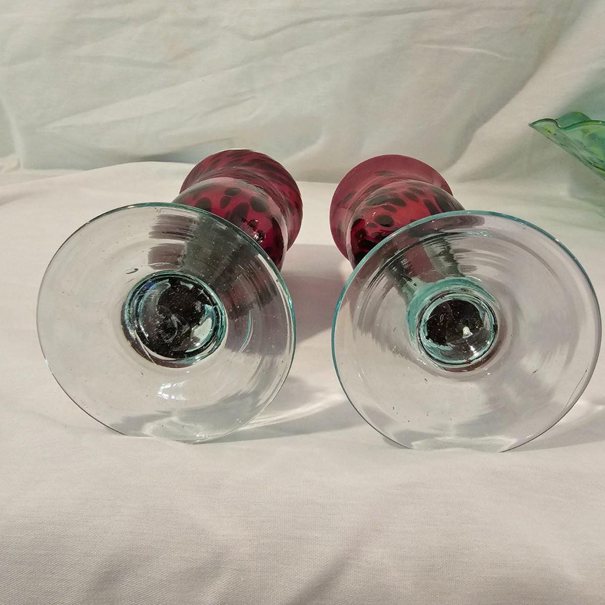 A plate, a bowl and two goblets for artistic display. The green swirled plate is 12"D, has iridescent sheen on front and flower swirled motif. The free form bowl is 12.5" x 10" x 5" H, has natural bubble inclusions and is signed. The two red goblets are 3.5"D x 8"H, have swirled color motif on cups and cascading color down the stems. See photos for details. Shipping available.