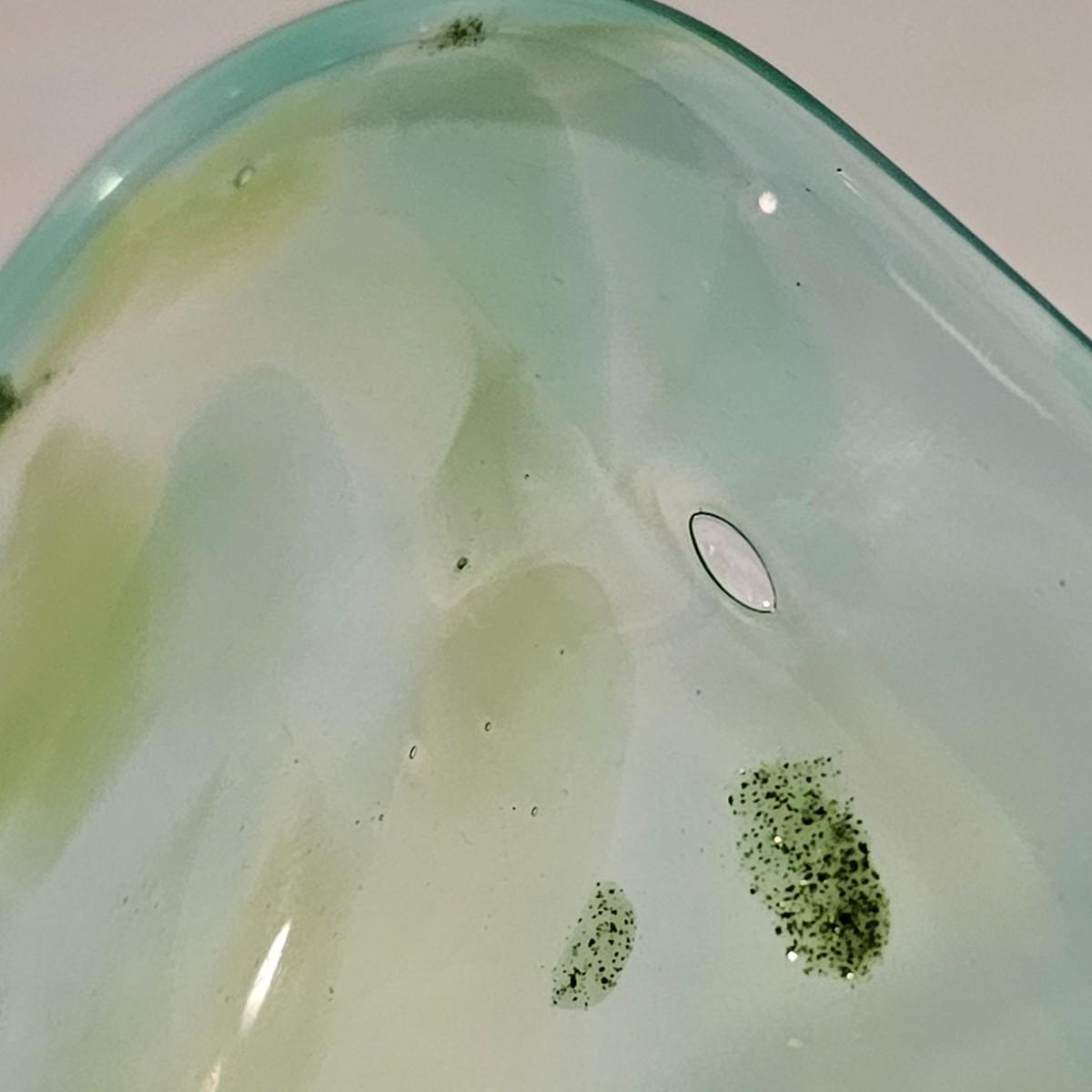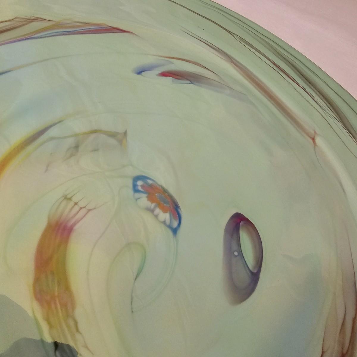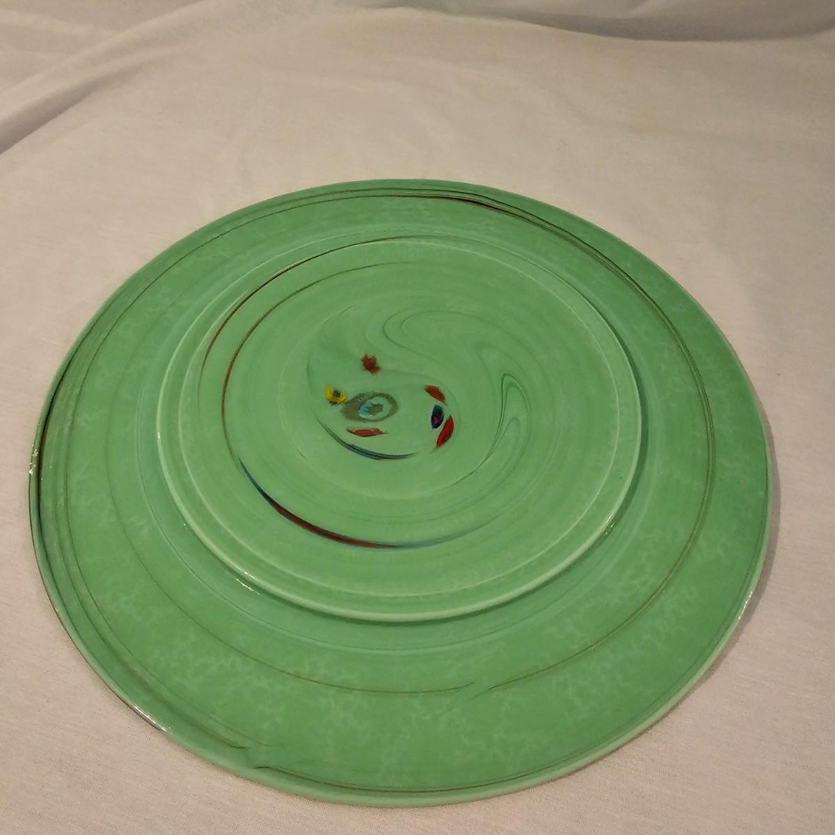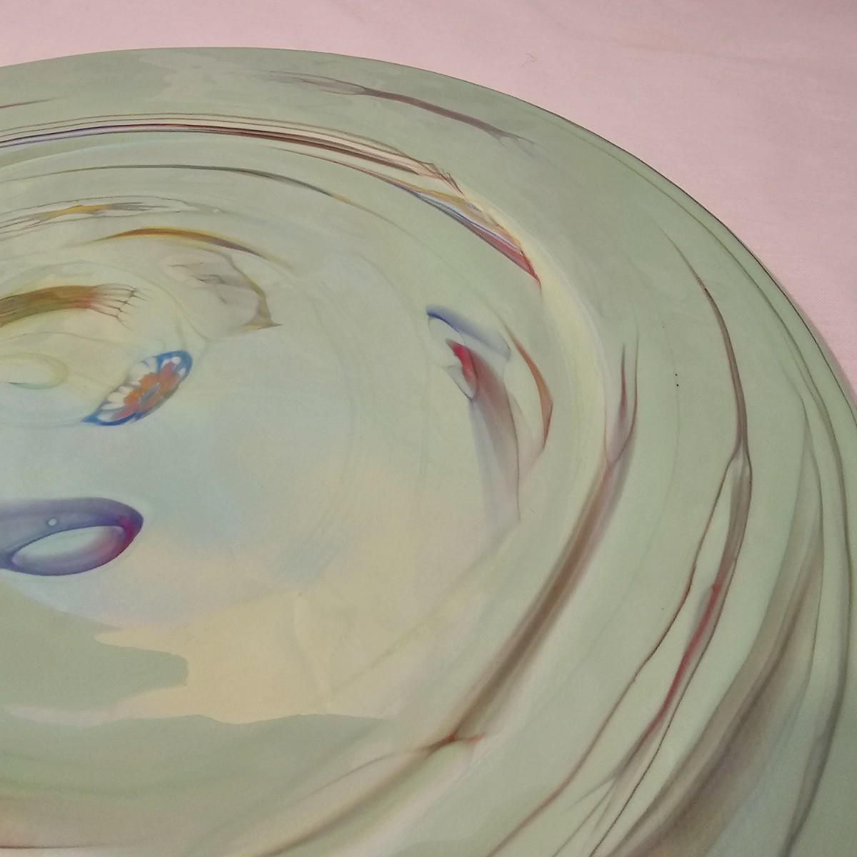 A plate, a bowl and two goblets for artistic display. The green swirled plate is 12"D, has iridescent sheen on front and flower swirled motif. The free form bowl is 12.5" x 10" x 5" H, has natural bubble inclusions and is signed. The two red goblets are 3.5"D x 8"H, have swirled color motif on cups and cascading color down the stems. See photos for details. Shipping available.