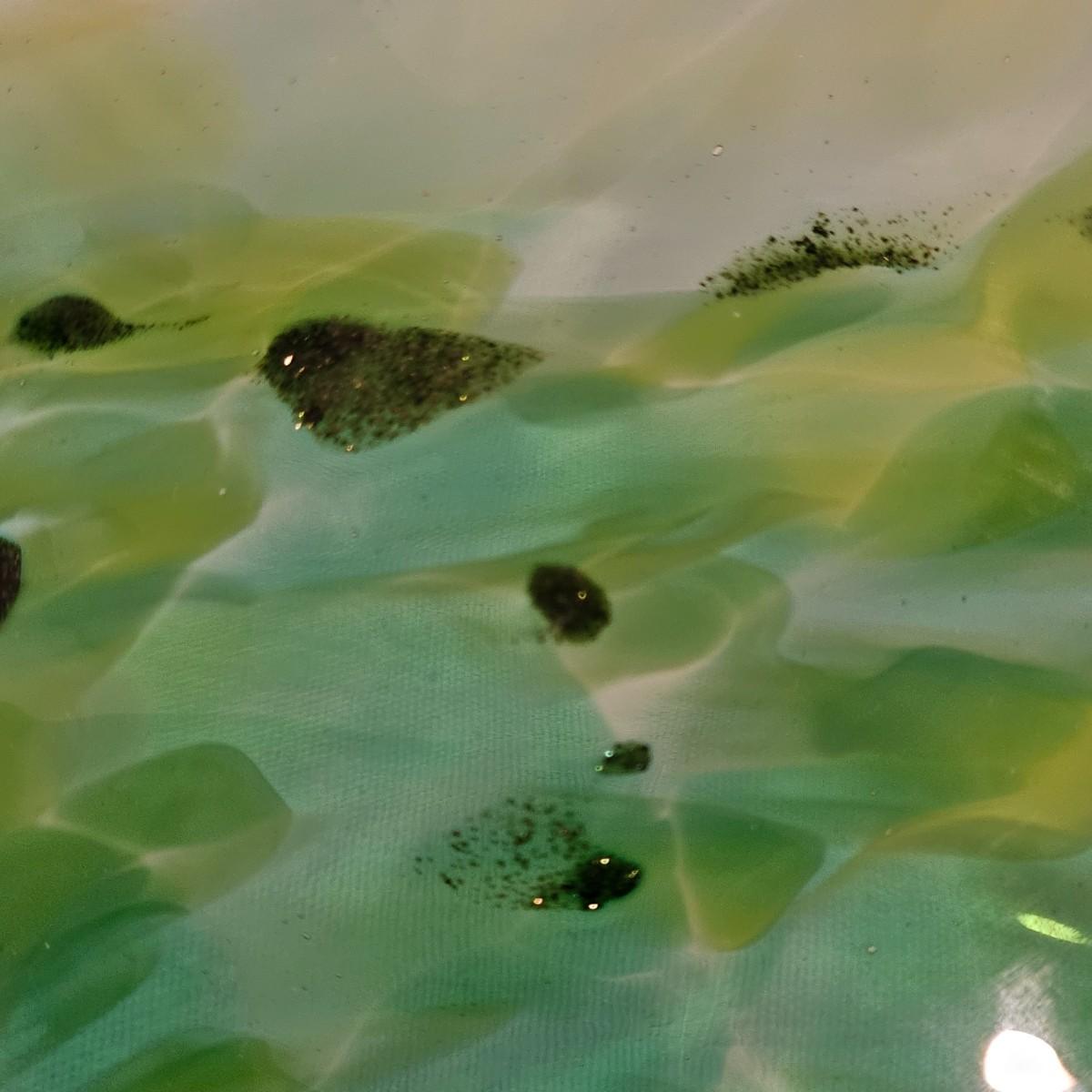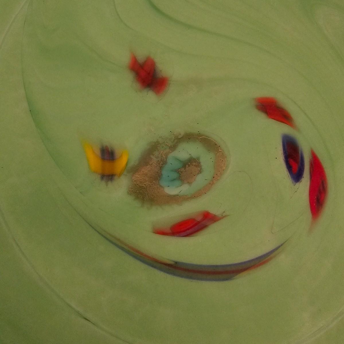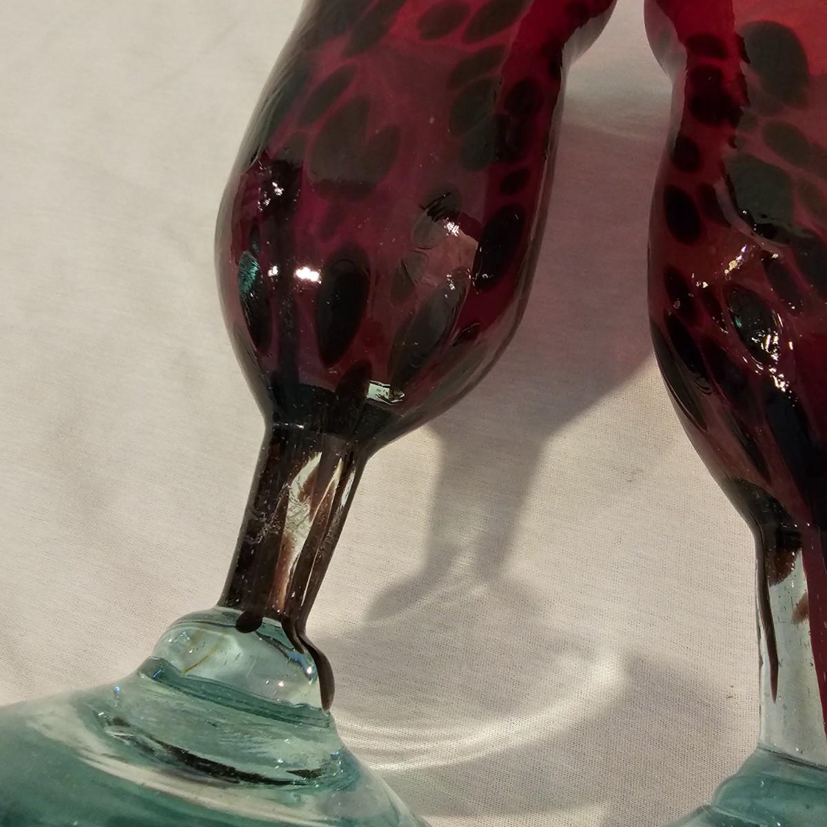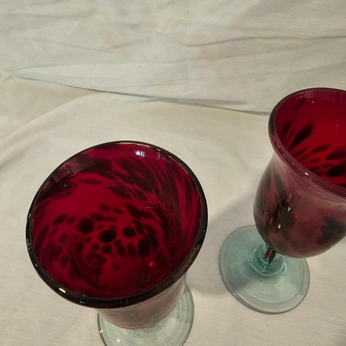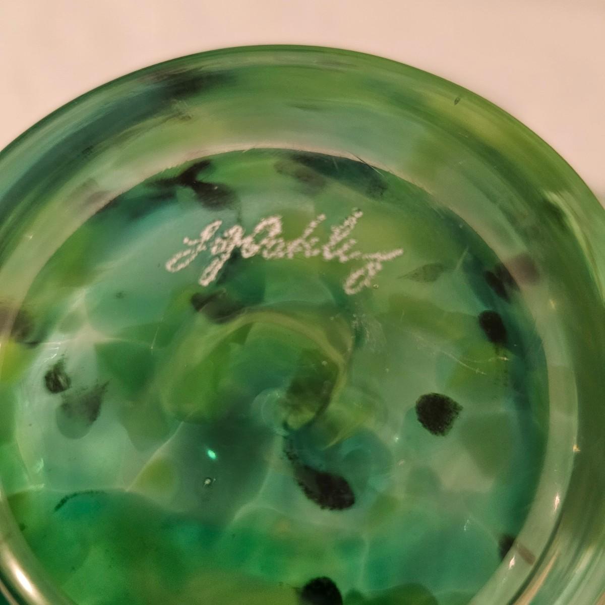A plate, a bowl and two goblets for artistic display. The green swirled plate is 12"D, has iridescent sheen on front and flower swirled motif. The free form bowl is 12.5" x 10" x 5" H, has natural bubble inclusions and is signed. The two red goblets are 3.5"D x 8"H, have swirled color motif on cups and cascading color down the stems. See photos for details. Shipping available.