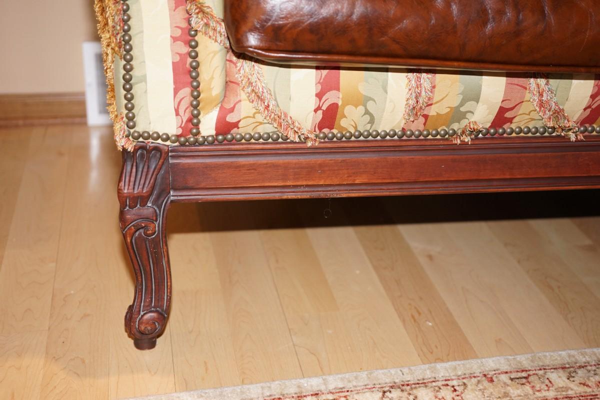 ARTISTIC OLD HICKORY SOFA IN FABRIC OF THREAD PILES AND VIBRANT PATTERN. BROWN LEATHER TRIM