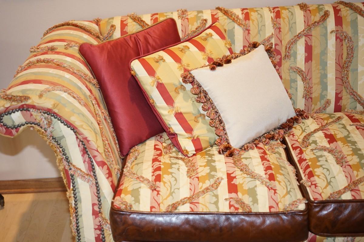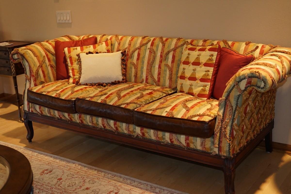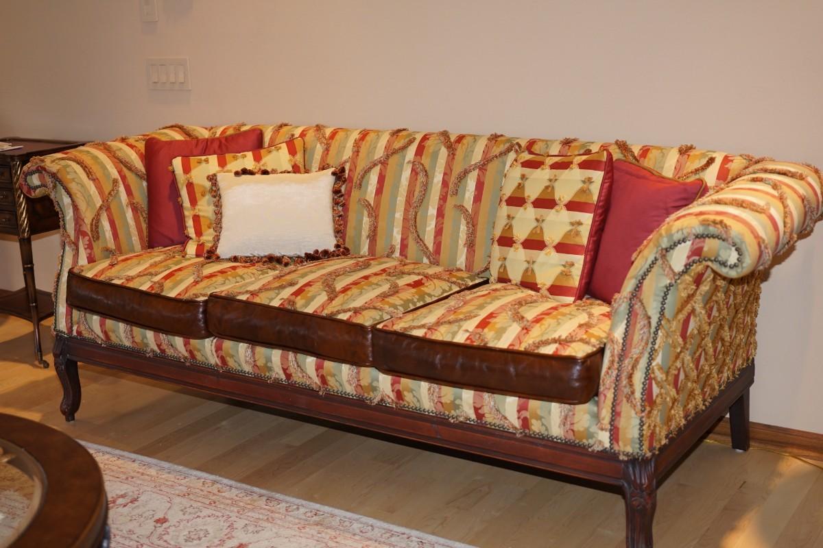 Sofa with scrolled arms. piled thread fabric in design striped pattern and weave colors on the sides. Dark wood frame base the cushions have a brown leather trim. the colors are vivid yet the earthtone feel.