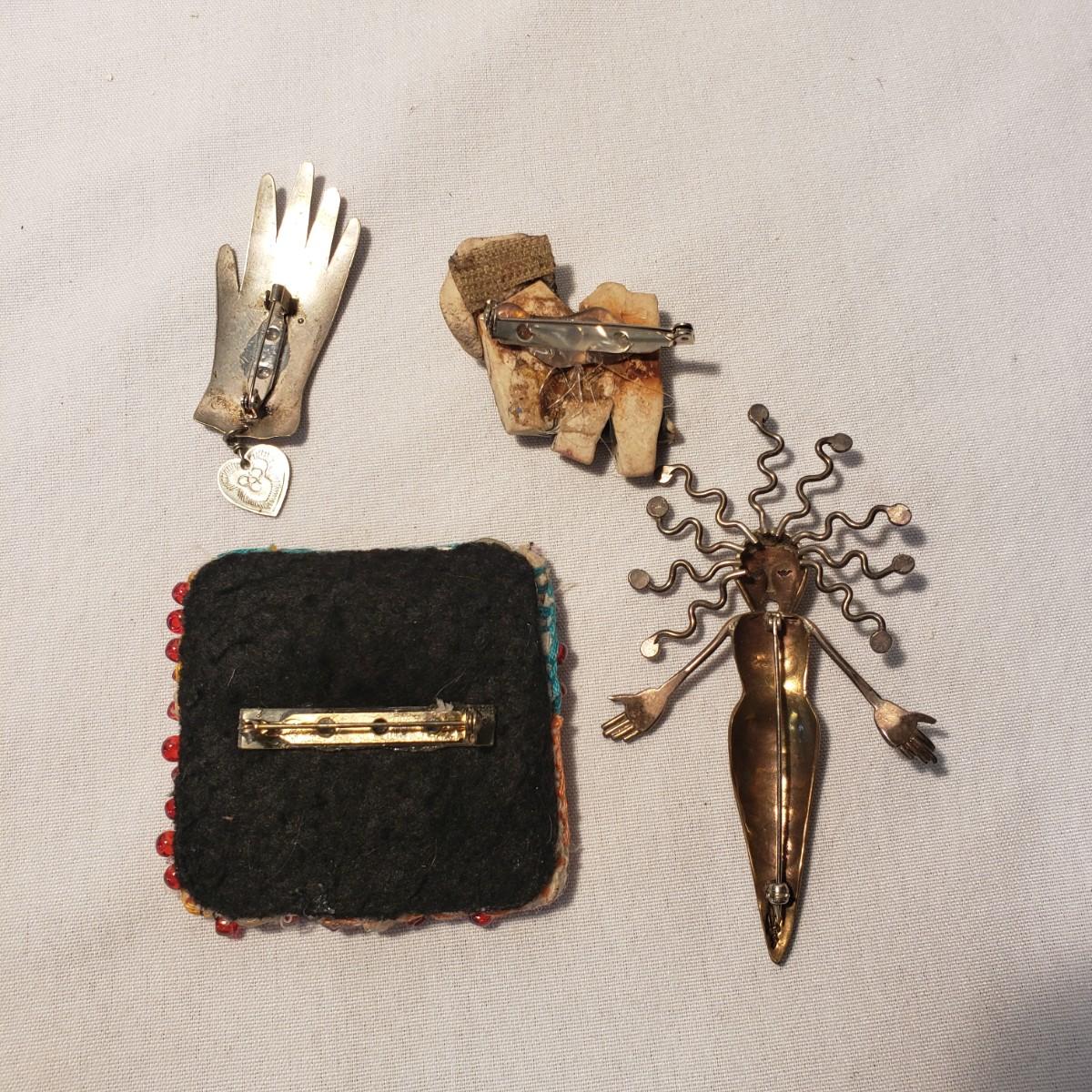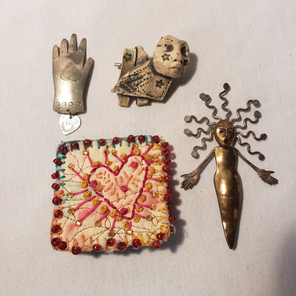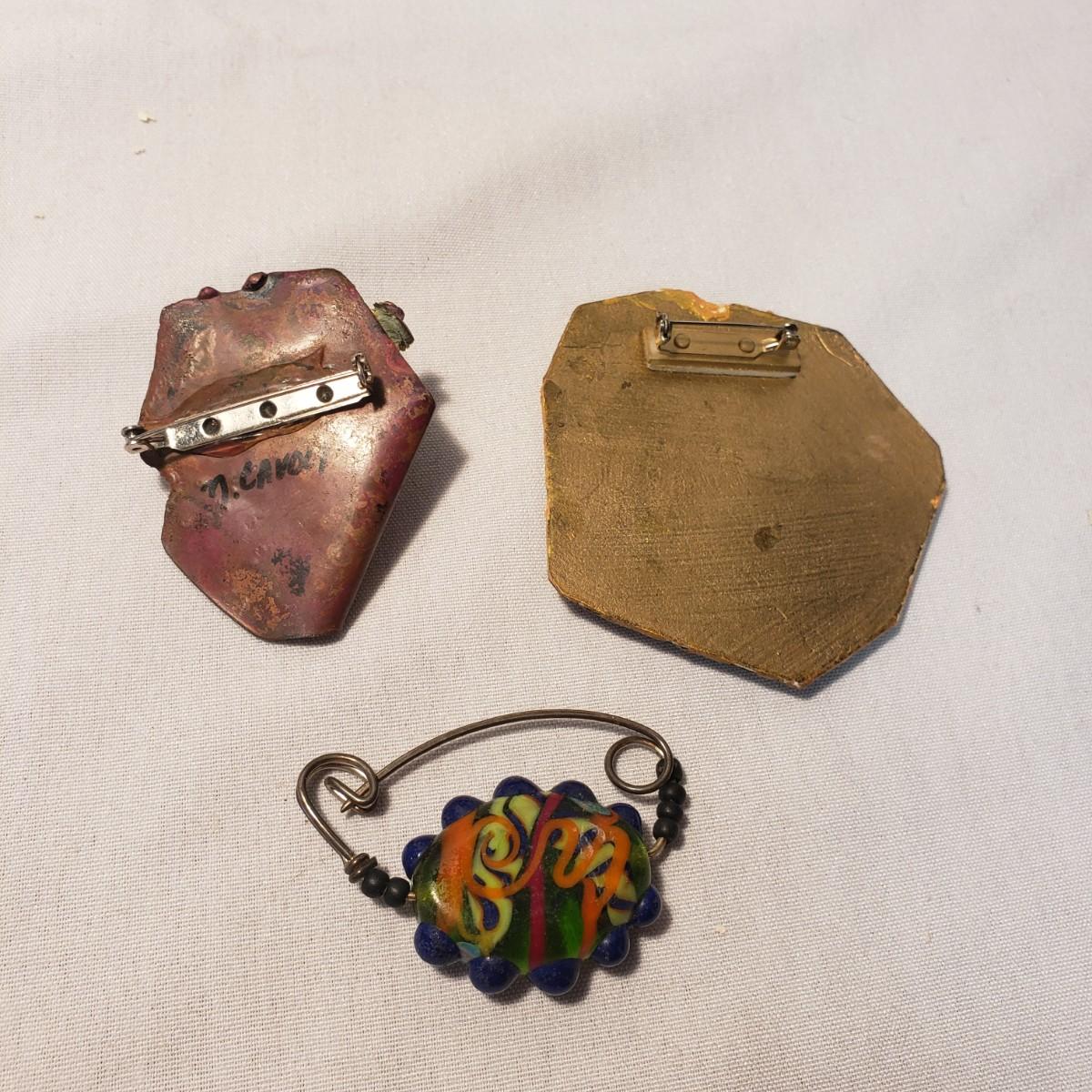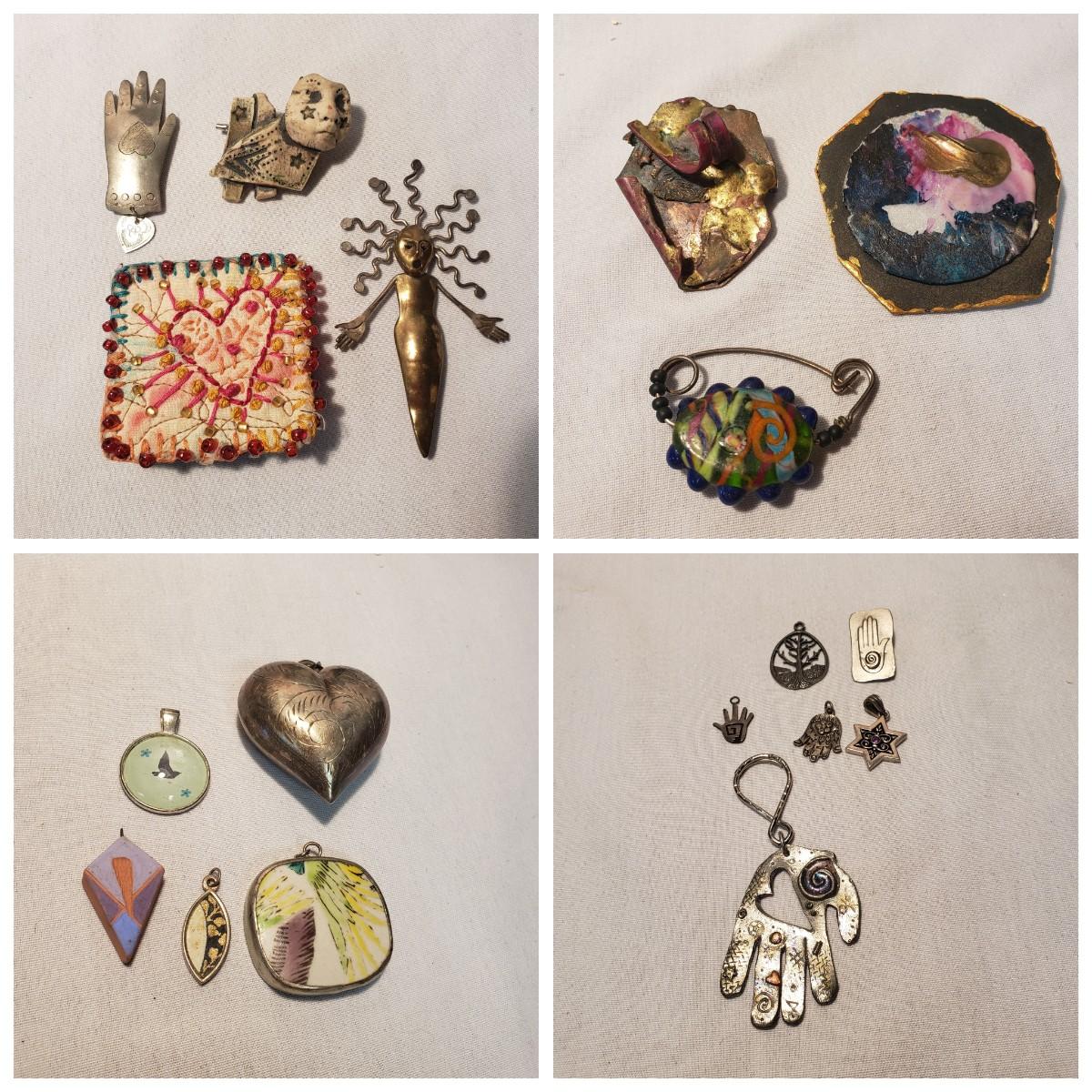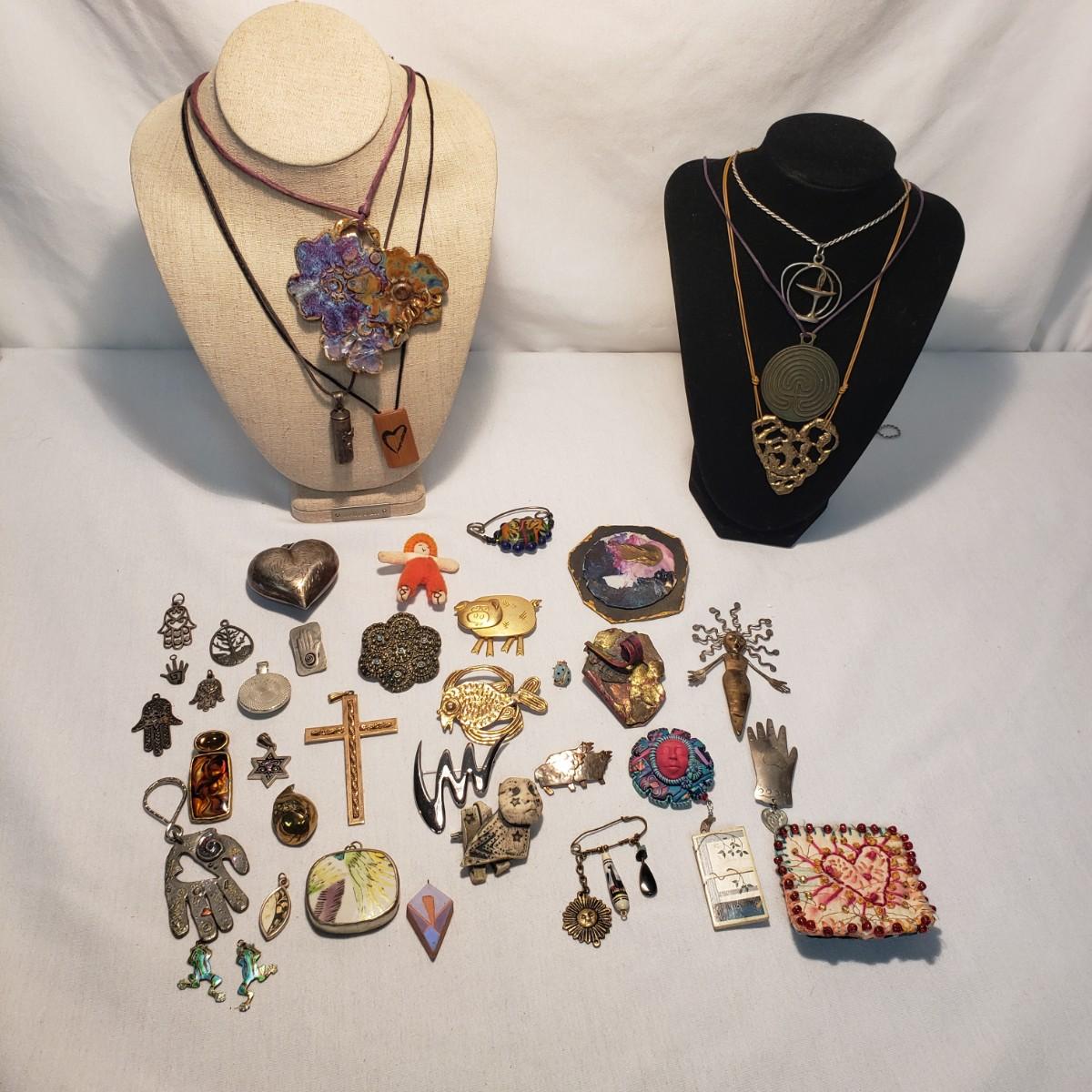 This artisan jewelry lot features pins, pendants and necklaces ready for you to feel fancy! All known markings were photographed. The UU pendant is marked pewter. Some of artists have marked their craftsmanship, see pictures. The necklaces could be used in exchanging out pendants!