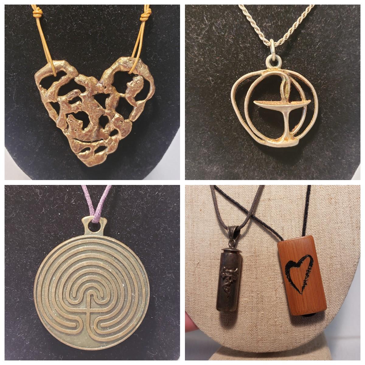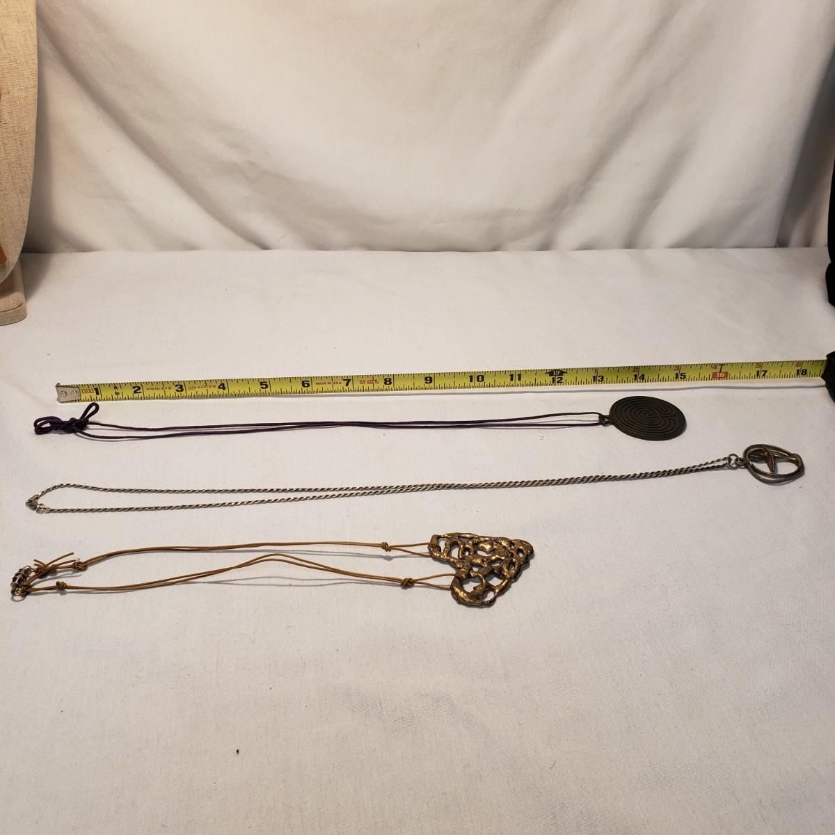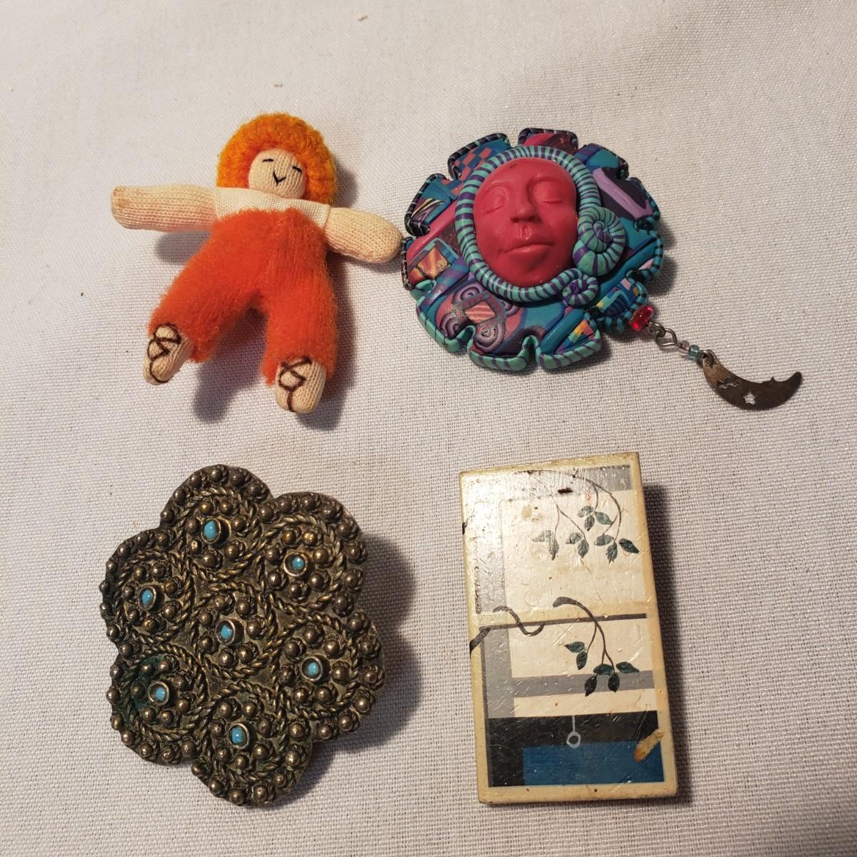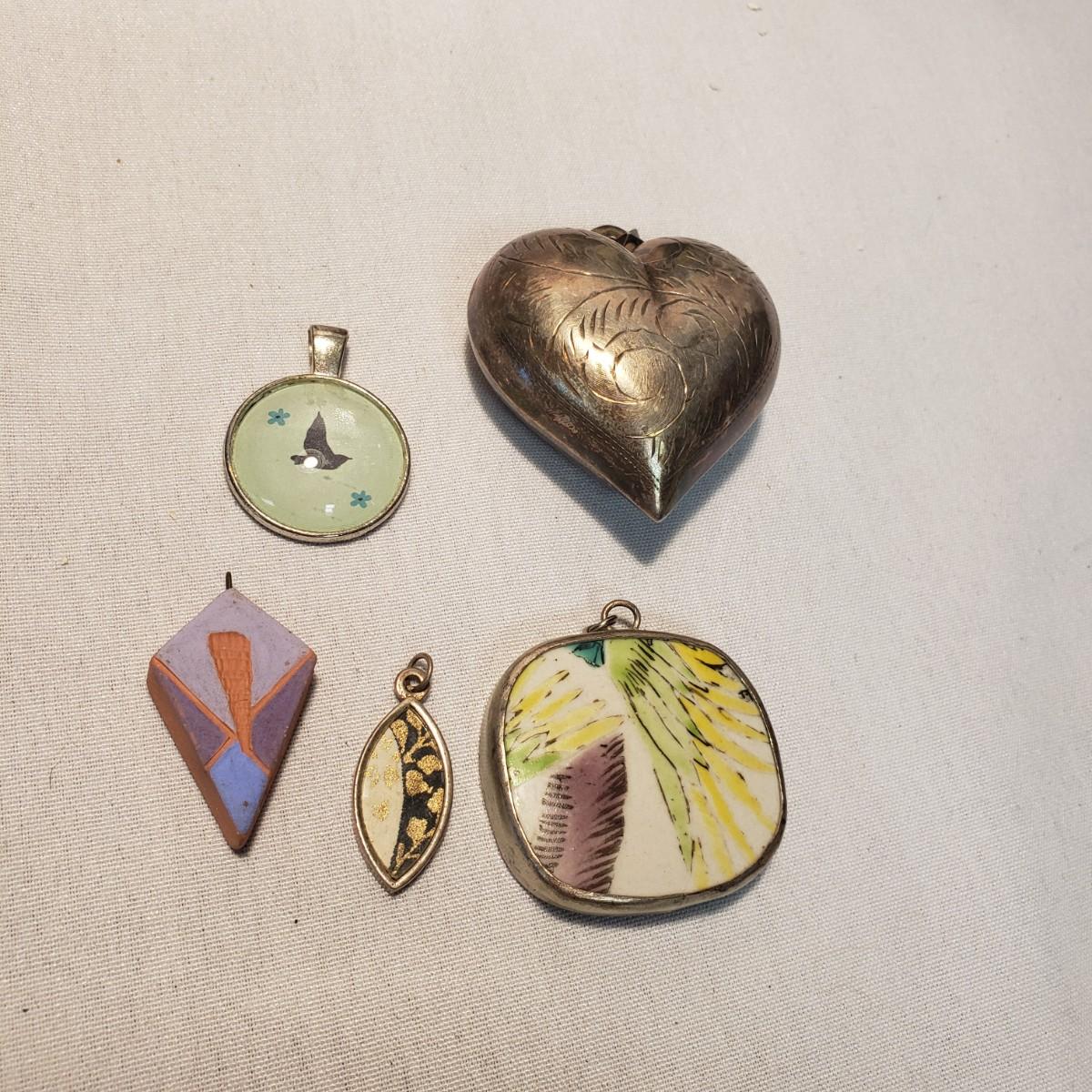 This artisan jewelry lot features pins, pendants and necklaces ready for you to feel fancy! All known markings were photographed. The UU pendant is marked pewter. Some of artists have marked their craftsmanship, see pictures. The necklaces could be used in exchanging out pendants!
