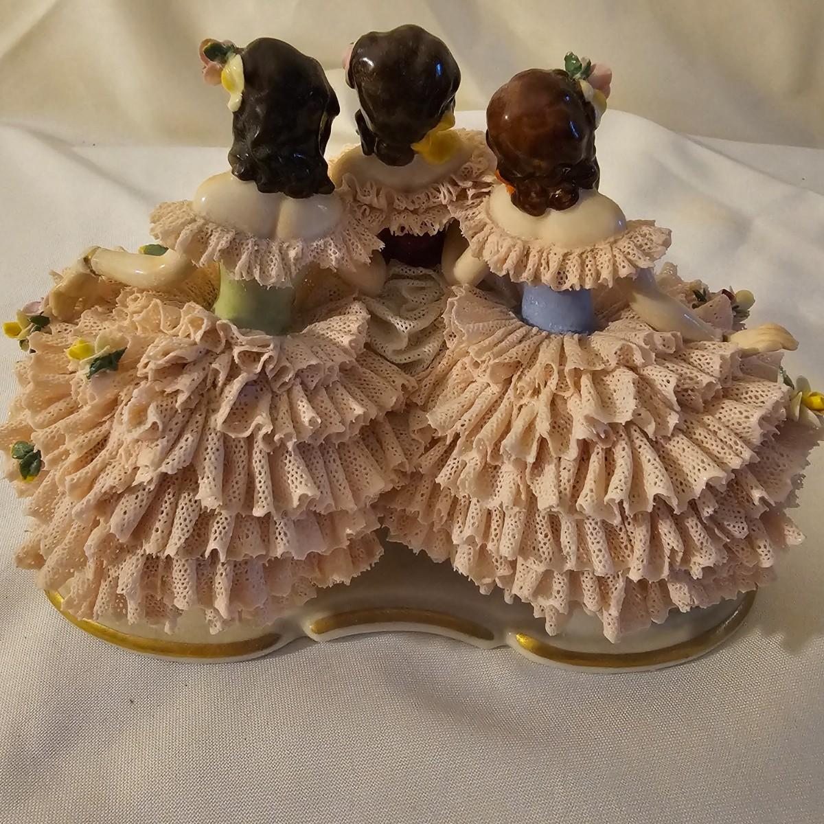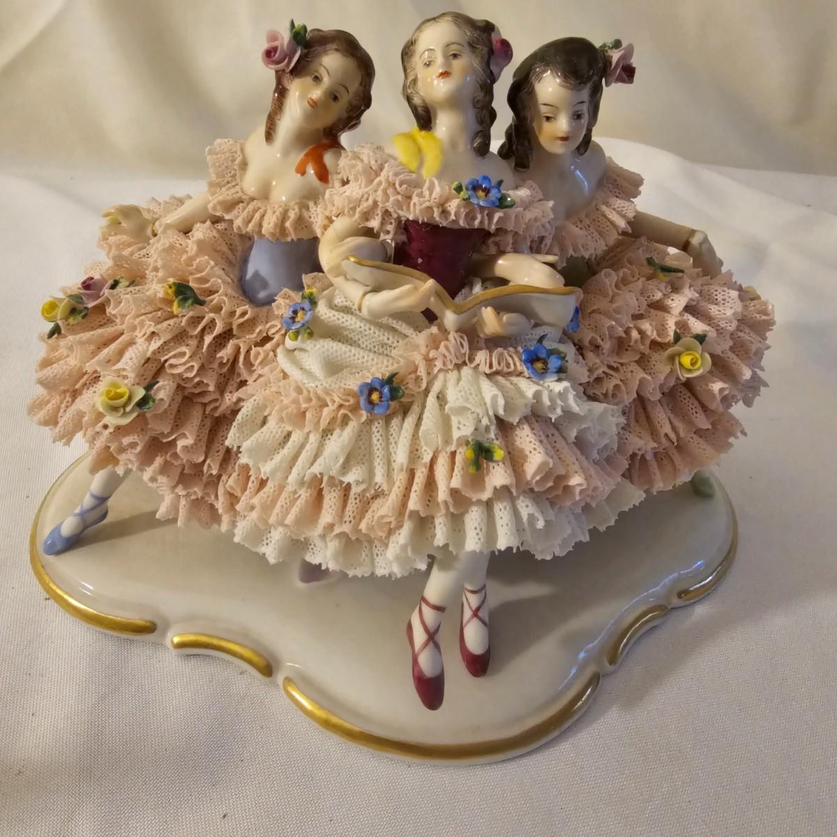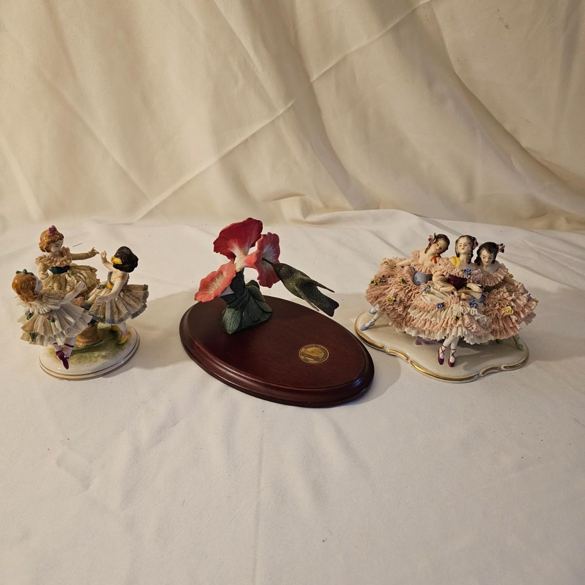 You'll find a lot of three finely detailed figures that include two sets of ballerinas with what appears to be dresden lace and a hummingbird commemorative plaque. The lovely ladies have ruffled skirts and finely painted features. They appear to have Muller Volkstedt marks. The smaller round base piece 5" D x 5"H. The oval item is 7" x 5" x 5"H. The hummingbird is a 25th anniversary National Wild Turkey Foundation issue, measures 9.5" x 6" x 6"H. See photos for details. Shipping available.