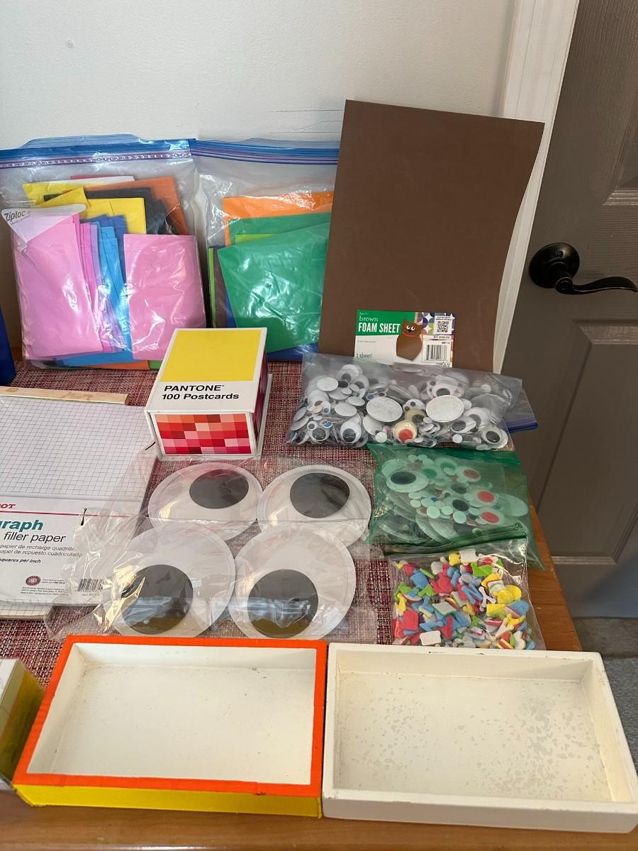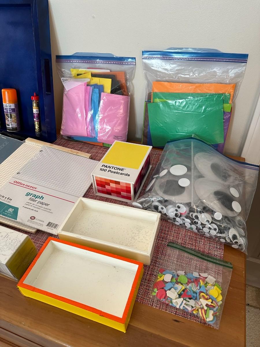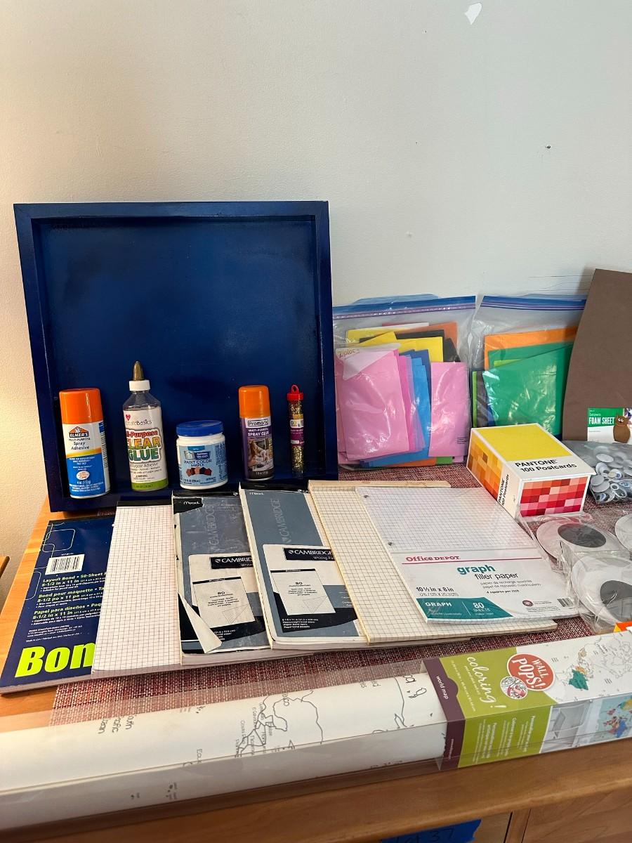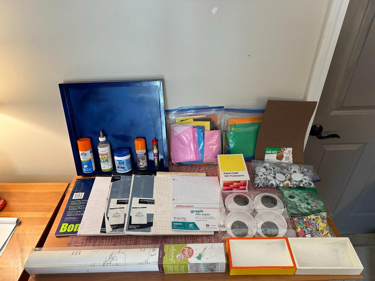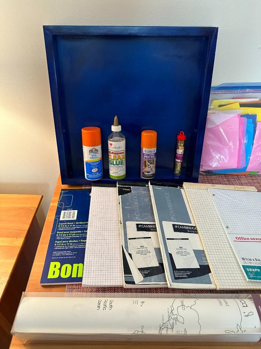 Blue 16x16 tray, Spay adhesive, clear & spray glue, glitter, foam, bag of googly eyes, foam letter, pantone cards, 4"x8" trays, graph paper, wall pops world map coloring peel and stick art