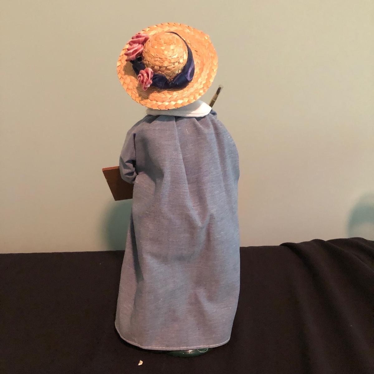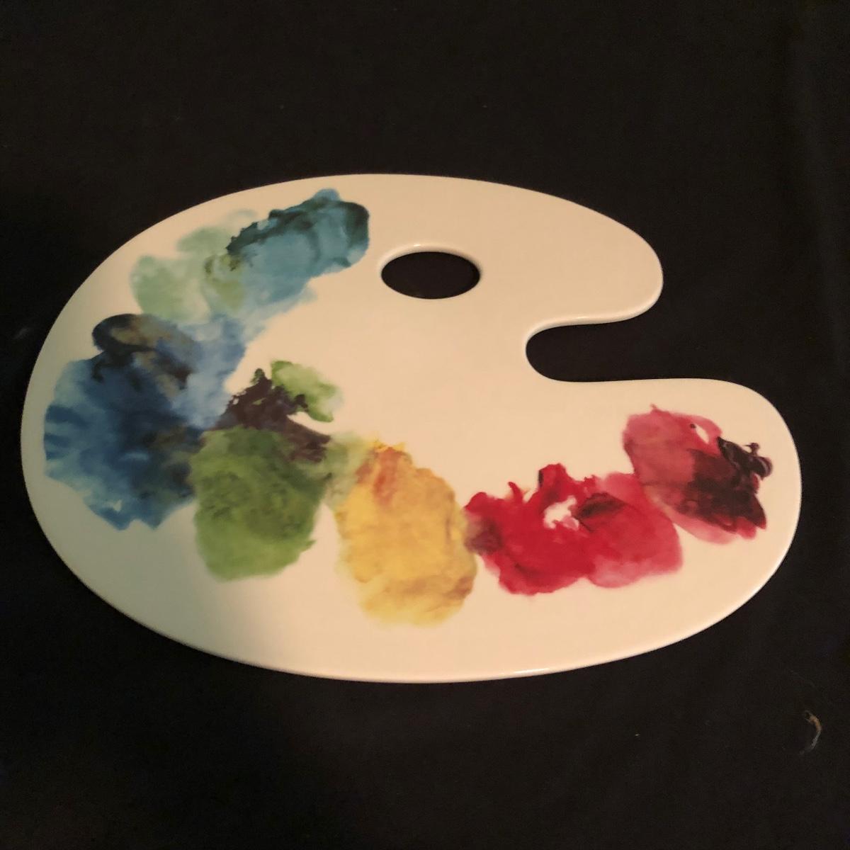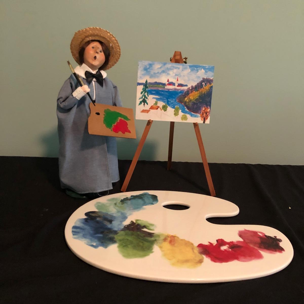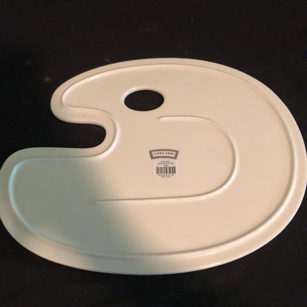 Lot includes Fishs Eddy artist palette tray, artist doll and a miniature wooden easel and artwork. Palette measures 11.75” x 15”.