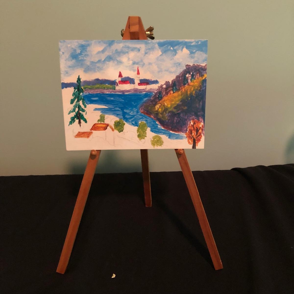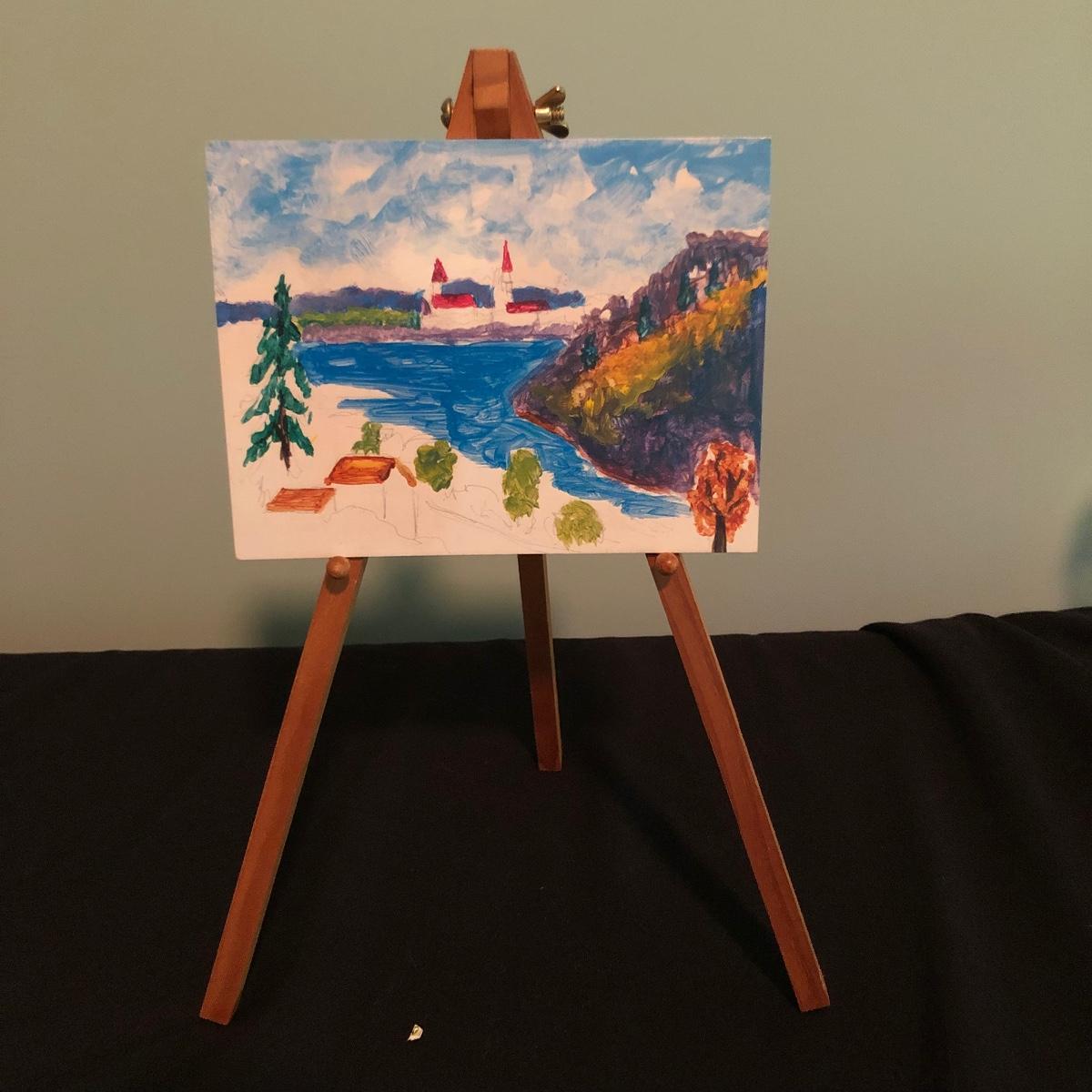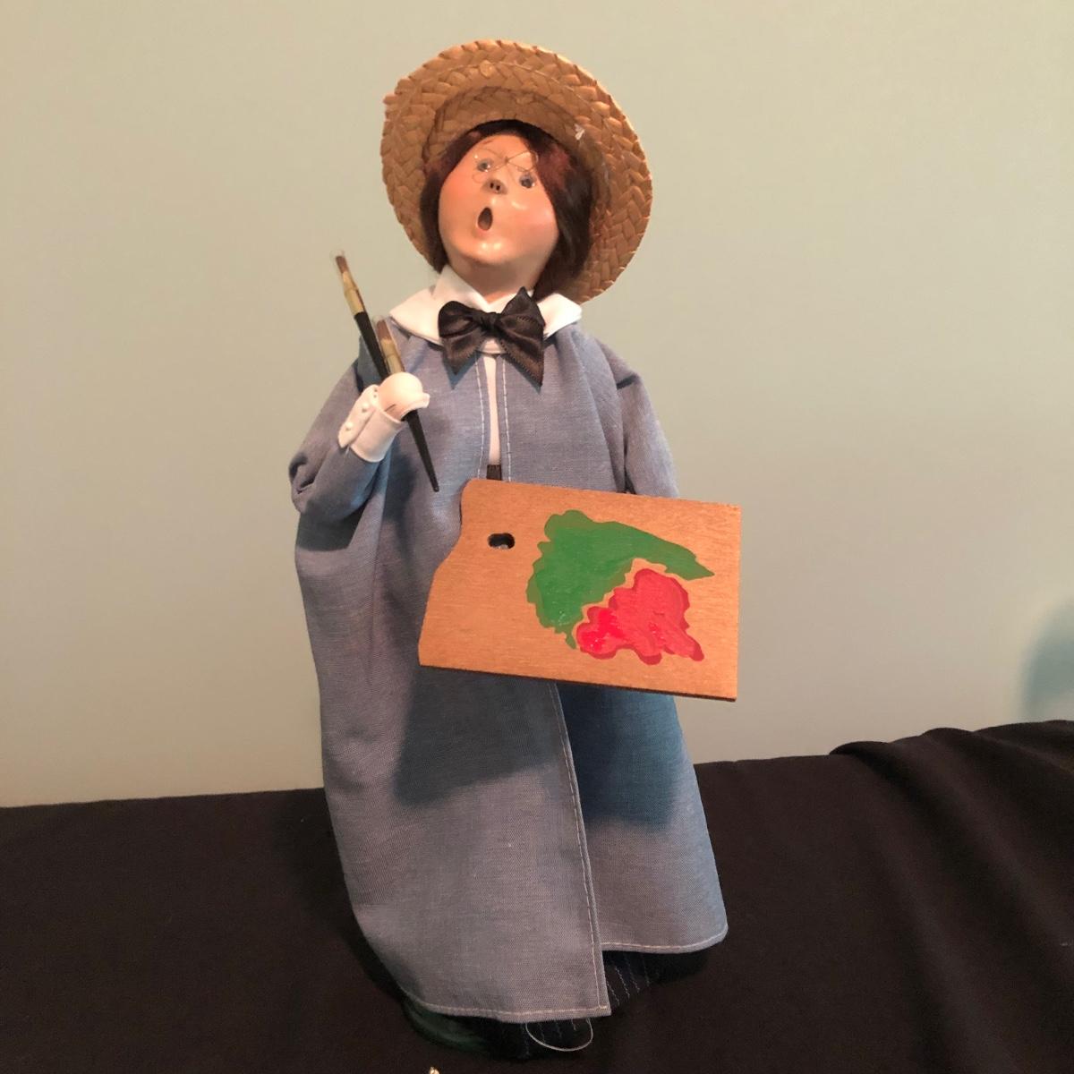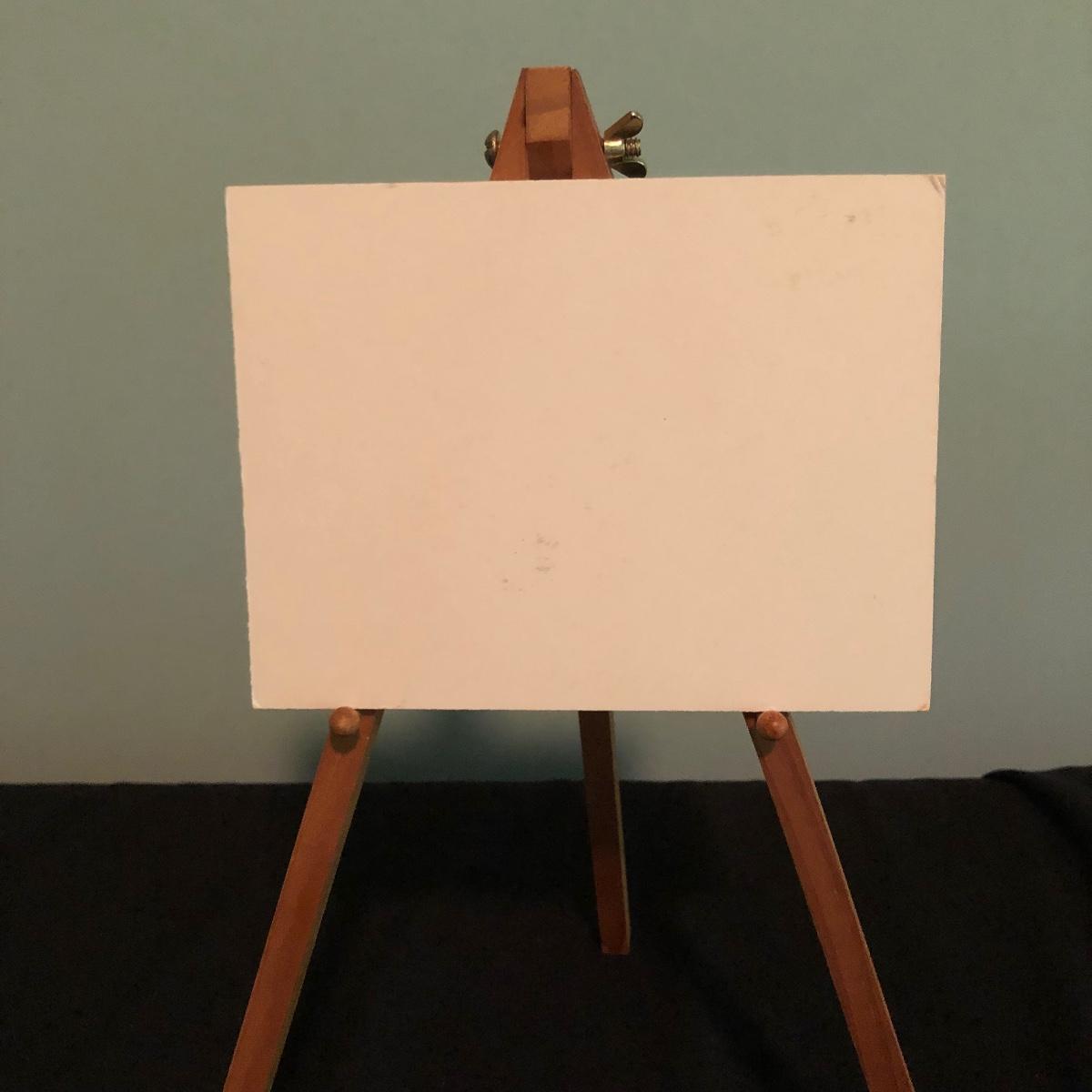 Lot includes Fishs Eddy artist palette tray, artist doll and a miniature wooden easel and artwork. Palette measures 11.75” x 15”.