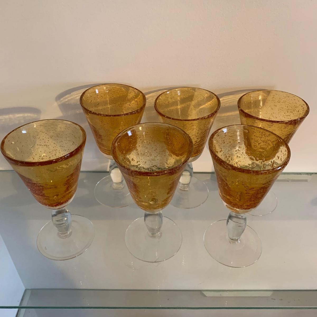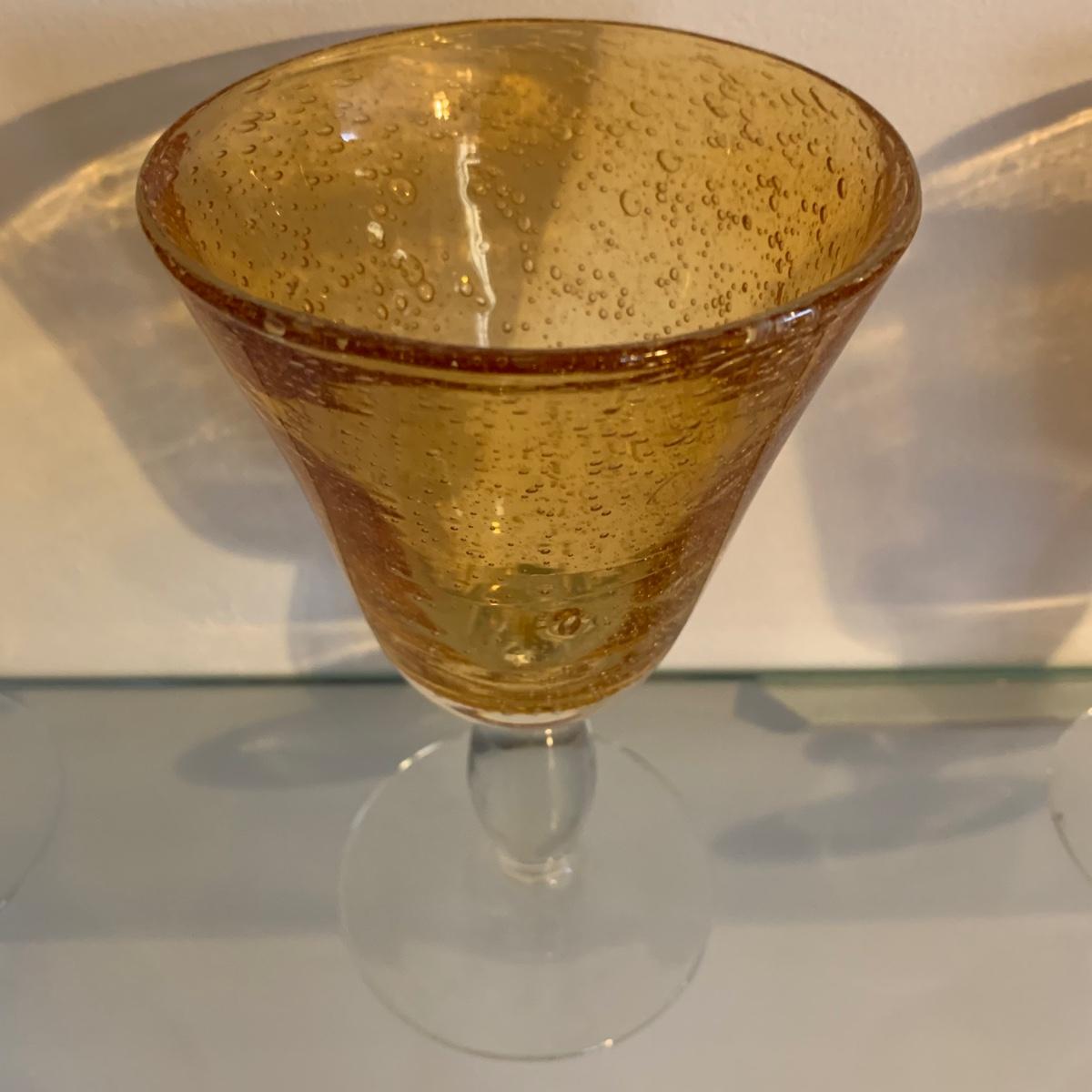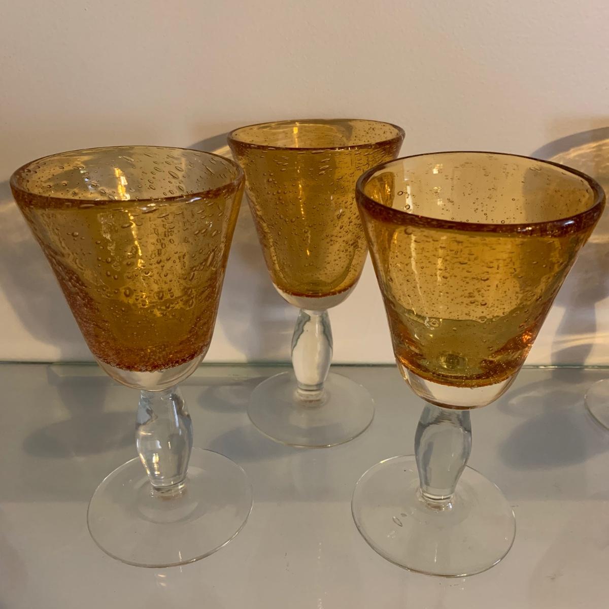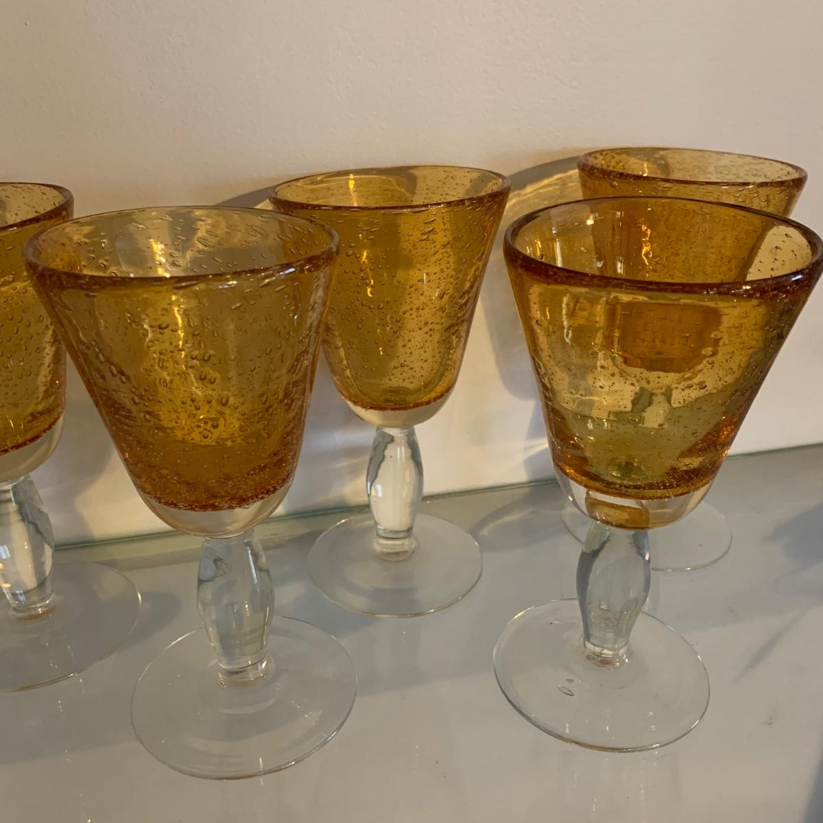 Eight hand blown glass goblets in amber by Artland Iris. Goblets measure approximately, 4”D x 8”H. Each glass is a bit different due to being crafted by hand. Shipping available. Shipping can be costly. We suggest contacting our preferred local shipping provider, Postage Express, with dimensions and getting an estimate before bidding: (828) 670-5501 or shipping@postageexressnc.com
