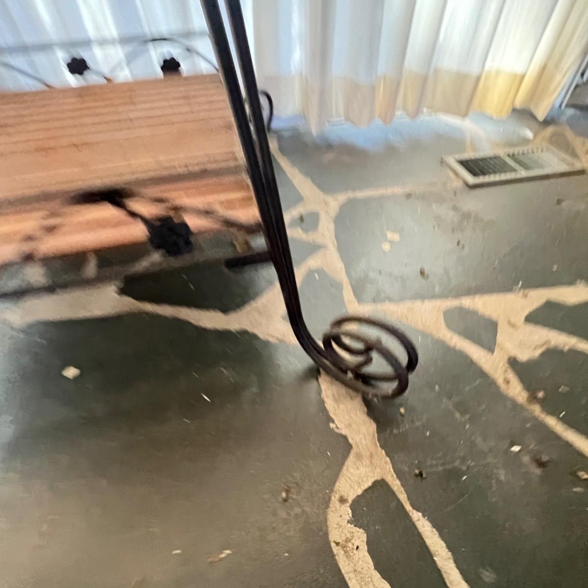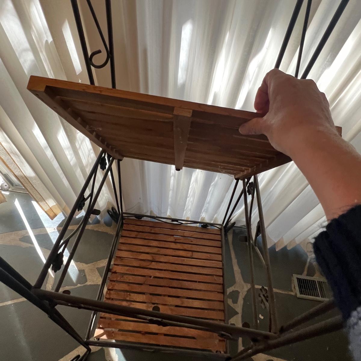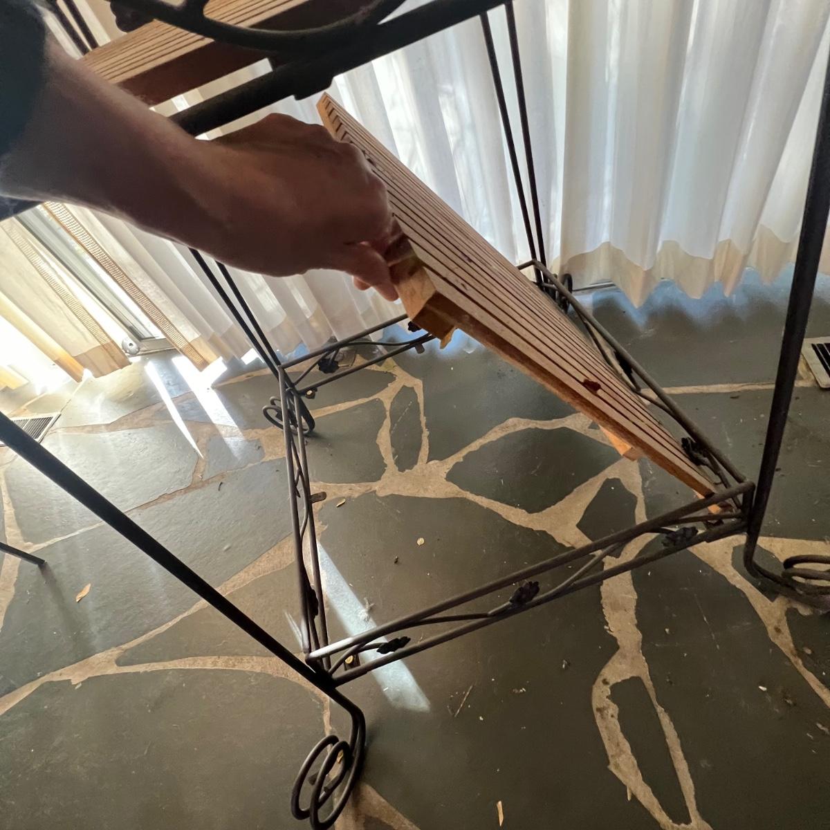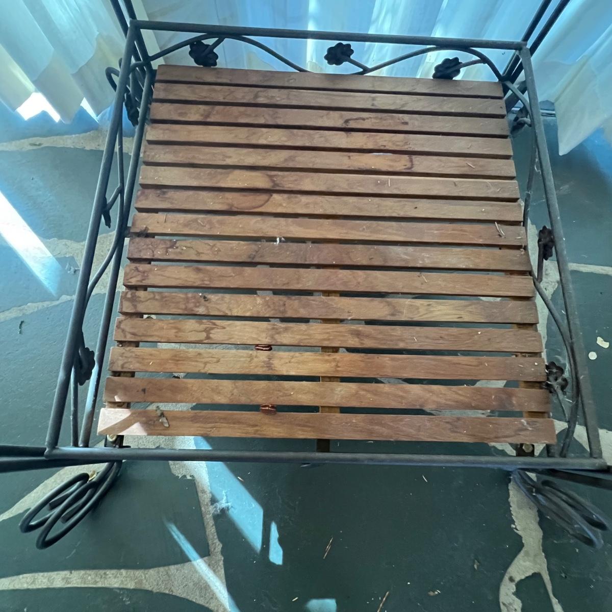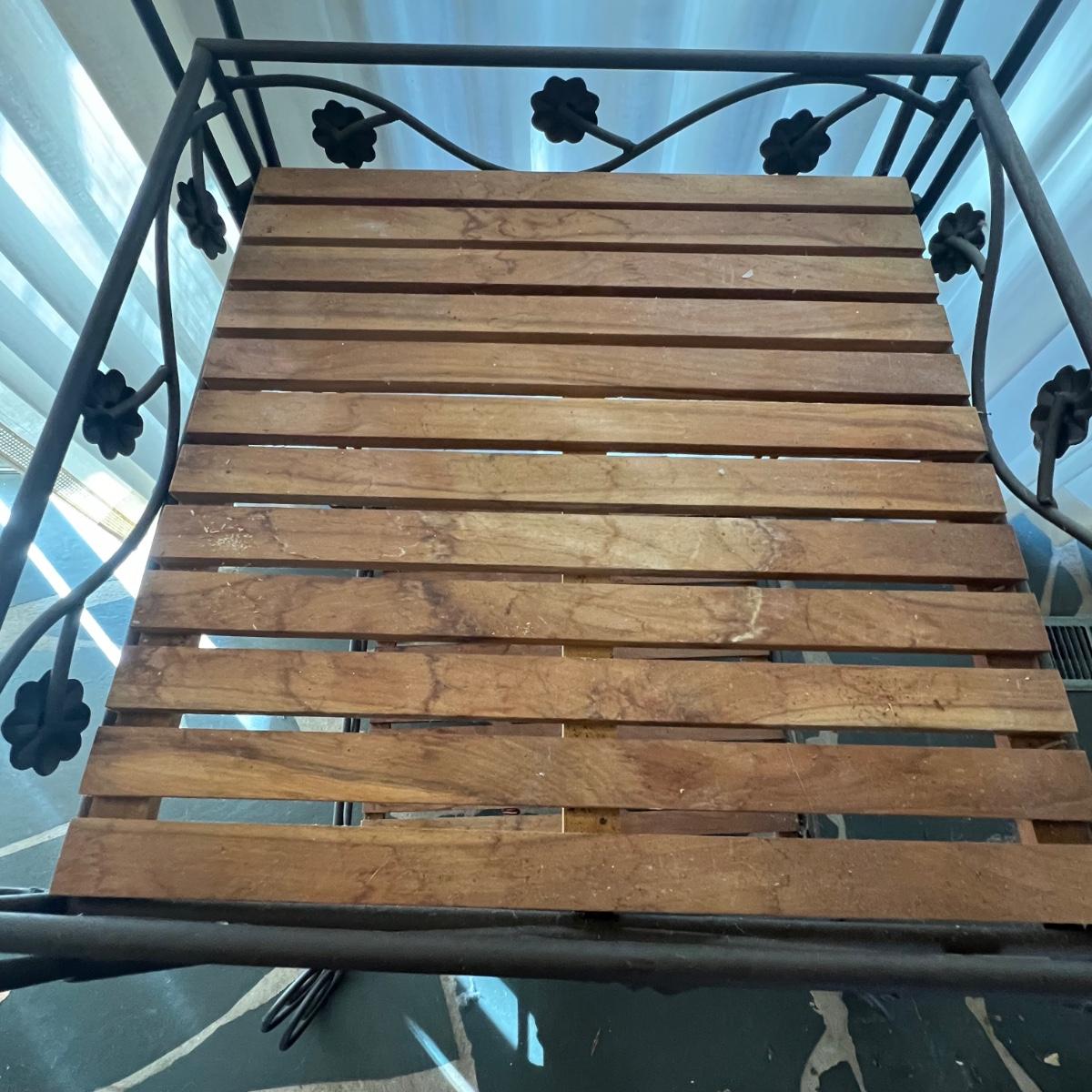 This three tier metal stand has shelves that appear to be teak; there are some light stains and watermarks, see images. Frame is metal.