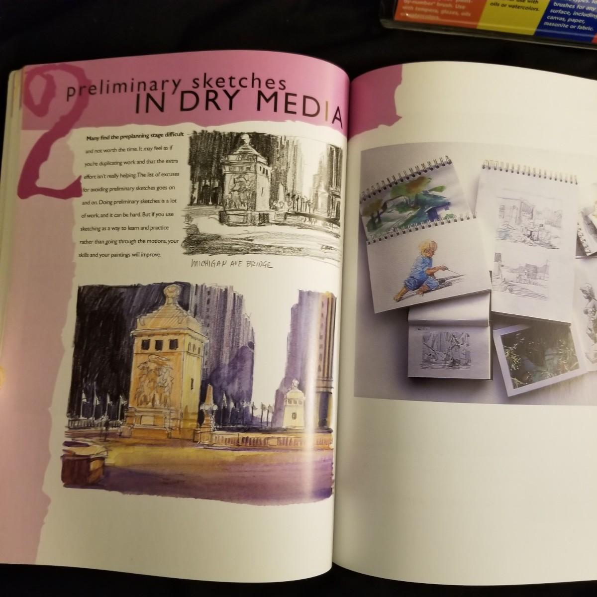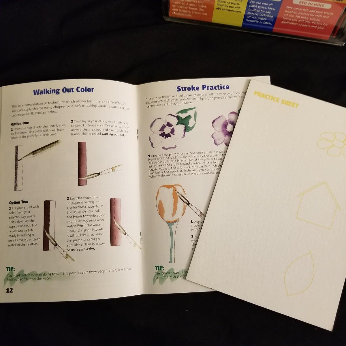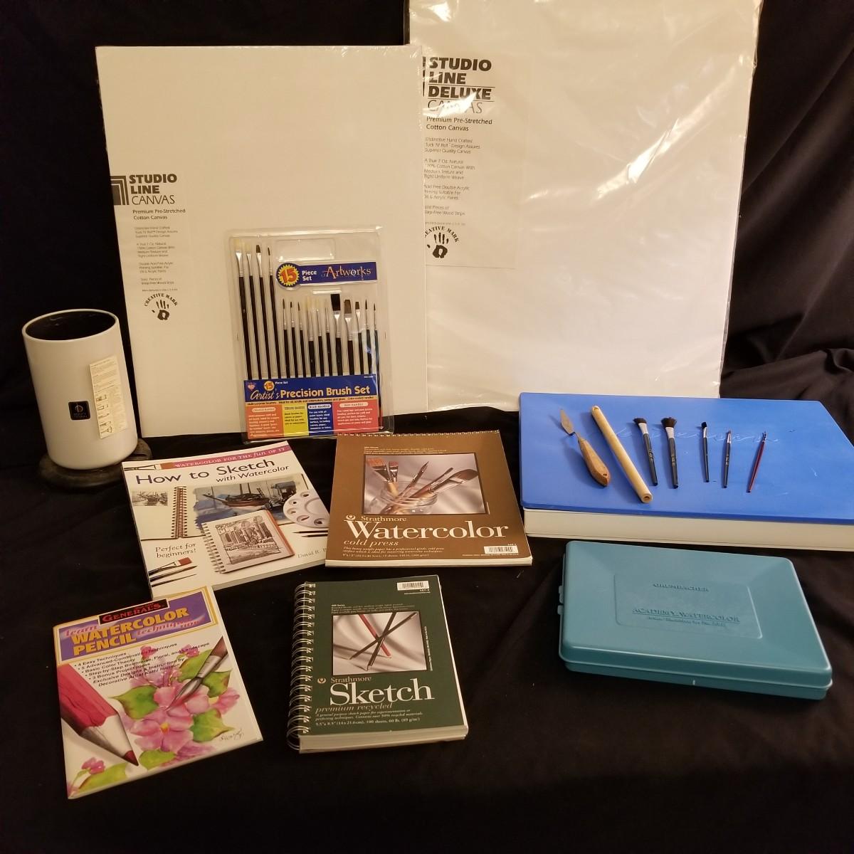 Books, brushes, canvas, pads for art or painting. One 18" x24" canvas, one 16"x20" canvas. Grumbacher watercolor set, several different brushes, sketchpads and instruction books. White cylinder is for holding brushes and tools. See photos for details. Shipping available.