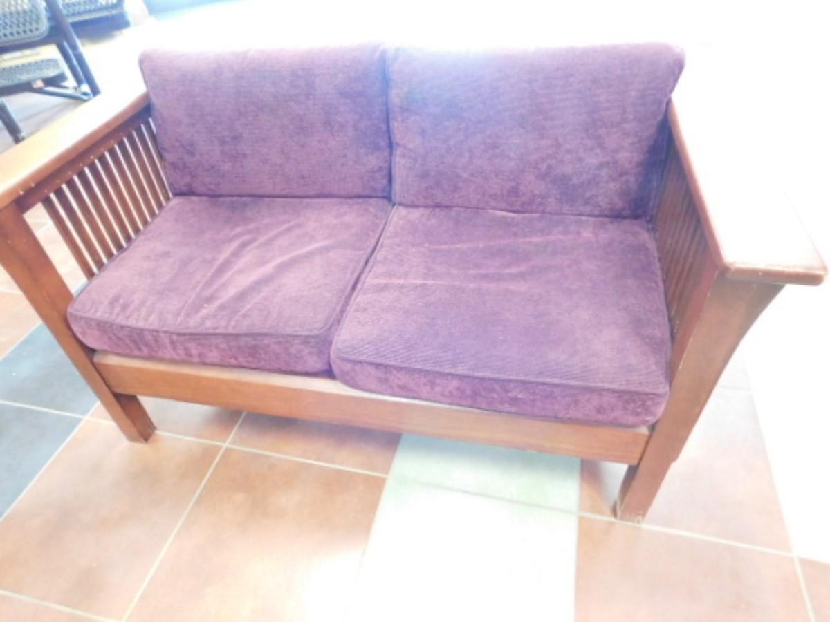Arts and Crafts Solid Wood Frame Cushioned Love Seat by St. Timothy Choice B Expect some wear or scratches to finish. Shipping option available via freight or local mover at Buyer's expense. Buyer must have all shipping scheduled within the stated dates and times of pickup. Recommended local mover is Beaty Bros. Moving 828-201-2982