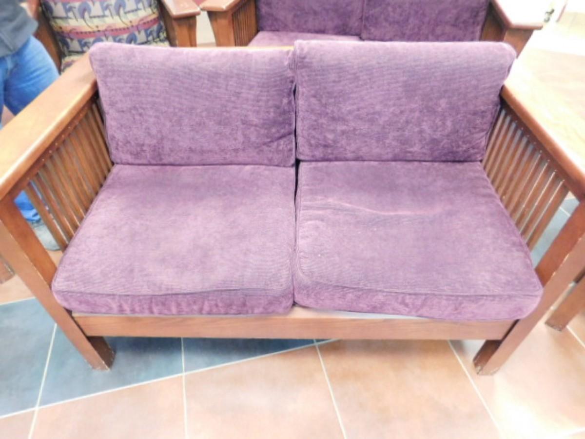Arts and Crafts Solid Wood Frame Cushioned Love Seat by St. Timothy Choice C Expect some wear or scratches to finish. Shipping option available via freight or local mover at Buyer's expense. Buyer must have all shipping scheduled within the stated dates and times of pickup. Recommended local mover is Beaty Bros. Moving 828-201-2982
