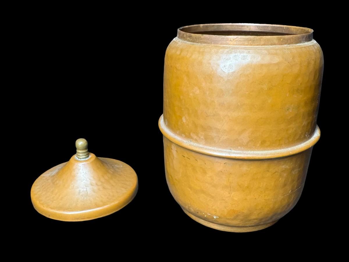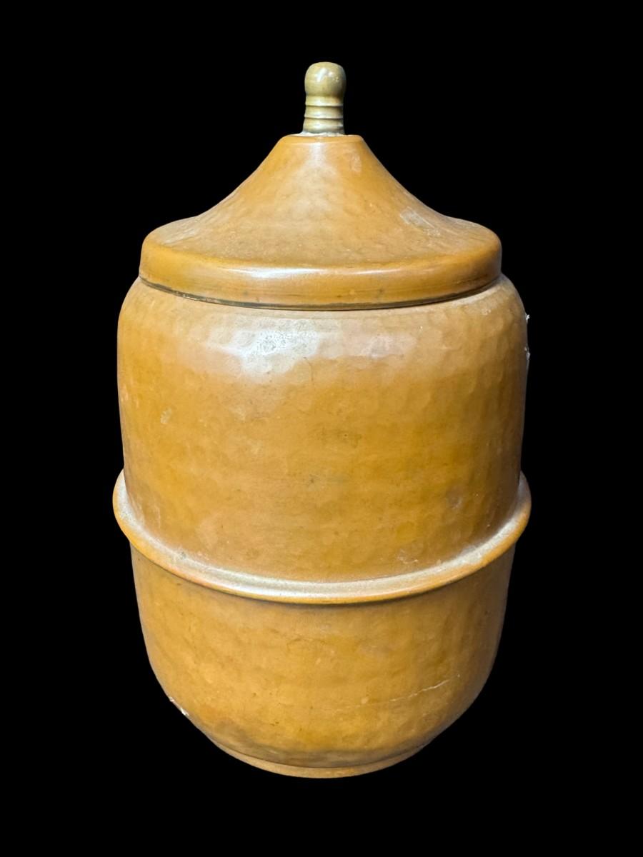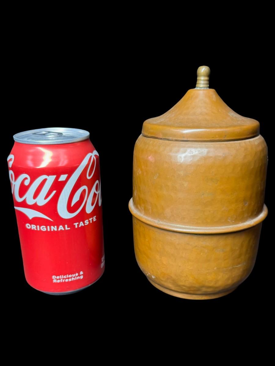 This tea caddy is constructed of hand hammered copper, and has a beautiful patina. There are no dents. Measurement: 7”H x 4.25”W. Pre-auction estimate: $25-$50. [BK]