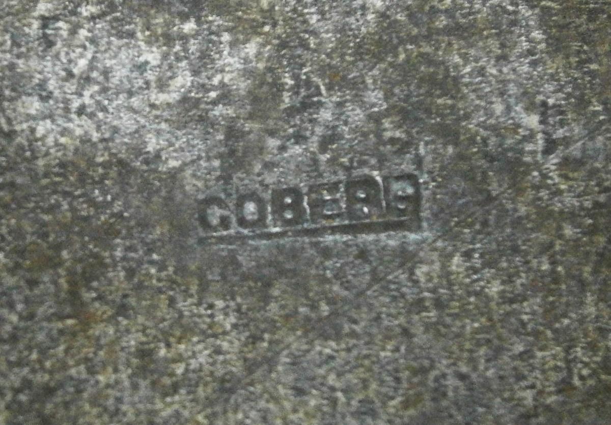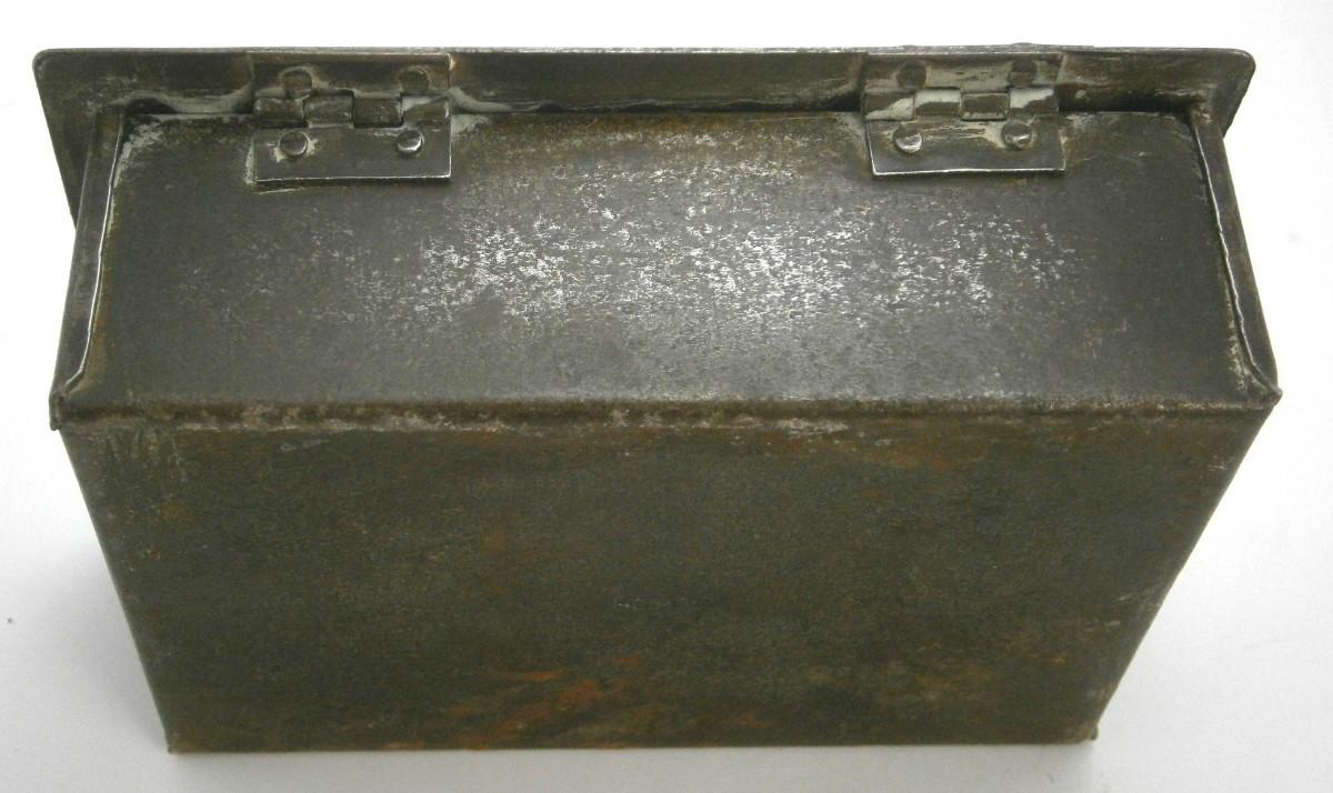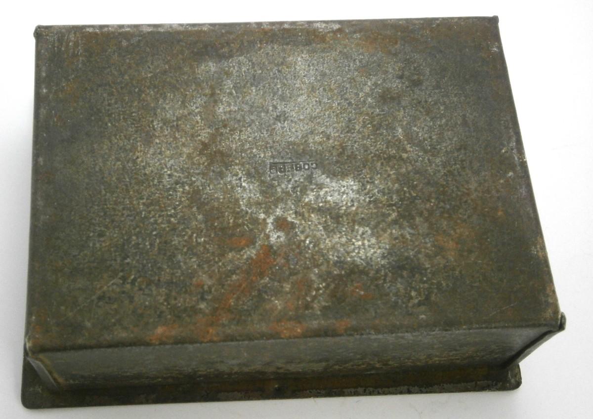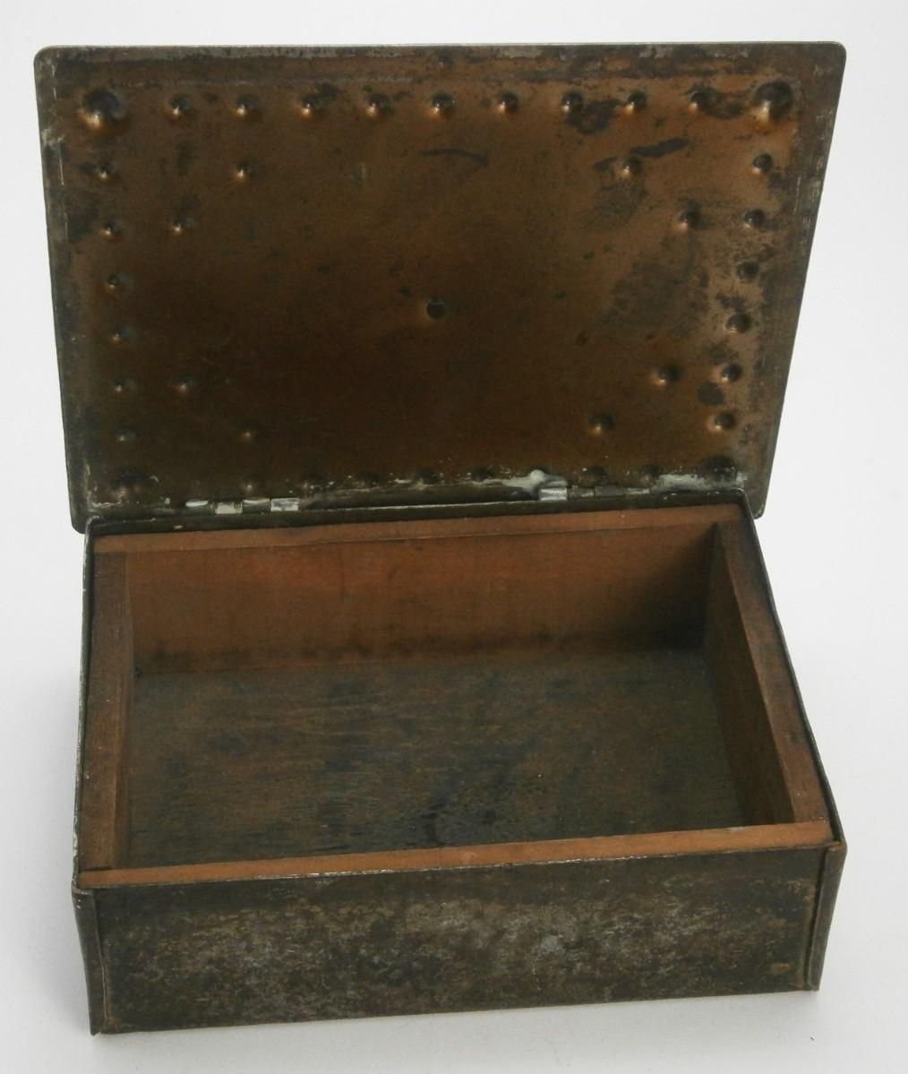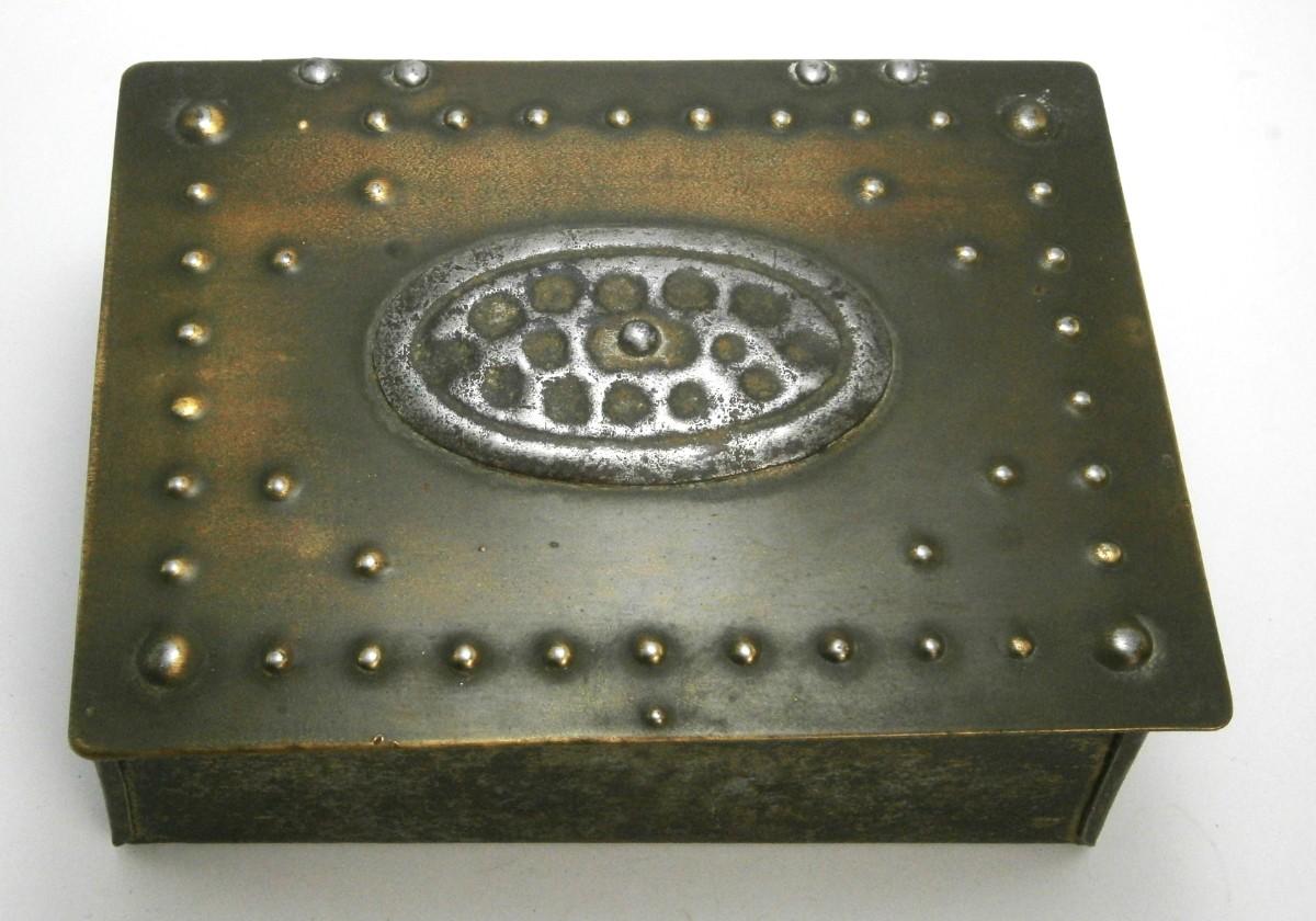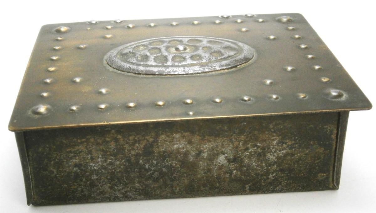 Arts & Crafts Dresser Box from the early 1900's, 4 3/4 x 3 5/8 (lid), steel with brass lid with applied steel decoration, wood lining, signed, probably made in Germany.