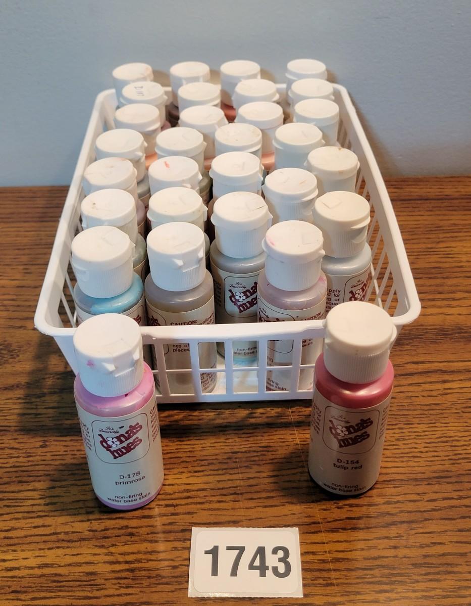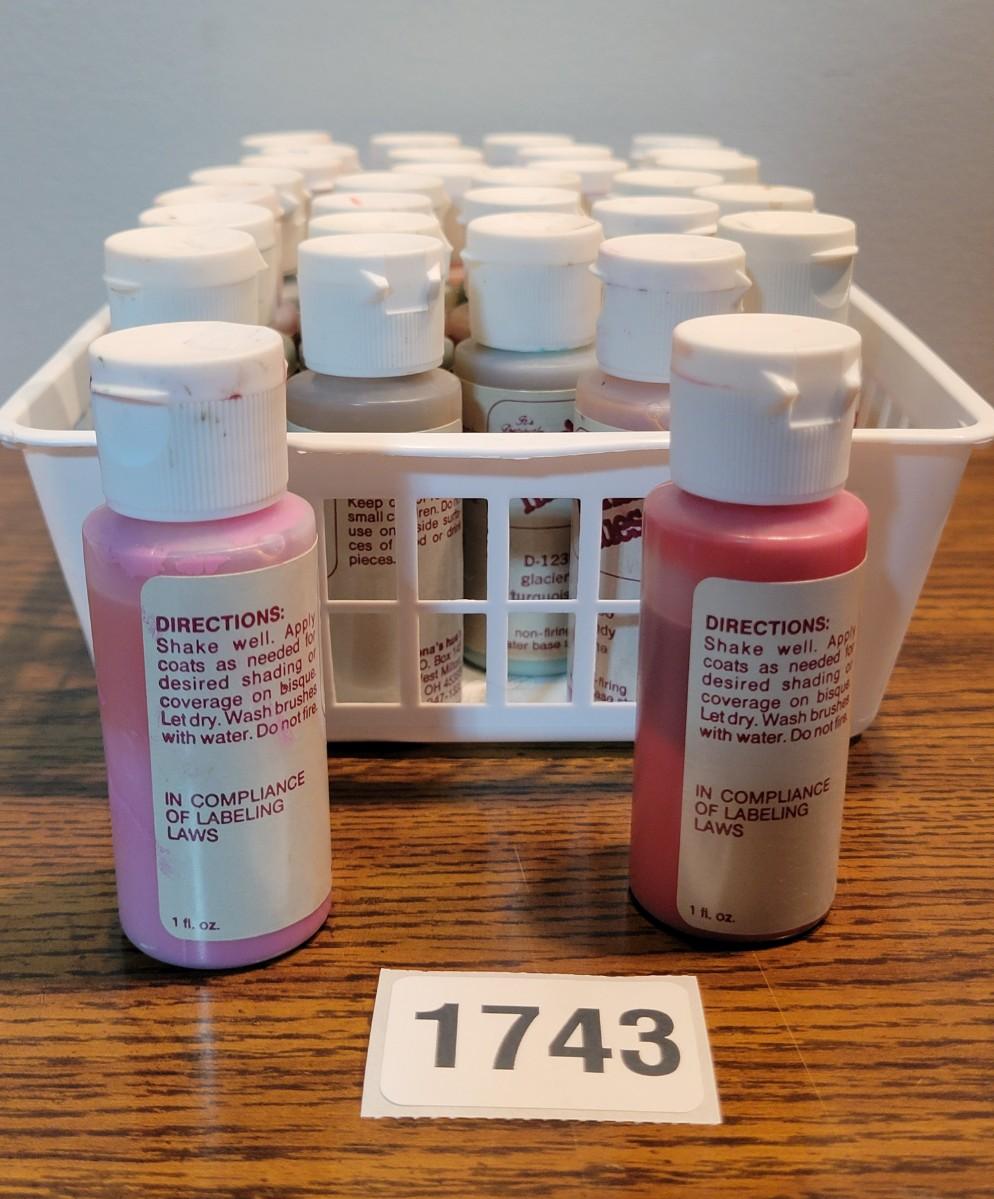 30 1oz bottles of assorted ceramic crafting paints. All bottles are better than half full. Paints are not dried out