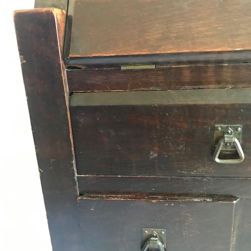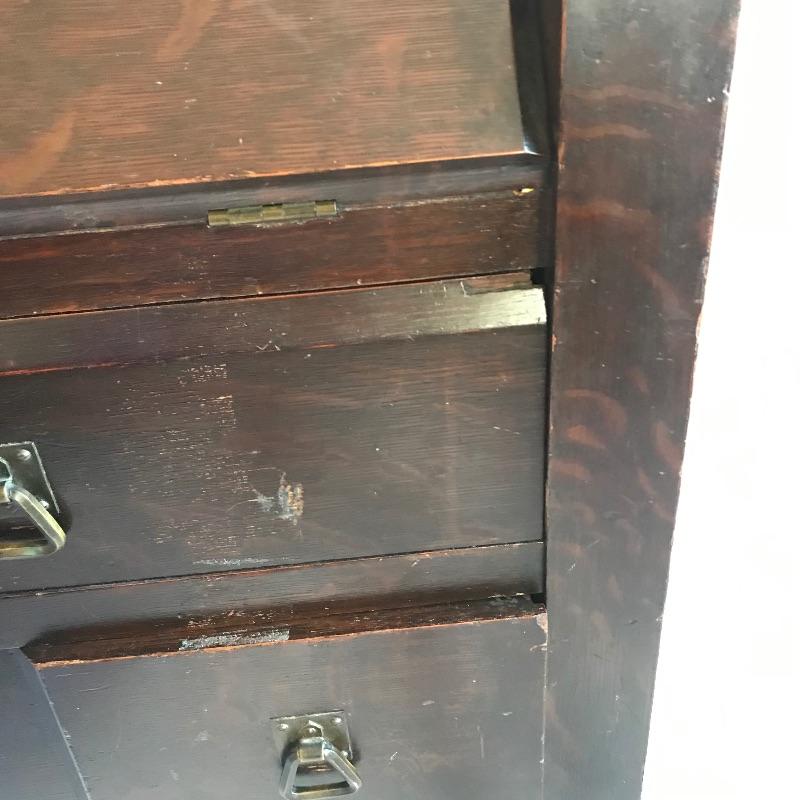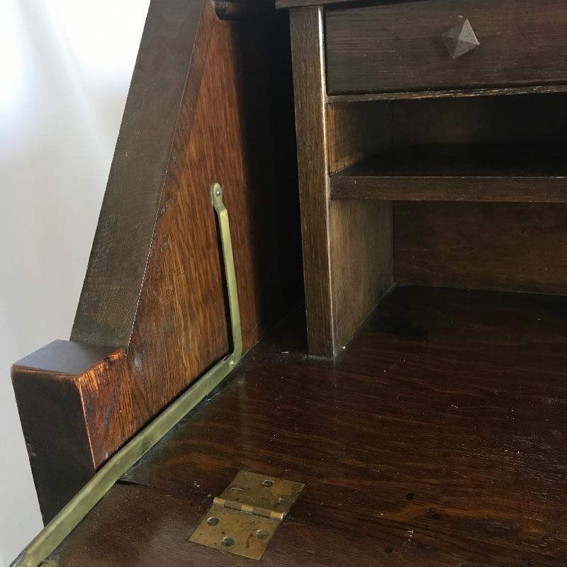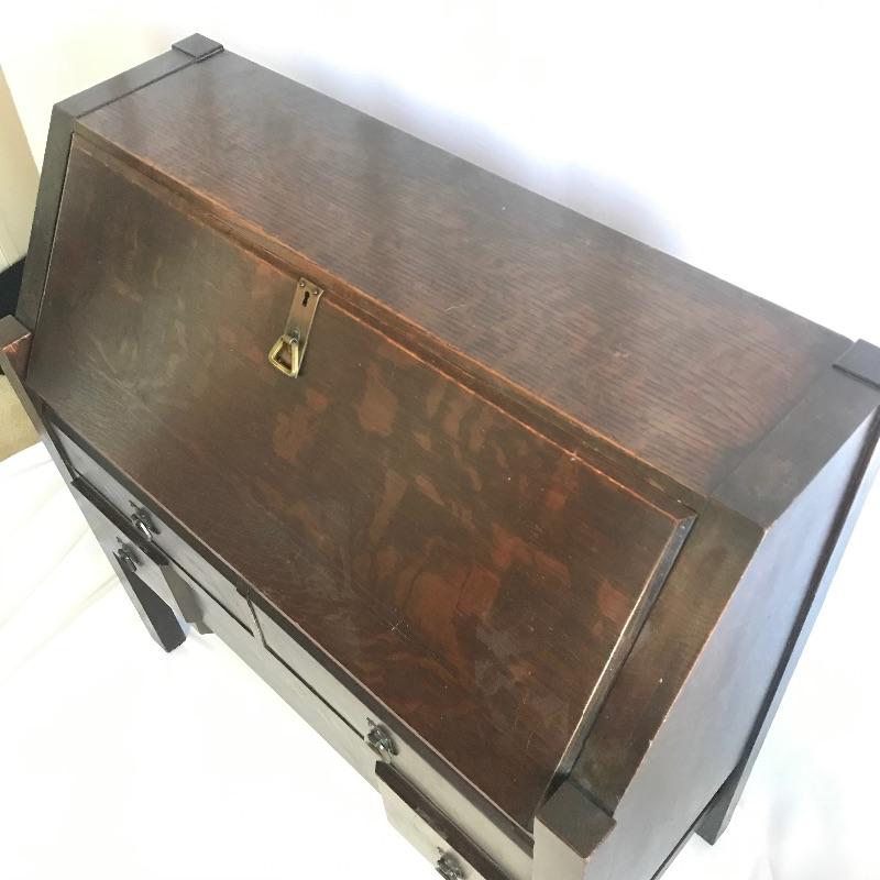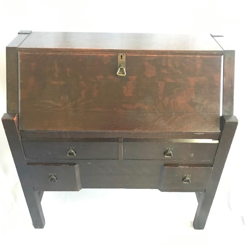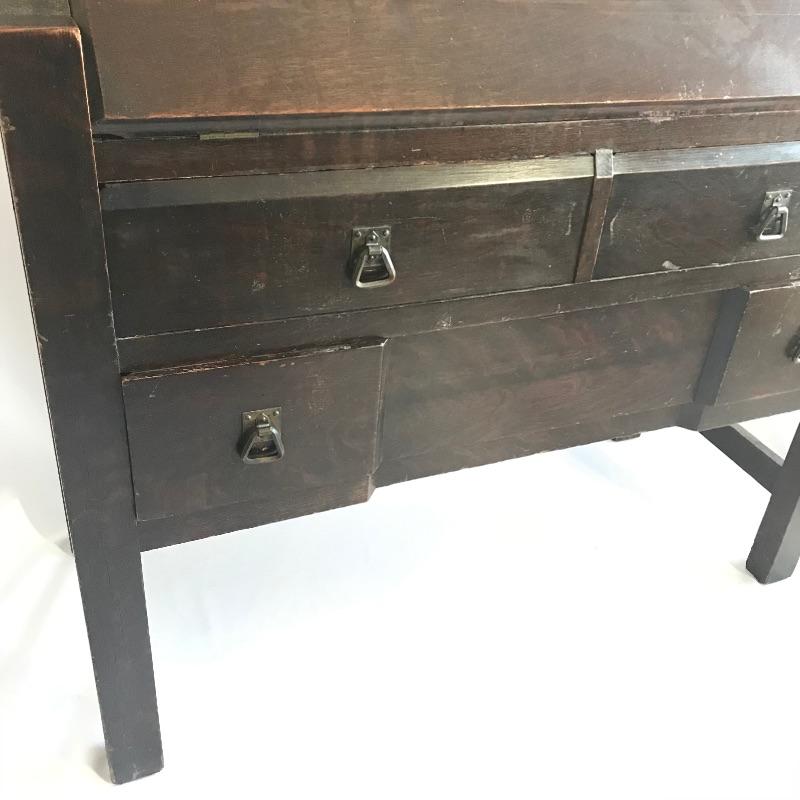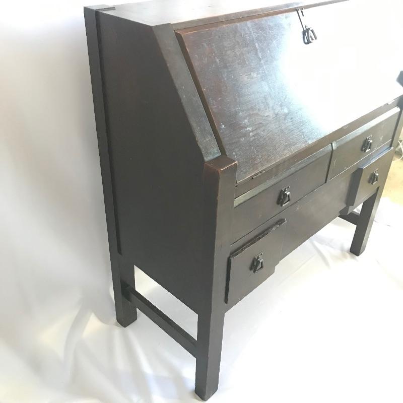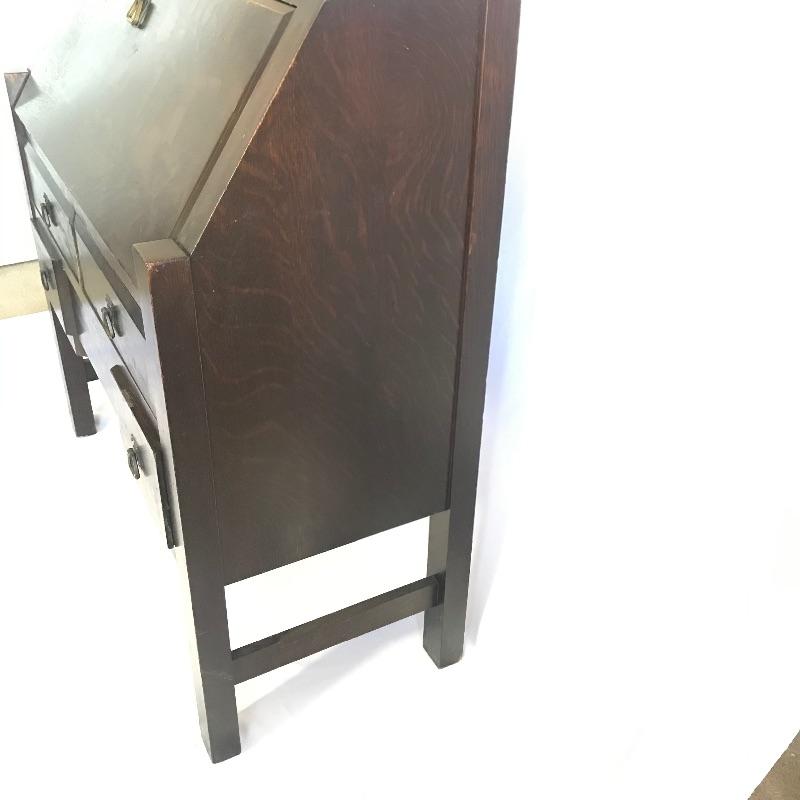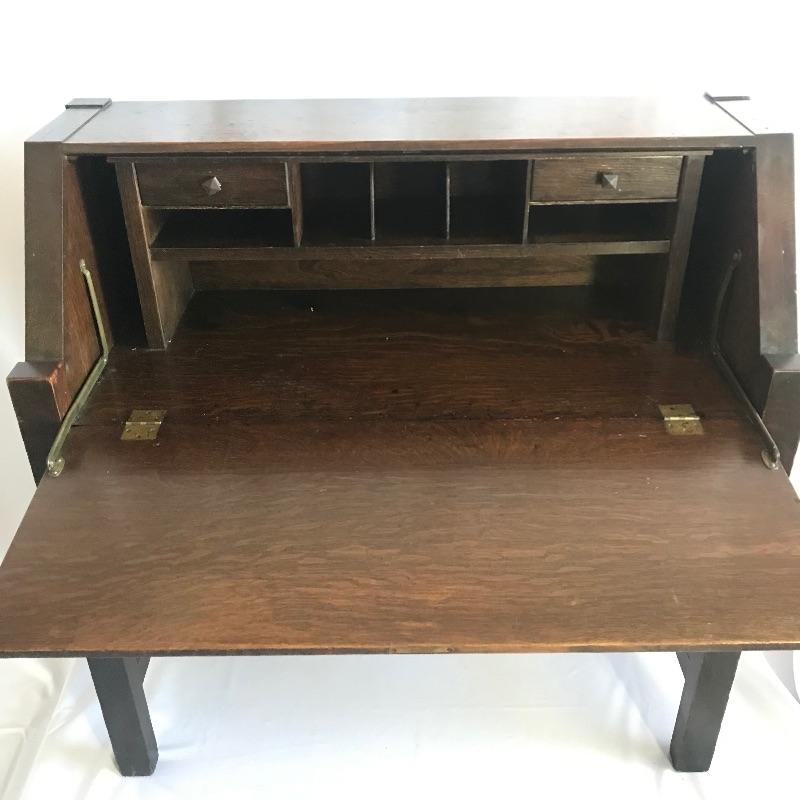 Arts & Crafts large secretary desk. Desk has three dovetail drawers underneath fold down desk top with two small dovetail drawers and cubbies when you open desk. Another great example of stellar workmanship with this handsome desk. Executor states that this is a Stickley Brothers piece. No markings found. Item measures 17” x 40” x 40.25” when closed and 30.75” x 40” x 40.25” when open. Key is missing. this is a substantial piece that is located on the second floor. Please bring help to load item.