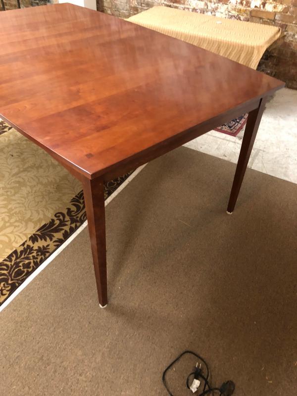 Beautiful hand made table out of solid cherry wood by Hardin Furniture. Measures 66" by 42" with 2 additional 16" leaves that have their own storage bags.