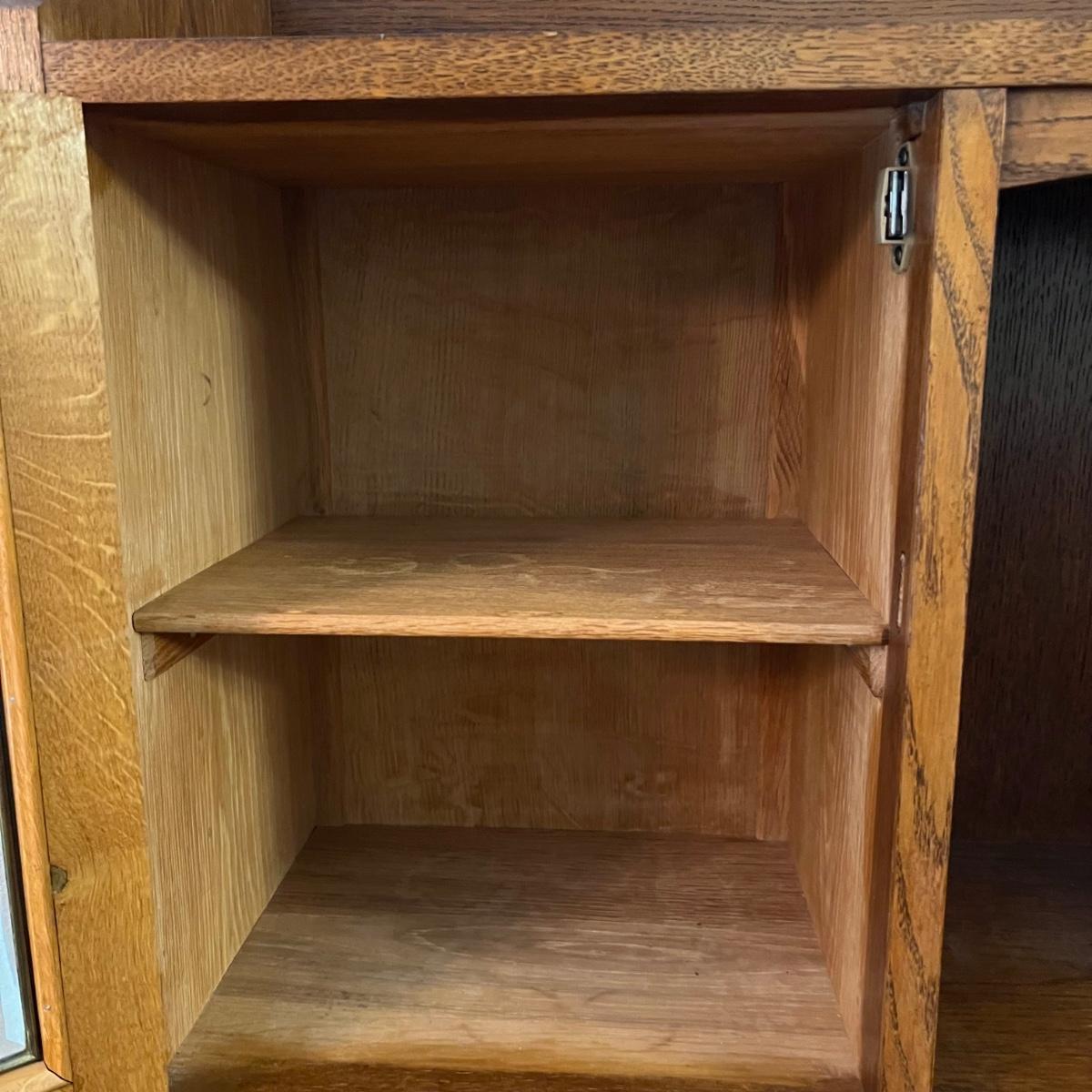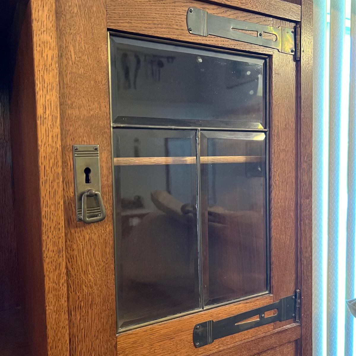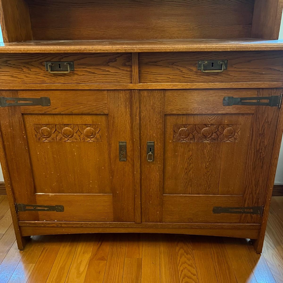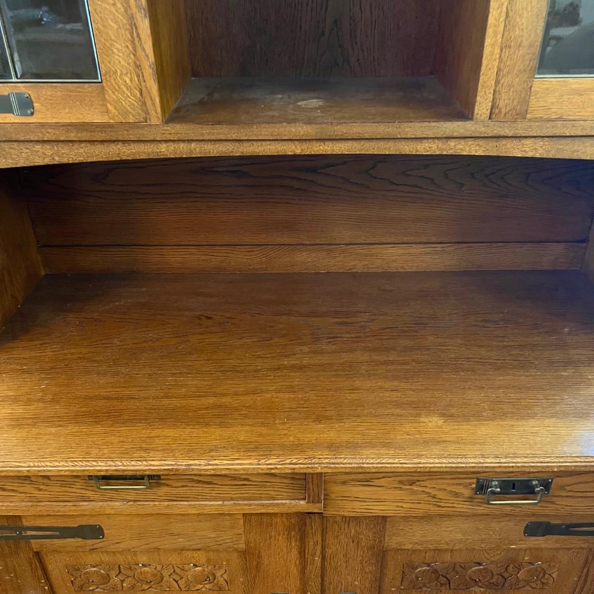 This beautiful hutch has beveled glass panels in the top two doors that flank an open cabinet. The lower section has two doors with carved details and brass hardware that open up to a generously sized single shelf cabinet that has two also generously sized dovetailed drawers above. This hutch is solid wood and appears to be possibly tiger oak with pine interior, likely an import. There is no key. Lock is stuck in locked open, ie the lock sticks out, so you do have to close the doors together simultaneously, but they close without any problem, see image.